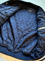 厚手のメルトンウールをベースにキルティングライナーと保温性も兼ね備え、しっかりとした牛革のレザースリーブやフロント&バックサイドにはサガラ刺繍やワッペン.ロゴ文字刺繍などが全体的にデザインされたインパクトのある贅沢な1枚。