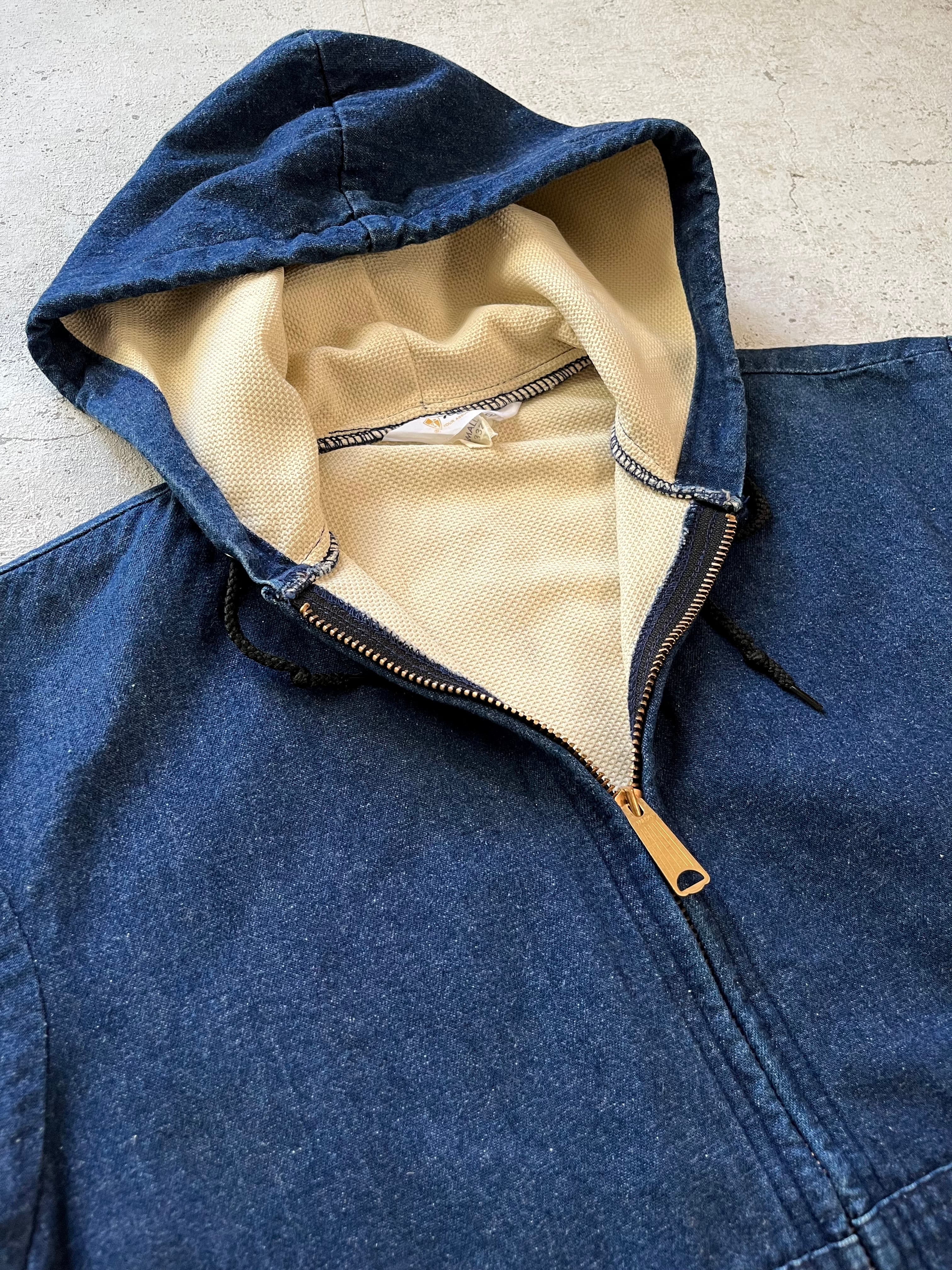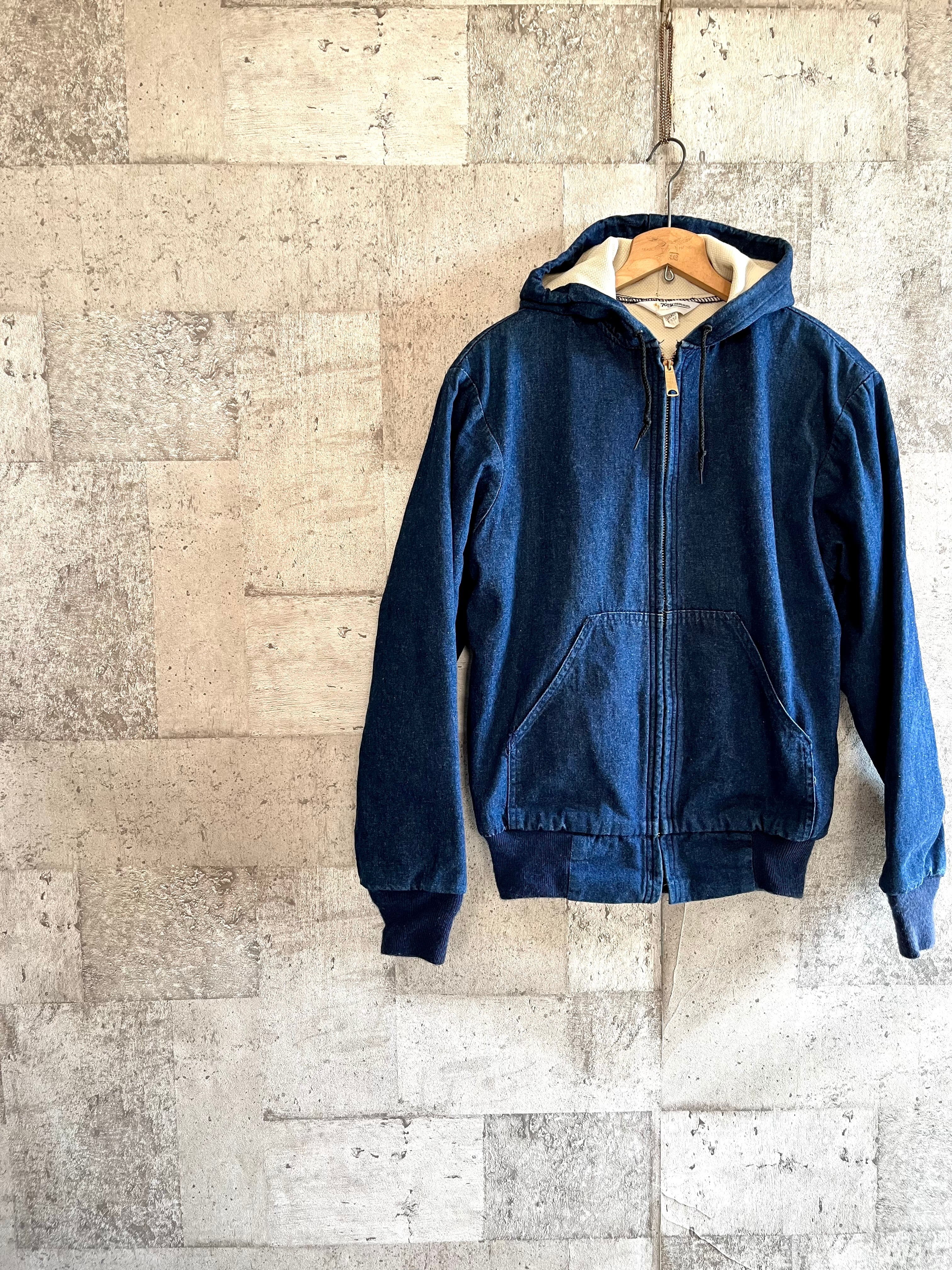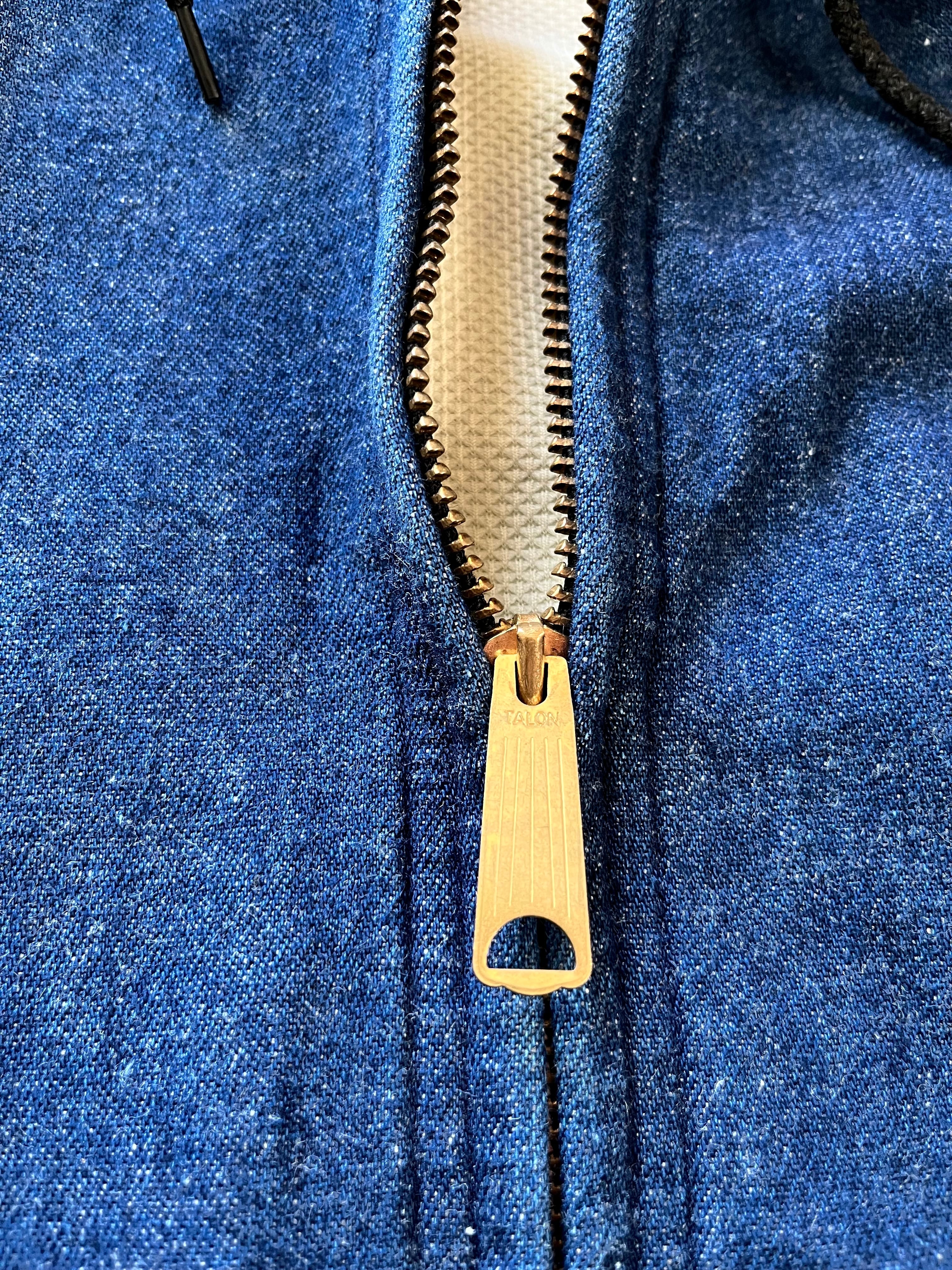 濃紺なオールコットン.インディゴデニムをベースにサーマル張りとなった人気のWフェイス仕様、フロントには大きなデカタロンジップを完備し袖先&裾にはリブ付きと通常のスウェットパーカーをデニムに置き換えたイメージのVINTAGEらしい1枚です。