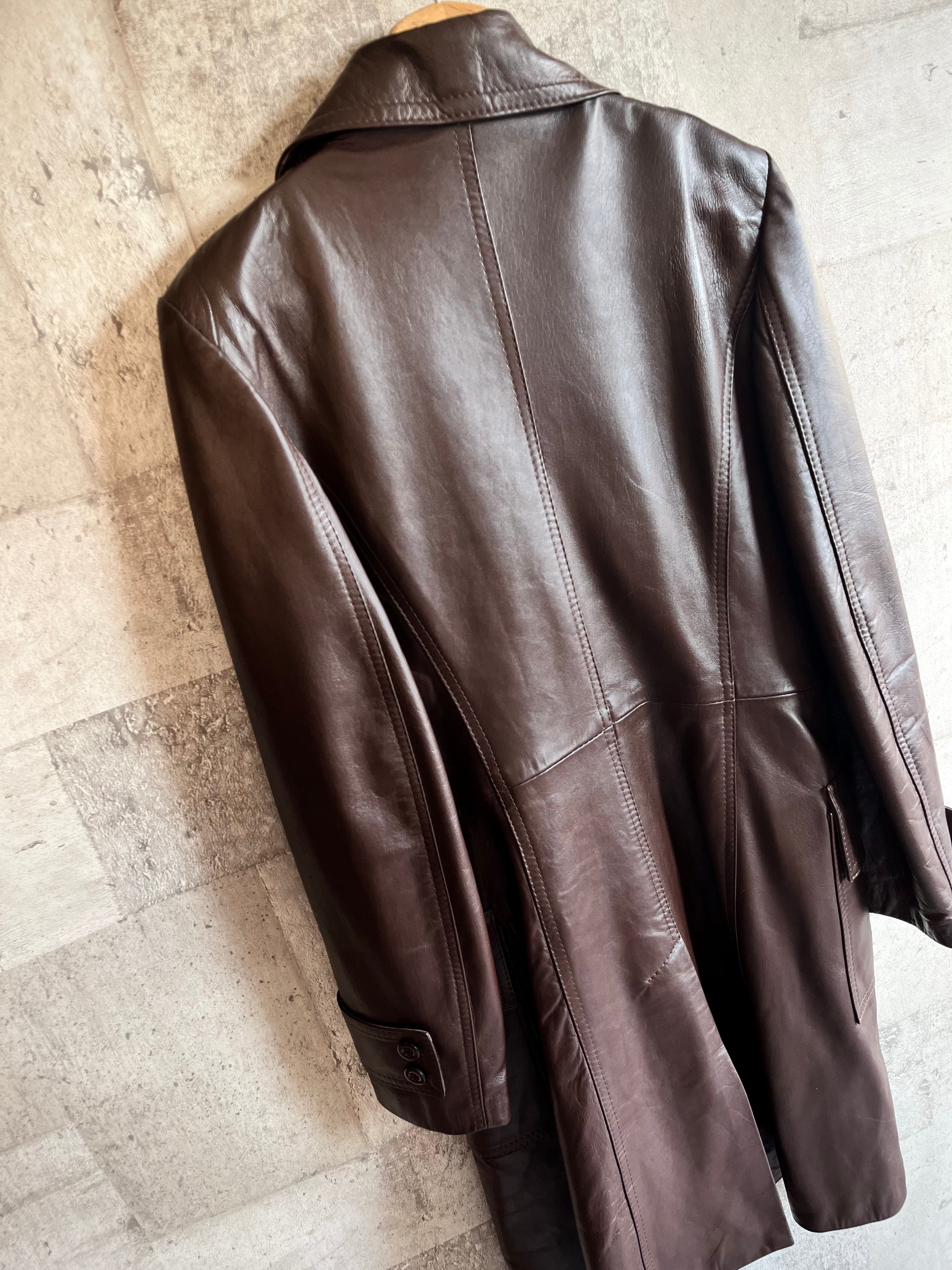 いかにも70年代らしい佇まい、大きめな襟型.ラペルに大きなフラップ付きパッチポケット,フロントのダブルブレスト仕様が特徴的でクラシックな印象の雰囲気抜群なロングレザーコート。