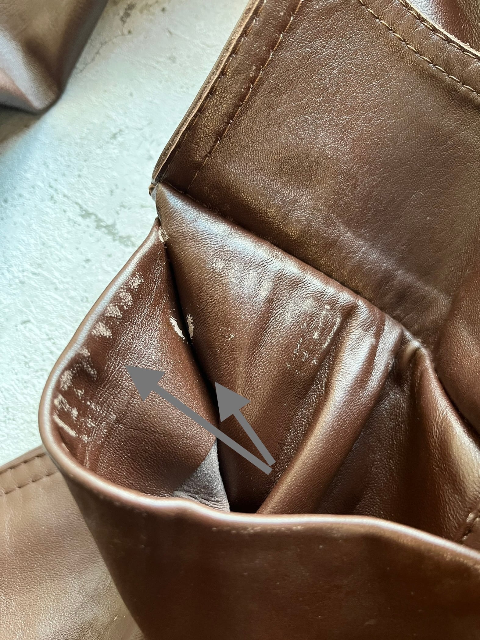 DEAD STOCK.未使用の大変綺麗な状態になりますが、長期保管により僅かなクスミや皺,所々に経年による細かなキズやレザーの密着による銀面剥がれが少し見受けられます。