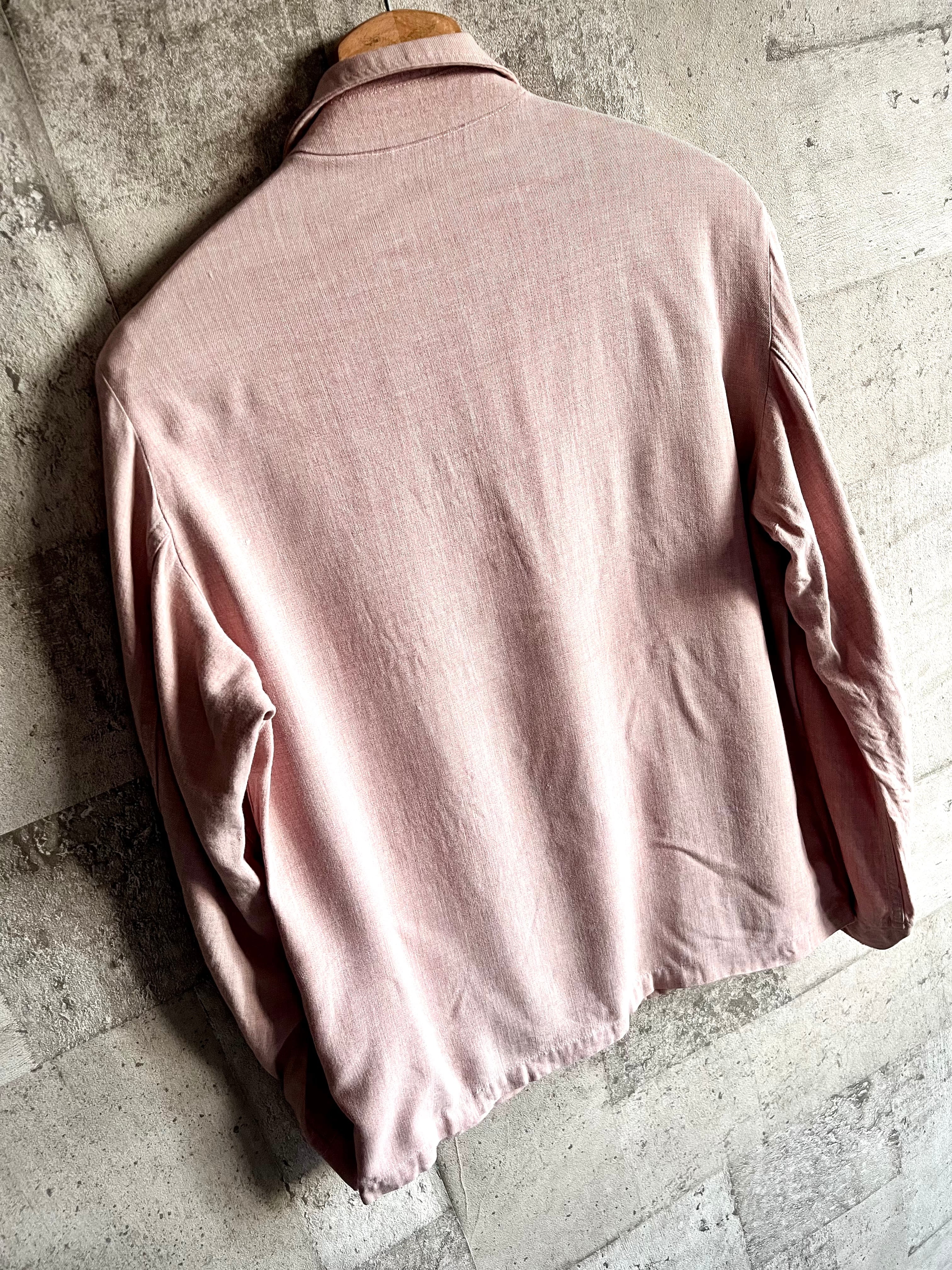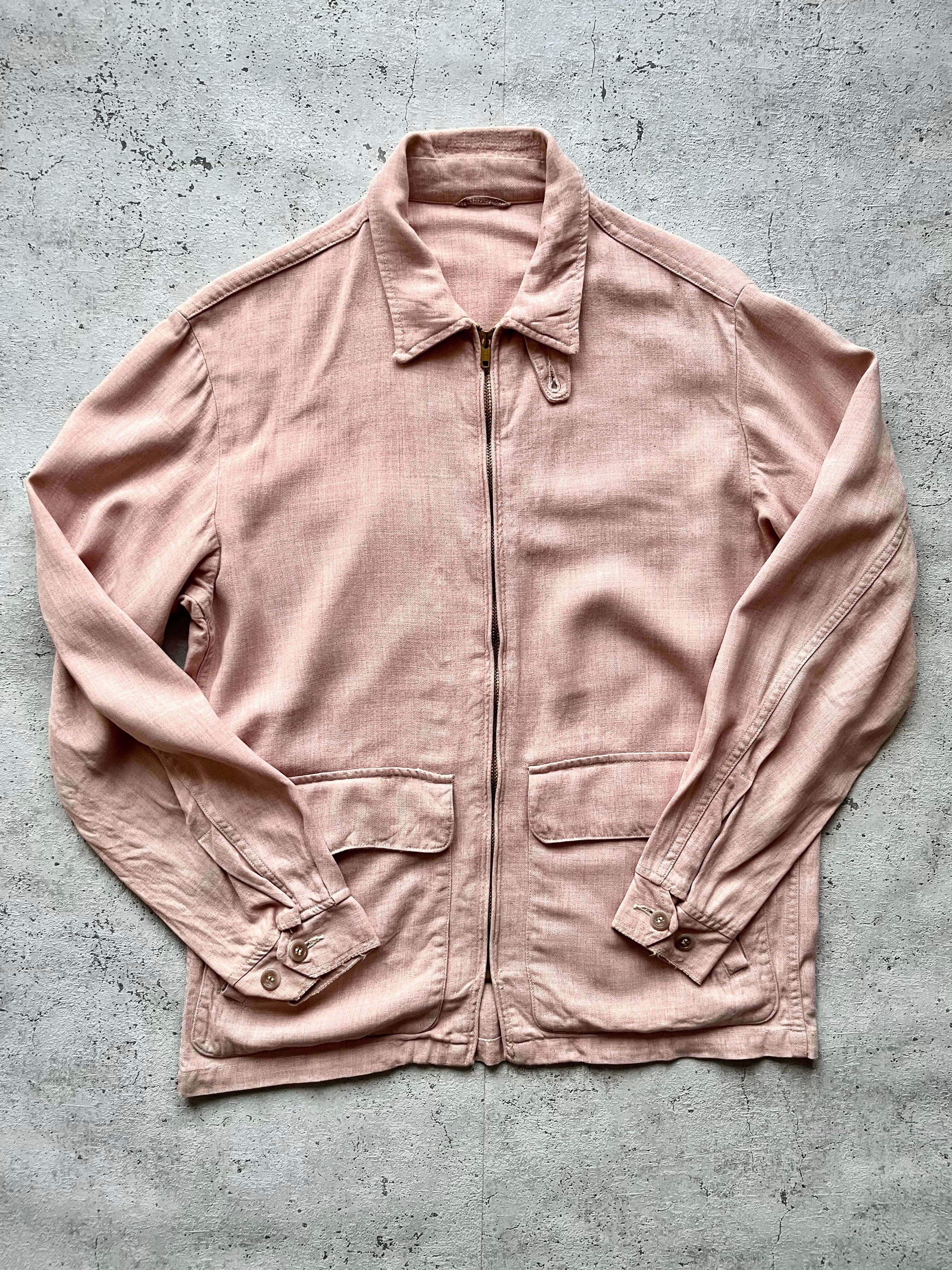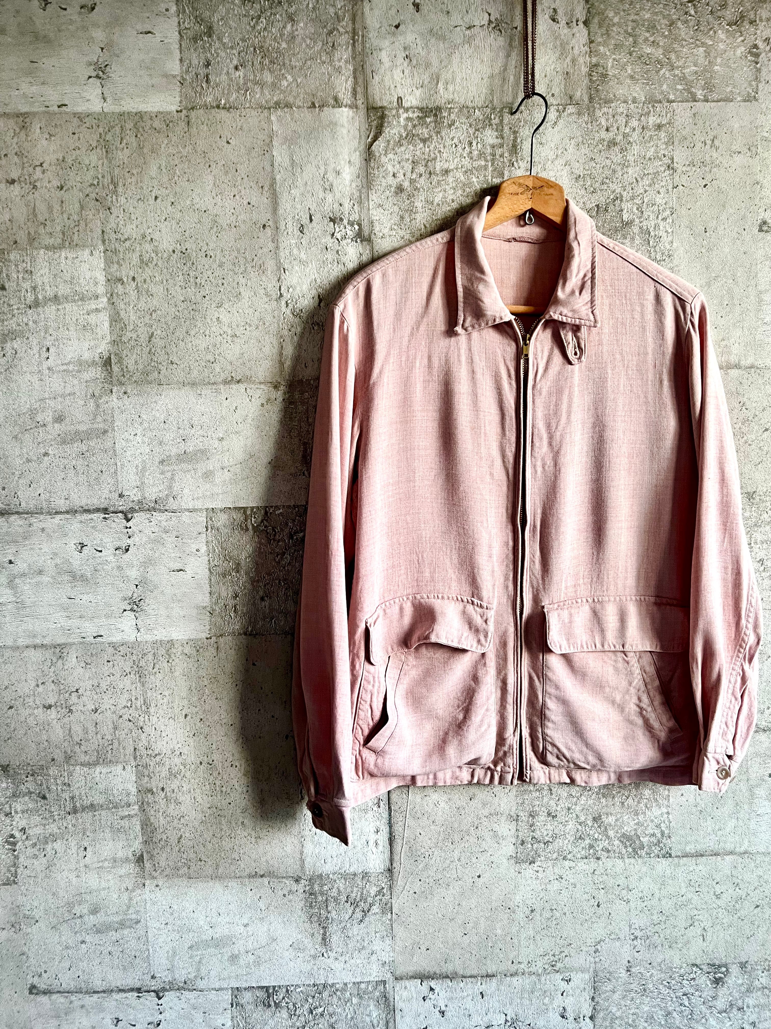 程良く着丈の長さもありライトピンクのカラーリングが絶妙にマッチした50sらしいギャバジャケット、ブラス棒タロンのフルジップタイプにチンスト&フラップポケット付きとディティールも良く、レーヨンギャバ特有の柔らかな風合いがクラシックで良い雰囲気を醸し出しております。