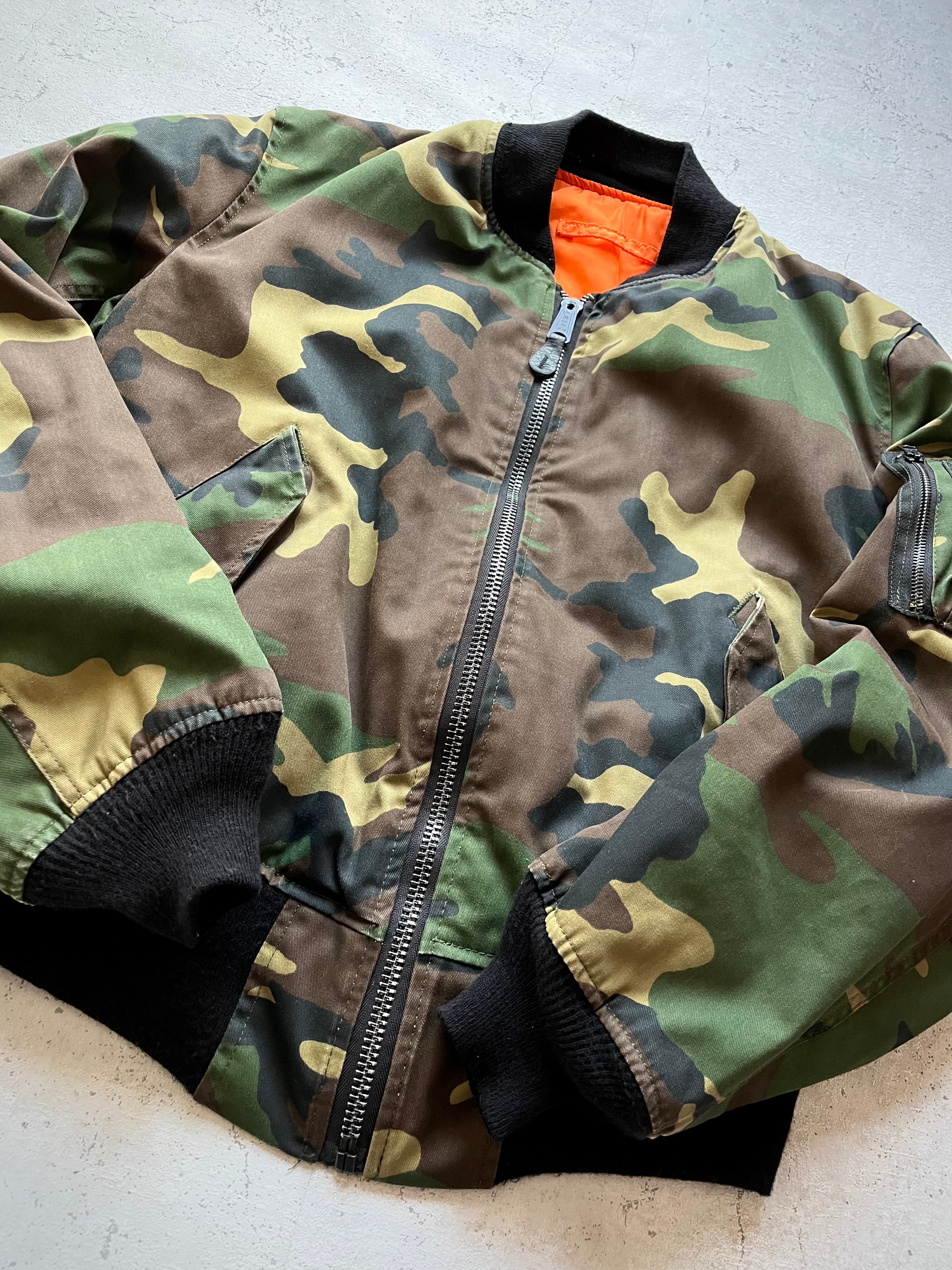 90s〜 MADE IN USA “ ALPHA INDUSTRIES ” MA-1 FLYER’S JACKET WOODLAND CAMO OLD VINTAGE 。
