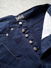 デニム生地程の厚みはなく程好い質感でオールシーズン着用可能なカツラギタイプ、シンプルで品格あるネイビーベースにスッキリとしたスリムストレートの綺麗なシルエットとなっており、不思議と現代のスタイルにも絶妙にマッチする使い勝手の良い一品です。