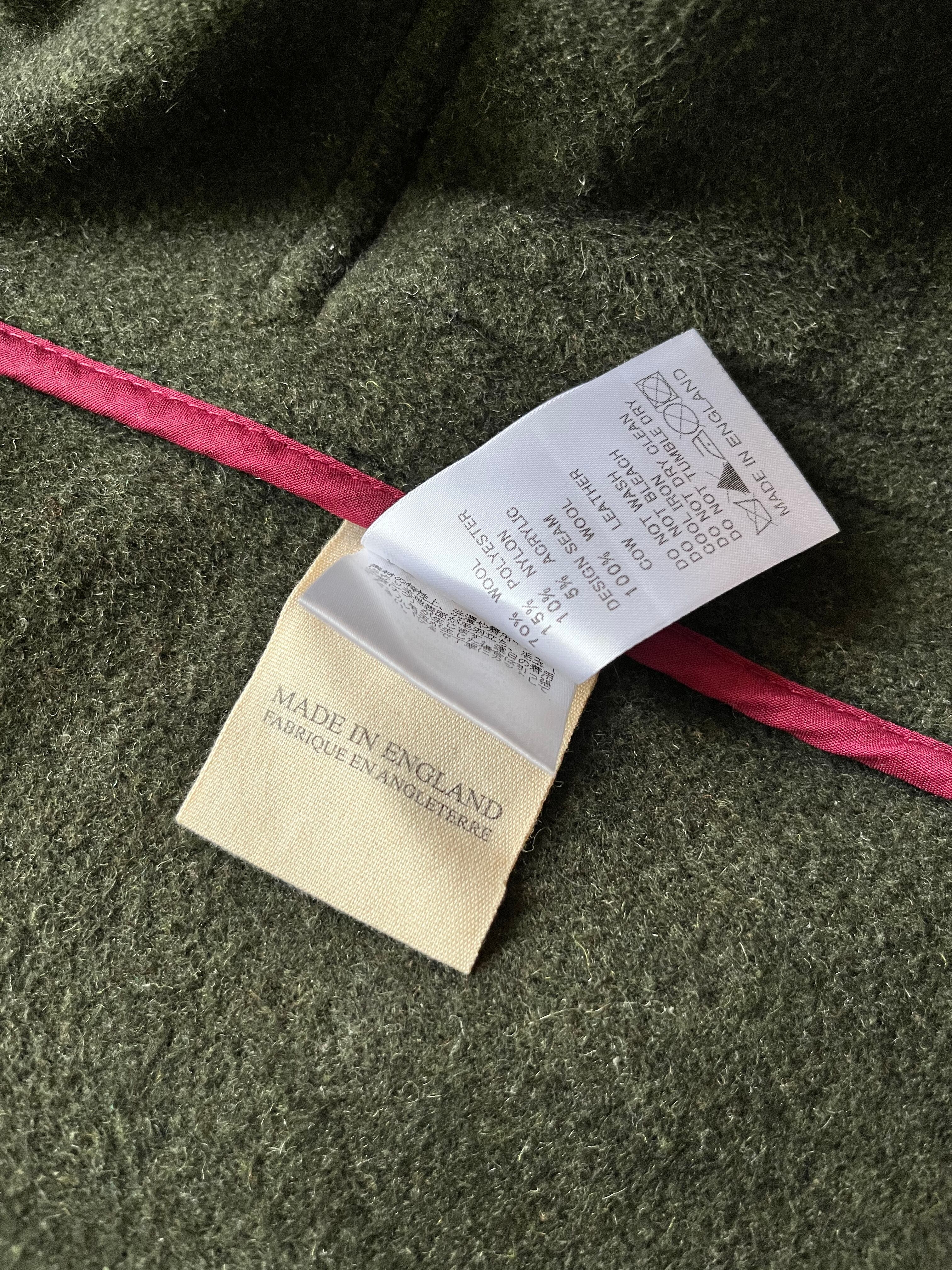 ツィードの切り替えパネルデザインやフロントジップに加えて水牛角トグル&レザーループと定番ながらも少し珍しいディティール、通常はタータンチェックの裏地がほとんどですがオリーブのソリッドを採用したモダンな仕上がりとなっております。