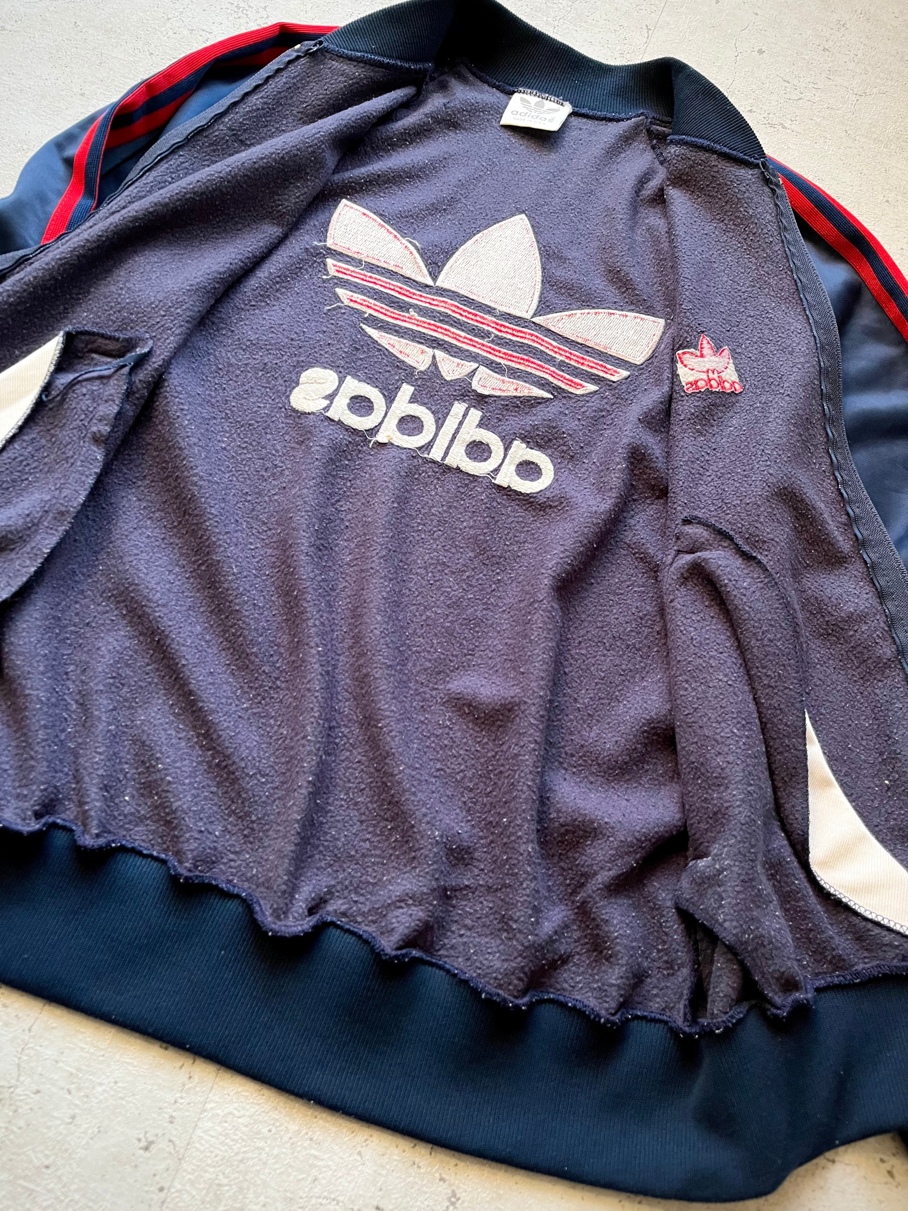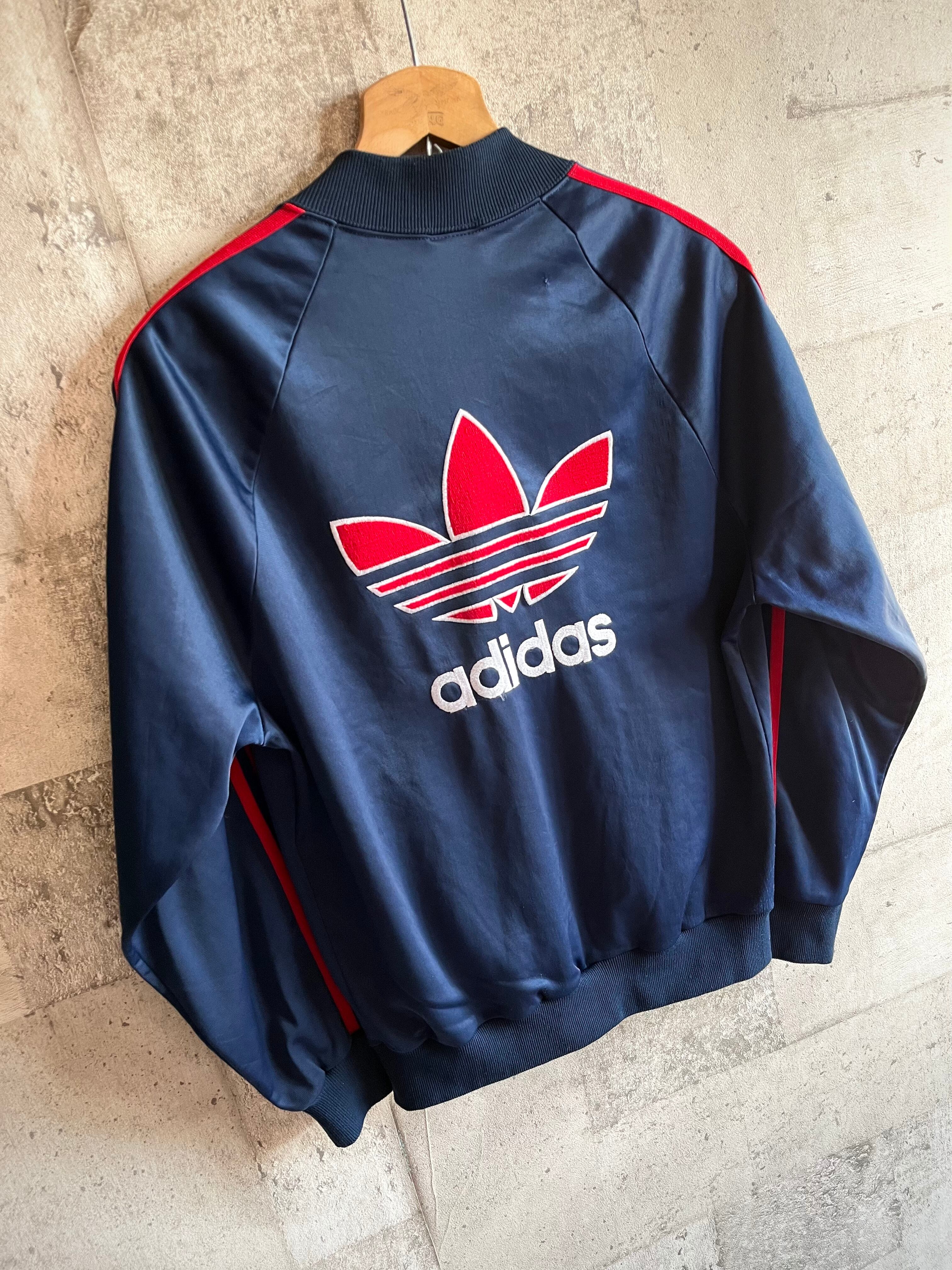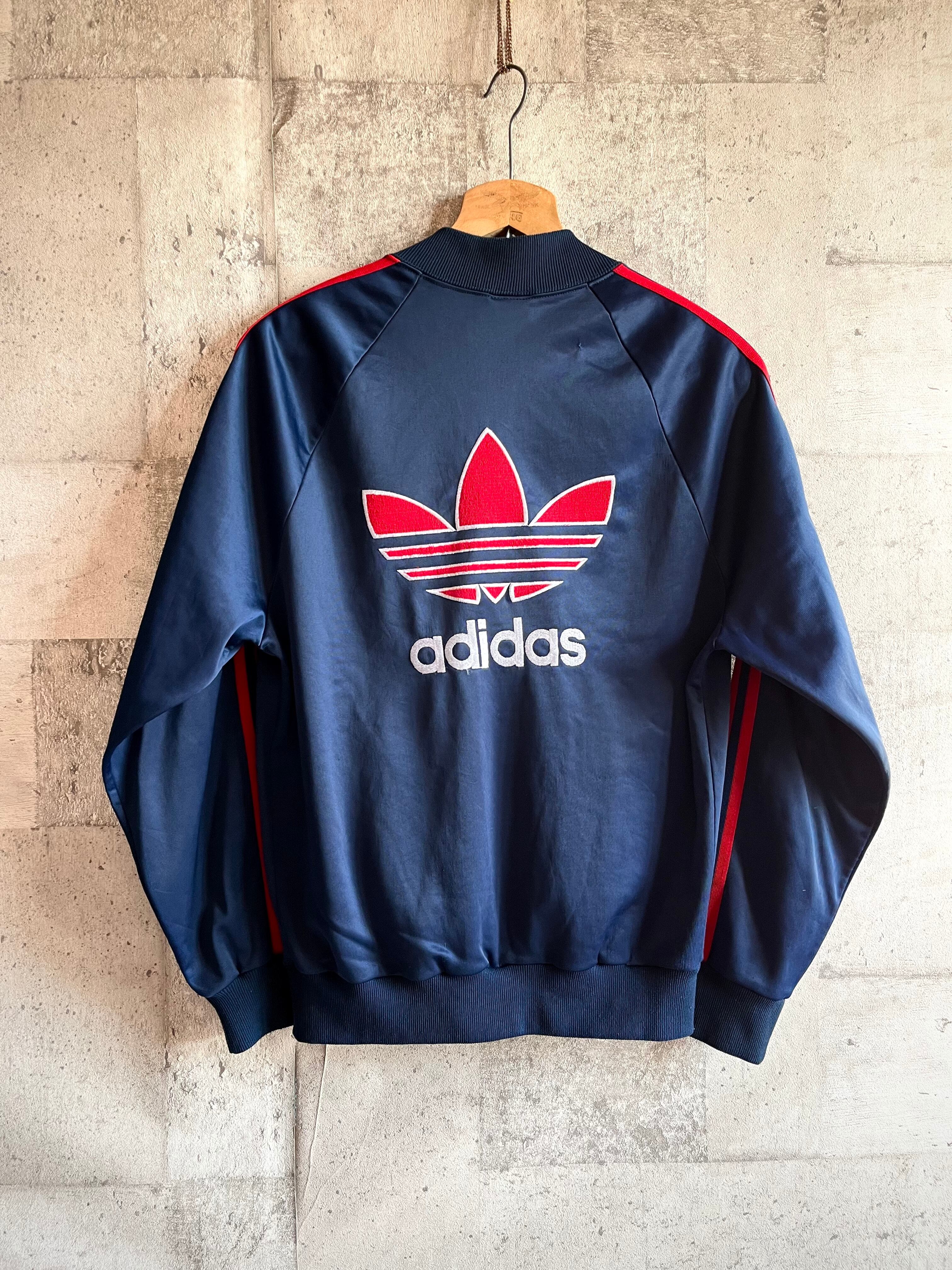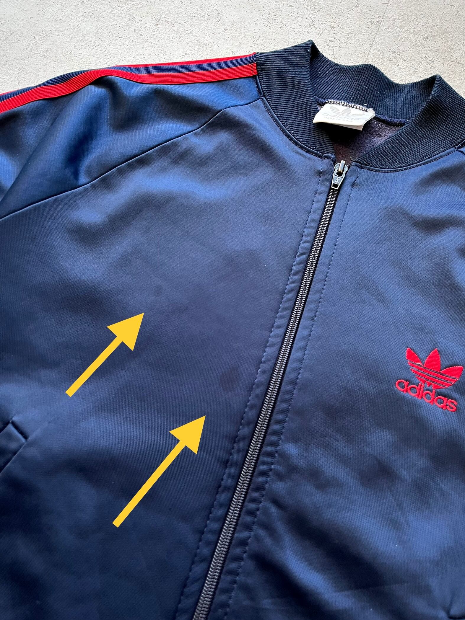 この辺りのトラックジャケットが好きな方でしたら当時から人気のシリーズですので存じ上げている方も多いと思われるレアなバックサイドのトレフォイルロゴバージョン、RUNDMCモデルでは見かける事ができますがネイビーボディーにレッドラインとなると探しても中々見つからない希少種シリーズだと思います。