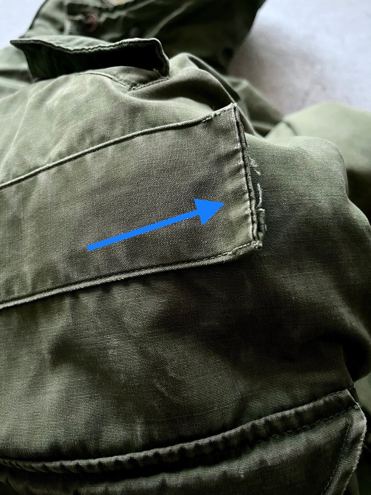 ビンテージならではの使用感,細かいスレ.キズ,薄汚れ,最下部ボタン交換,ウエストベルト欠損.ステッチ解れ,リブに摘み跡,袖先や裾縁に擦り切れ等が少々ありますが、M47としては年代を考慮してもまずまずな状態だと思います。