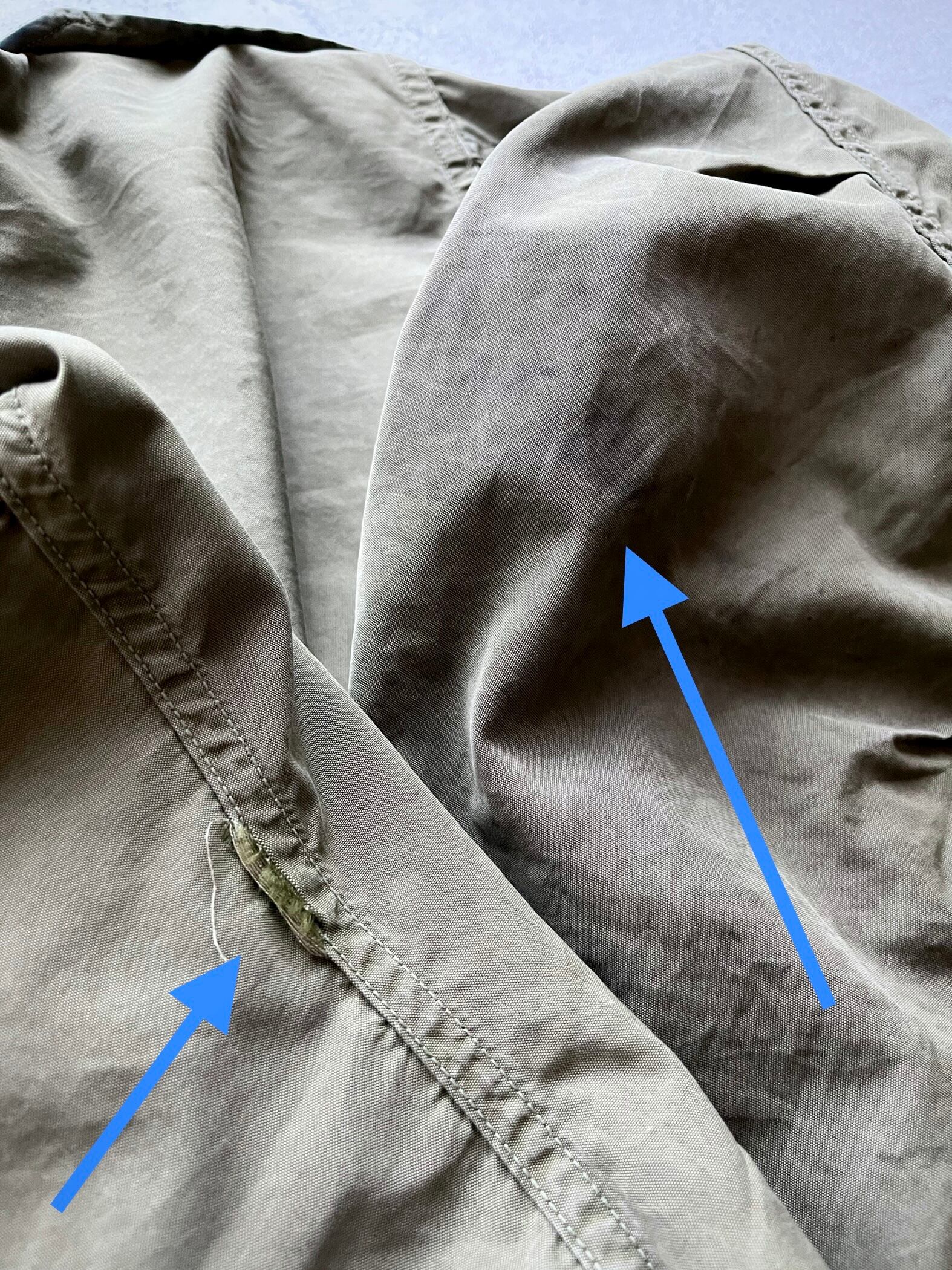 ビンテージならではの多少使用感,細かいスレ.キズ,所々に黒ズミ.薄汚れ,一部にステッチアウト,腹部に小穴リペア跡等はありますが、それ以外は年代を考慮してもまずまずの状態だと思います。