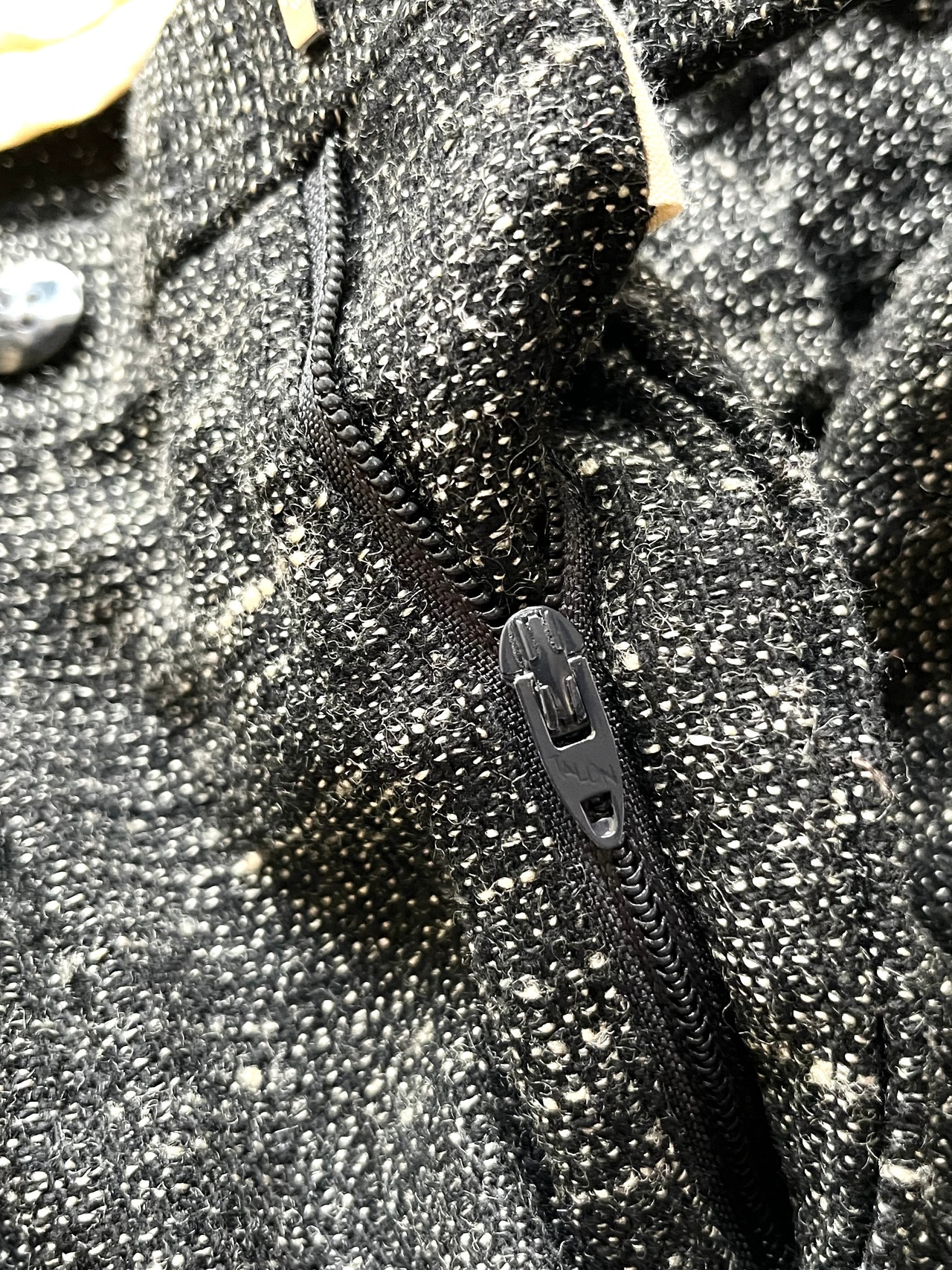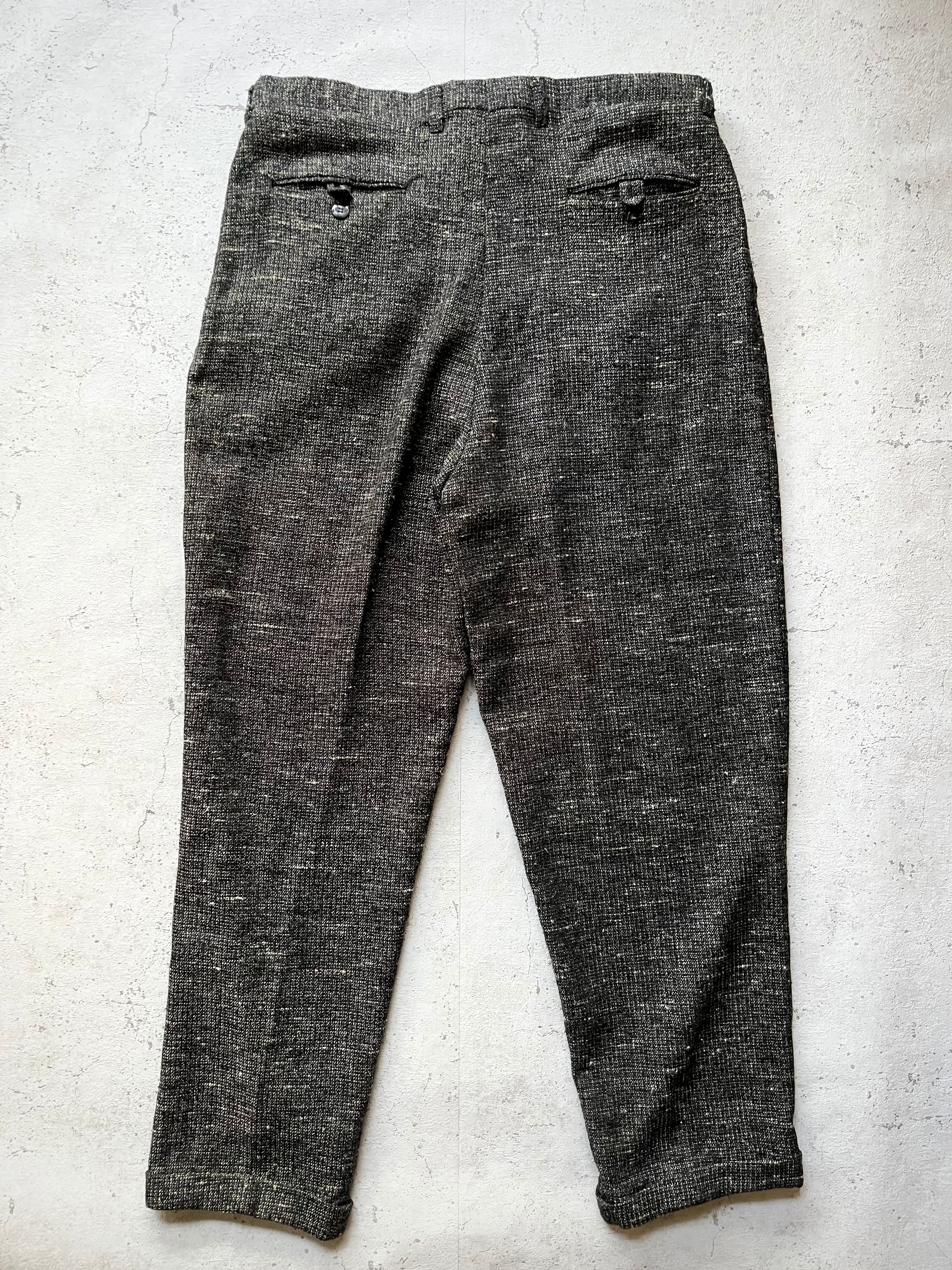 印象としては50年代の雰囲気を醸し出しており、ブラックベースに随所に散りばめられたネップ混の珍しい生地に注目度の高いツータック&テーパードシルエットが魅力的なTROUSERSです。