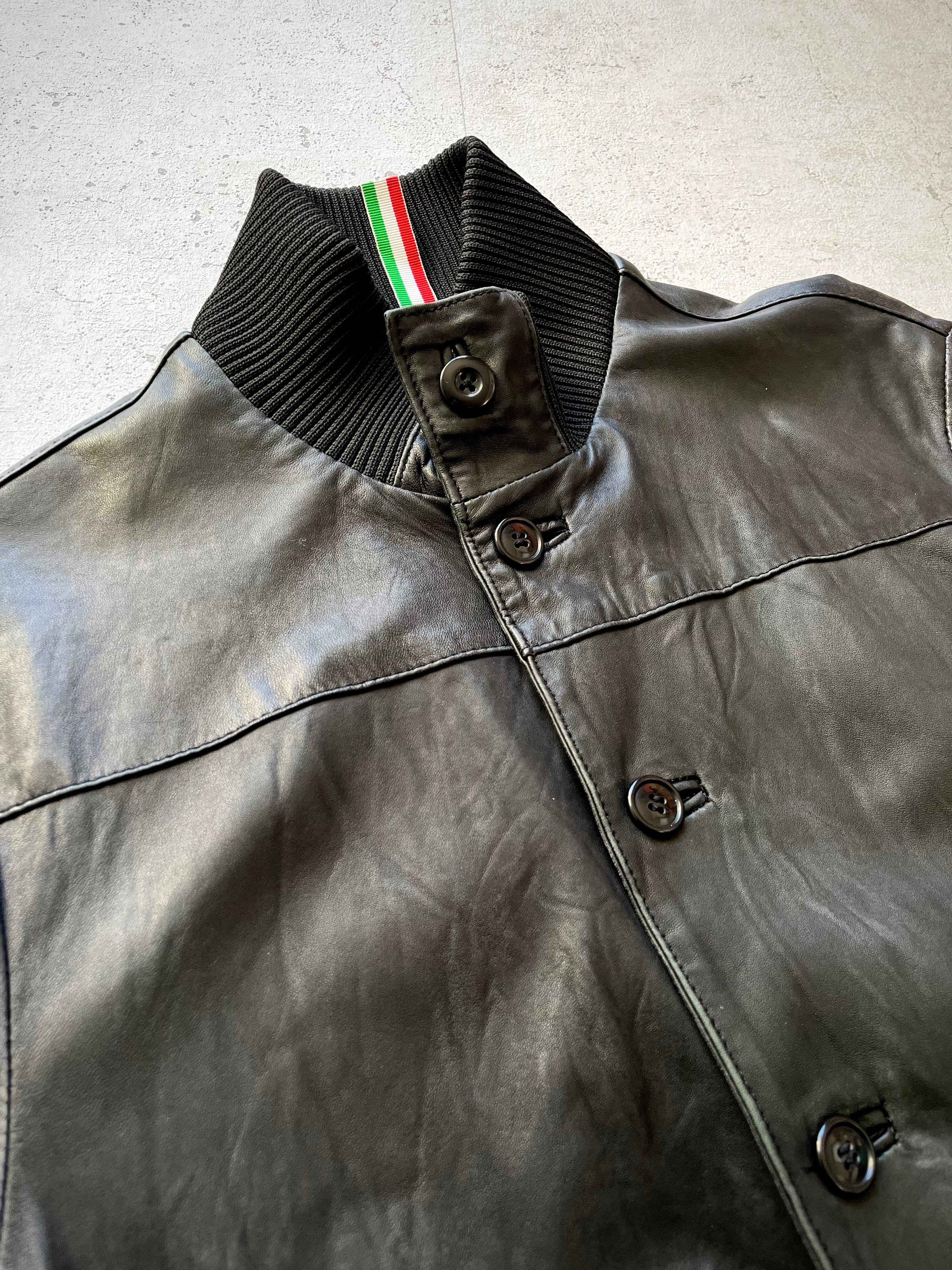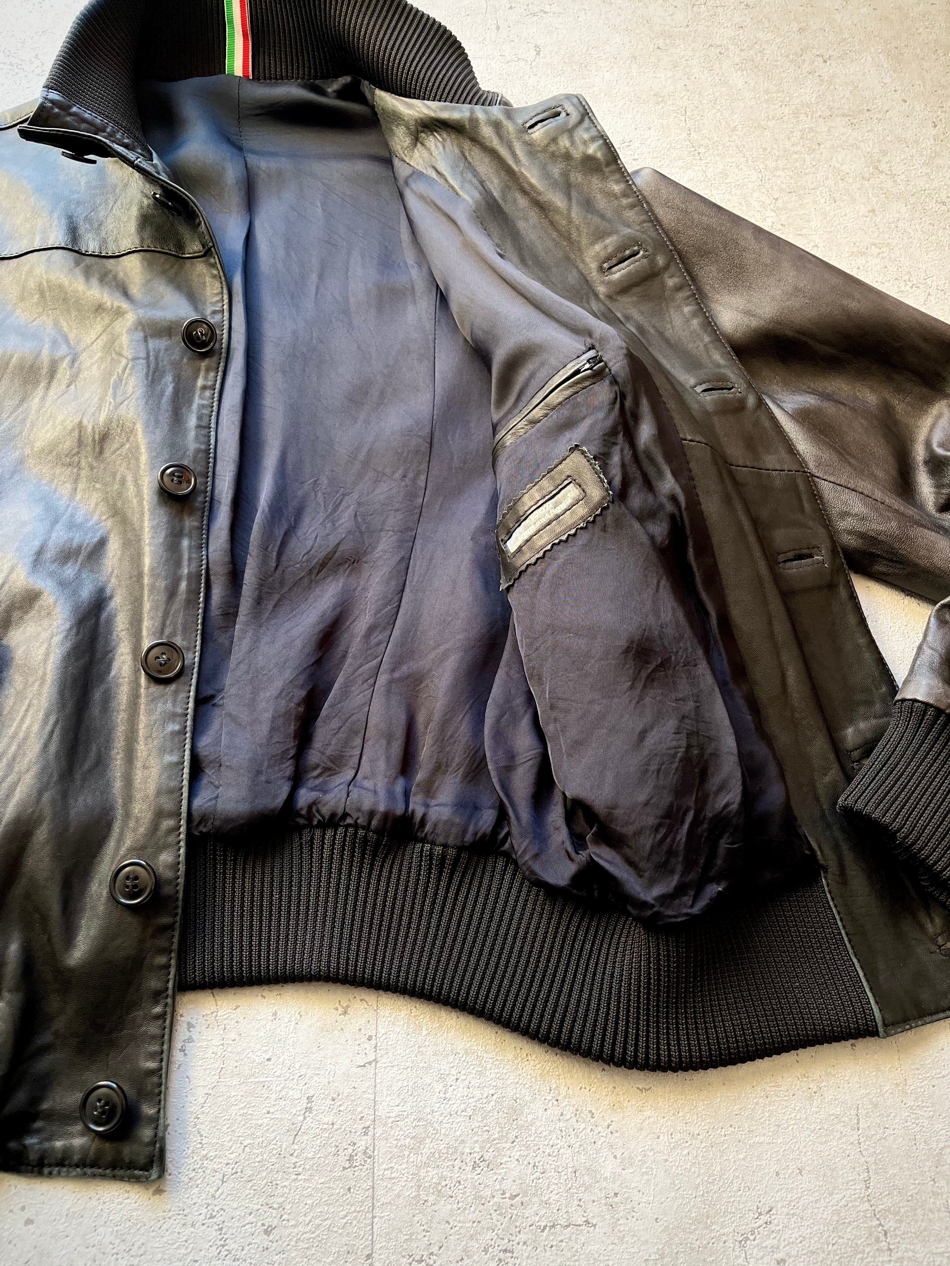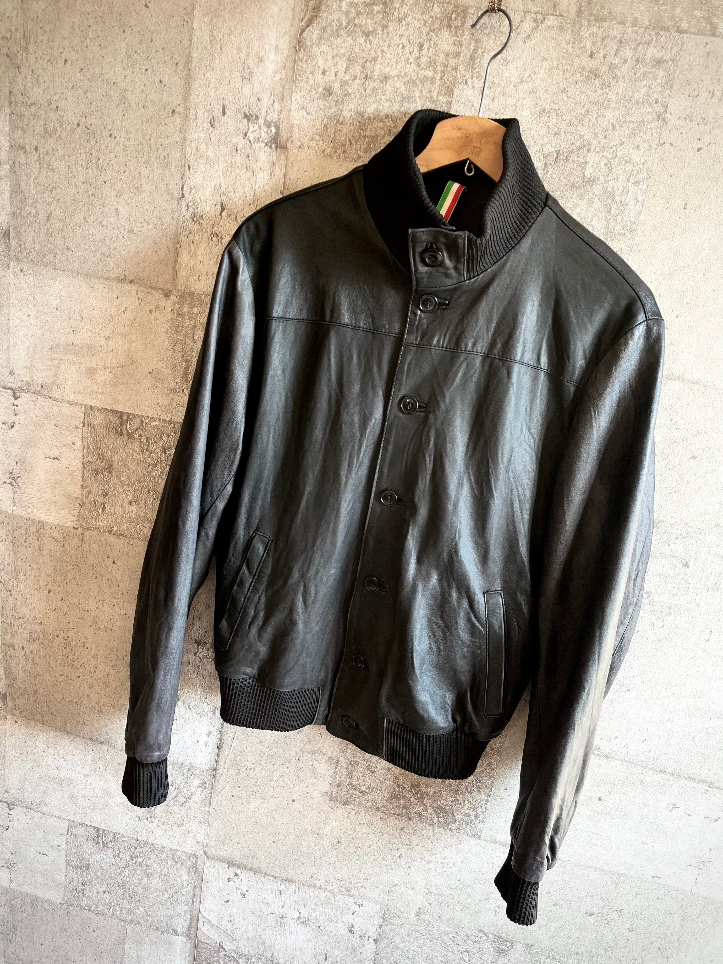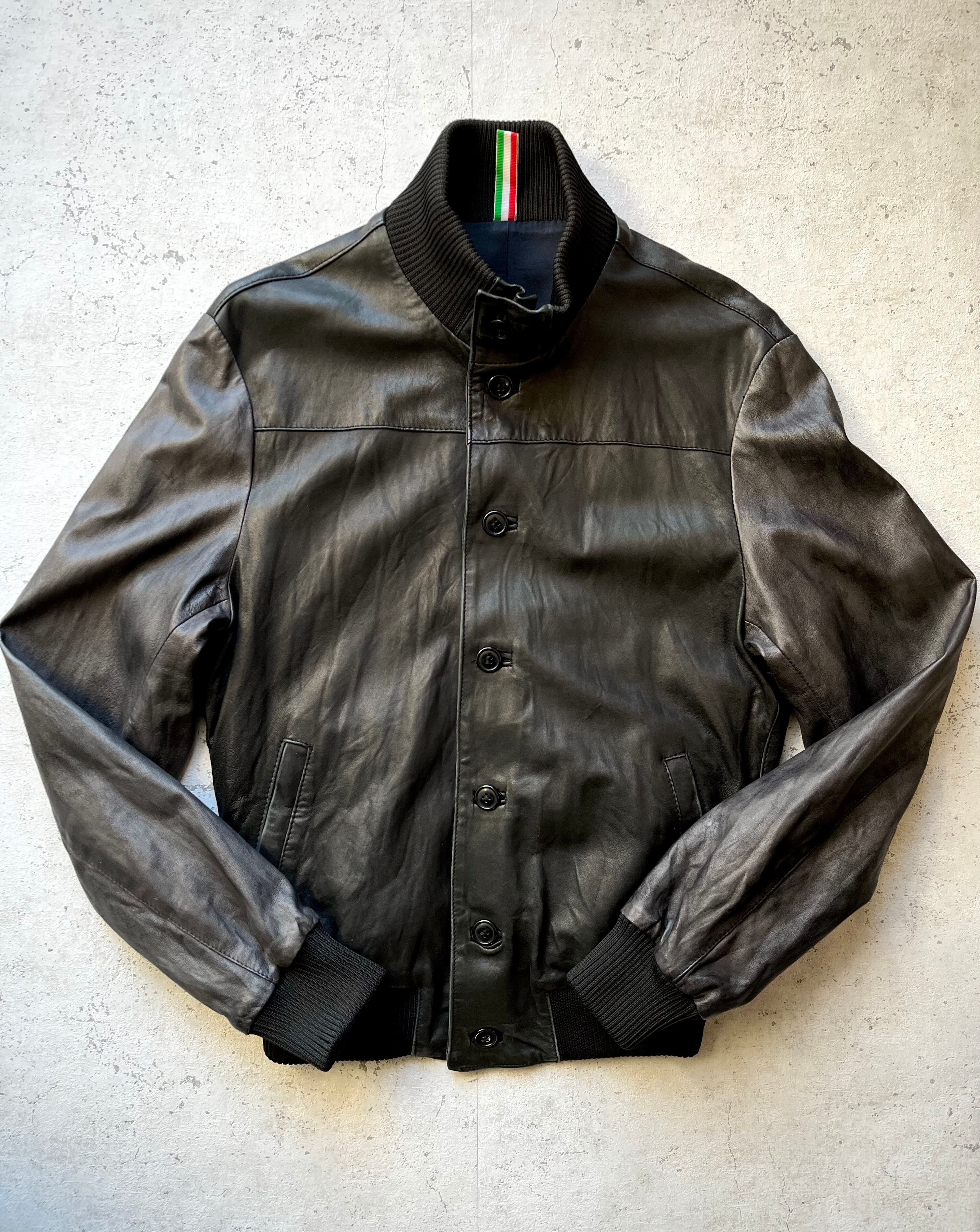 デザインのベースはフロントボタンスタイルに立ち襟型のスタンドカラーとまるでA-1ジャケットを彷彿とさせながらもイタリアらしいモダンな佇まい、よく見ると両袖のみ若干色みが違うツートンパターンに恐らくラムレザーと思われる非常に柔らかな質感も相俟ってデザインのみならず大変着心地の良い仕上がりとなっております。