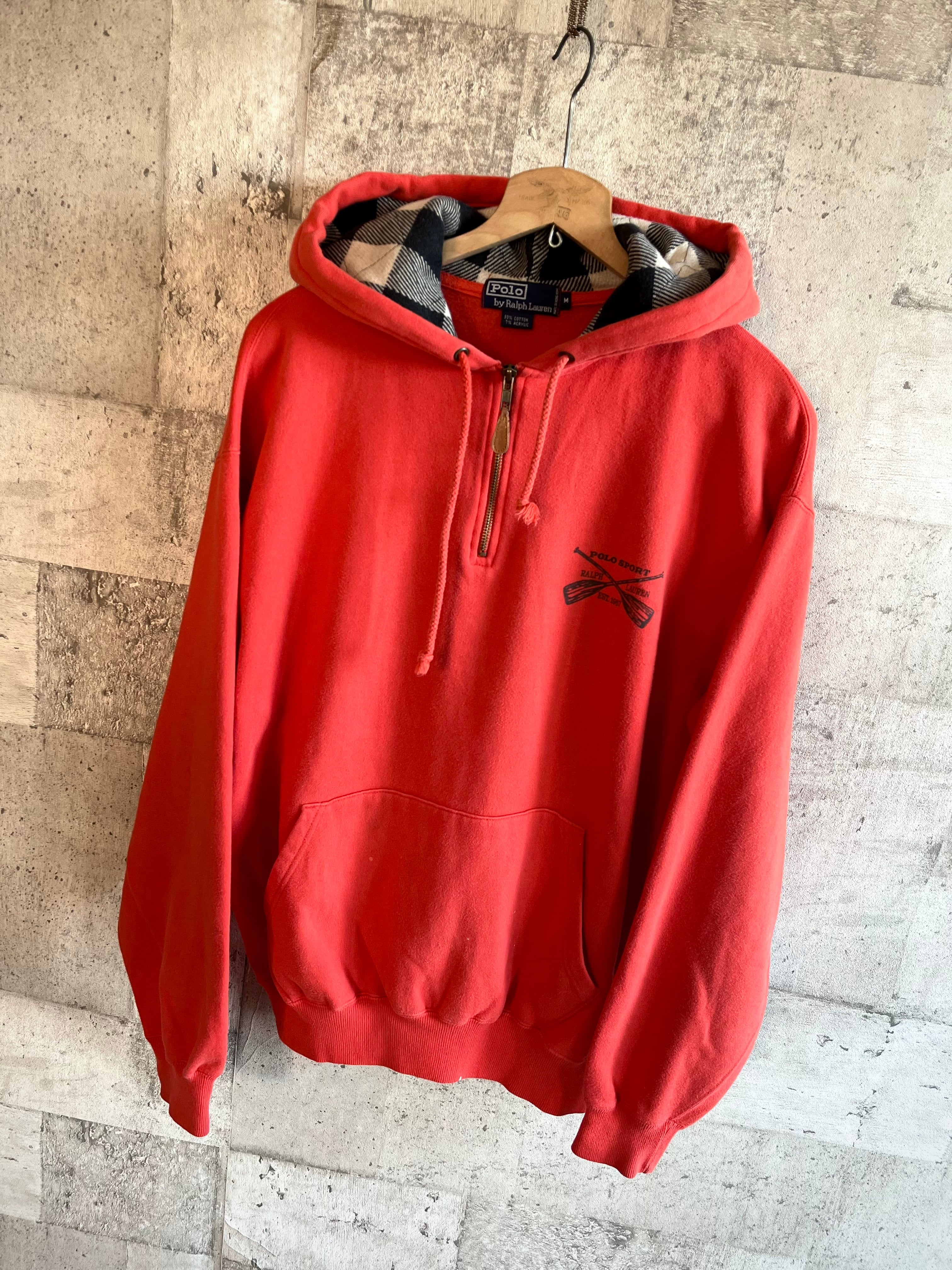 ビンテージのディティールとしてはお馴染みでもあり人気の高いハーフジップタイプのプルオーバー、フード内部はブロックチェックのネル生地張りにフロントはPOLO SPORTロゴ&クロスタイプのウッドオールがプリントされたカレッジ調のグッドデザインな1枚。