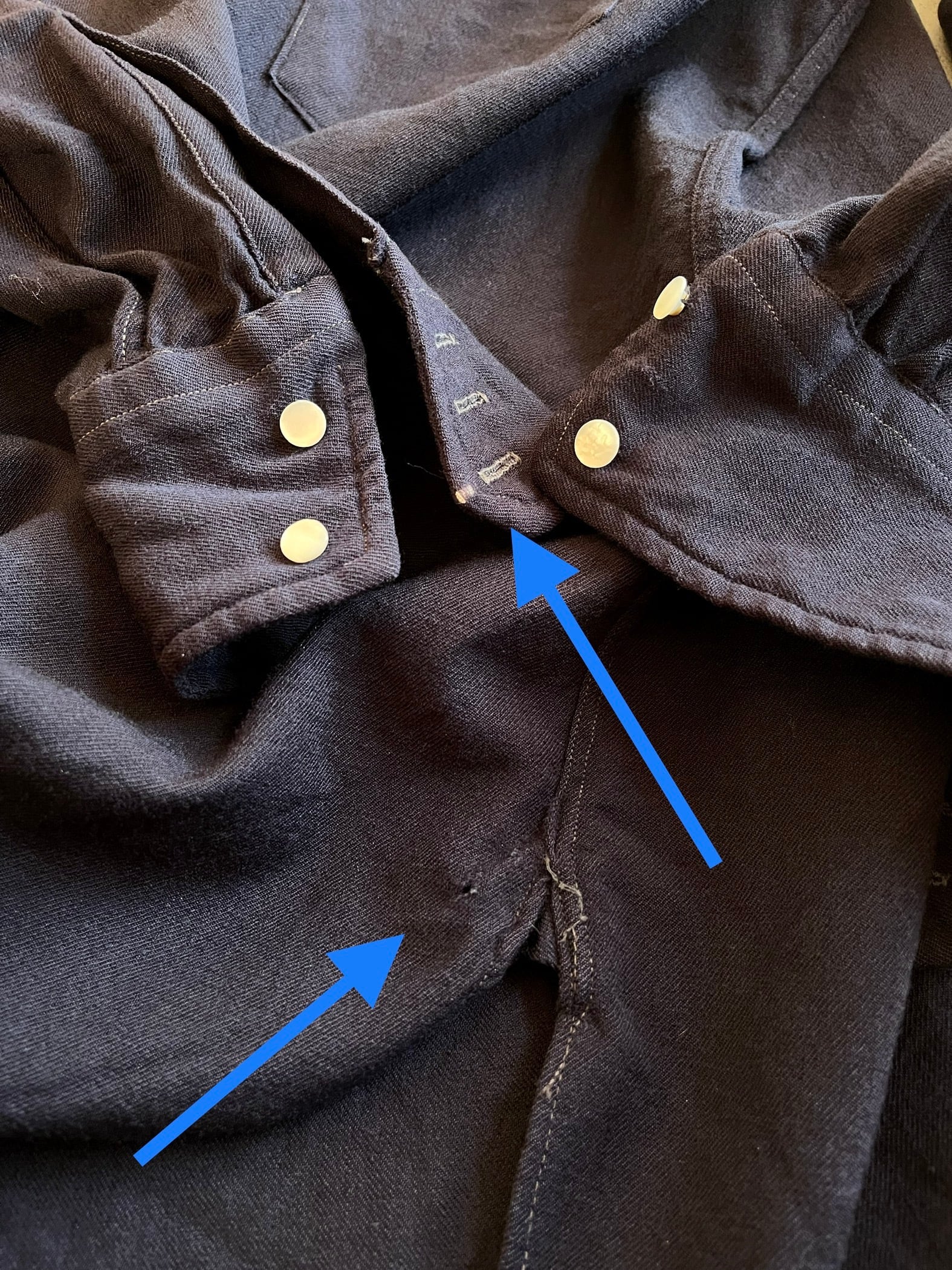 ビンテージならではの使用感,細かいスレ,アームホールに毛羽,袖先ボタンが一つずつ欠損,裾マチ横に小穴,ポケット下部やフロント,袖先付近にキズ.摘み跡等と少しダメージが見受けられますが、その他,着用に支障のある目立つような汚れや大きなダメージは見受けられません。