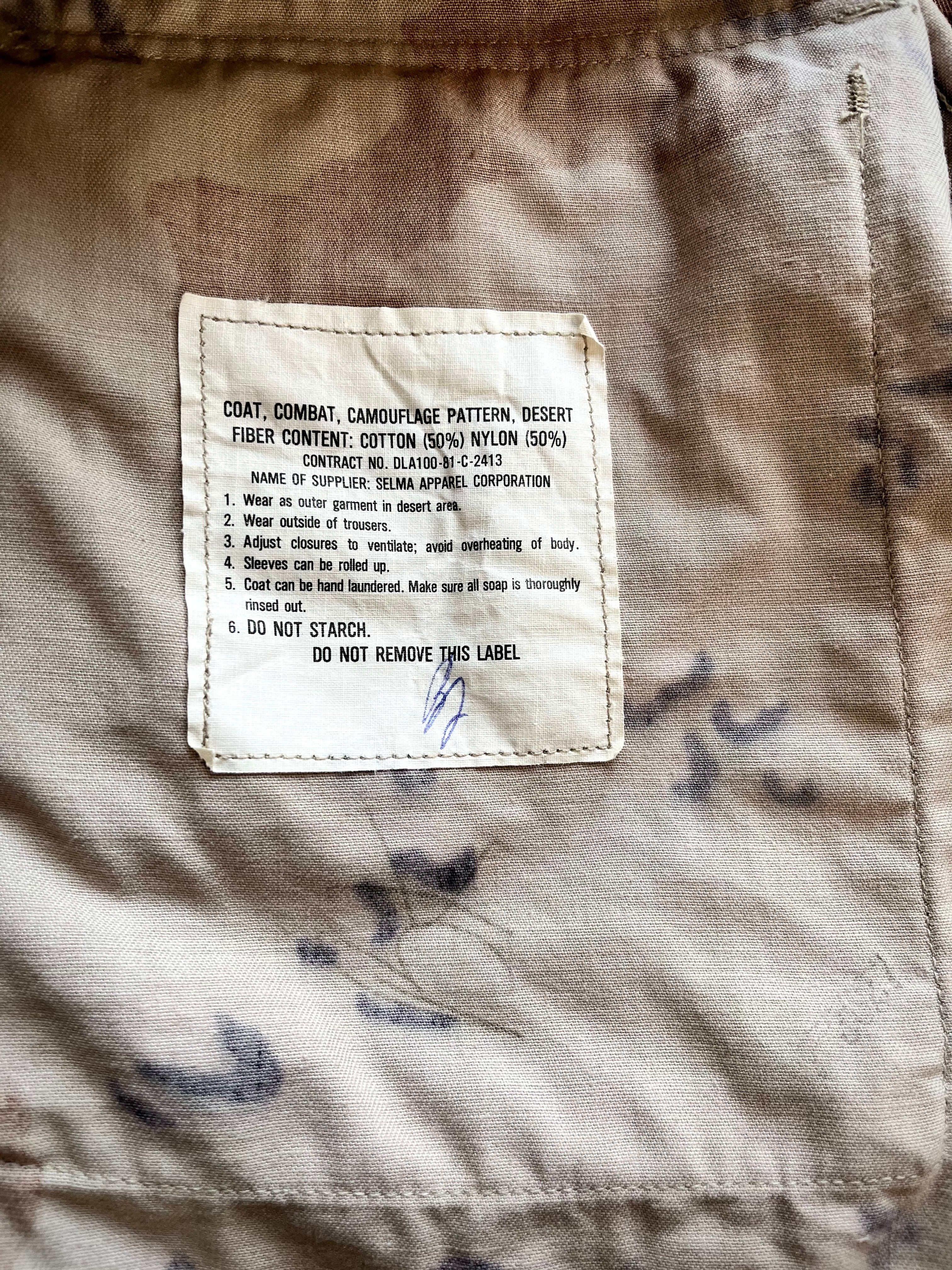 実際に湾岸戦争にて着用され約10年程と限られた採用期間の中でもあまり見かける事のない81年の初期タイプ、砂漠地帯の暑さや日焼けから身を守るヨークの2枚生地やポケットの内マチ等と初期ならではのディティールも嬉しいポイントですが、何よりSMALL - XX-SHORT表記と大変珍しいサイズ感のレアな1枚です。
