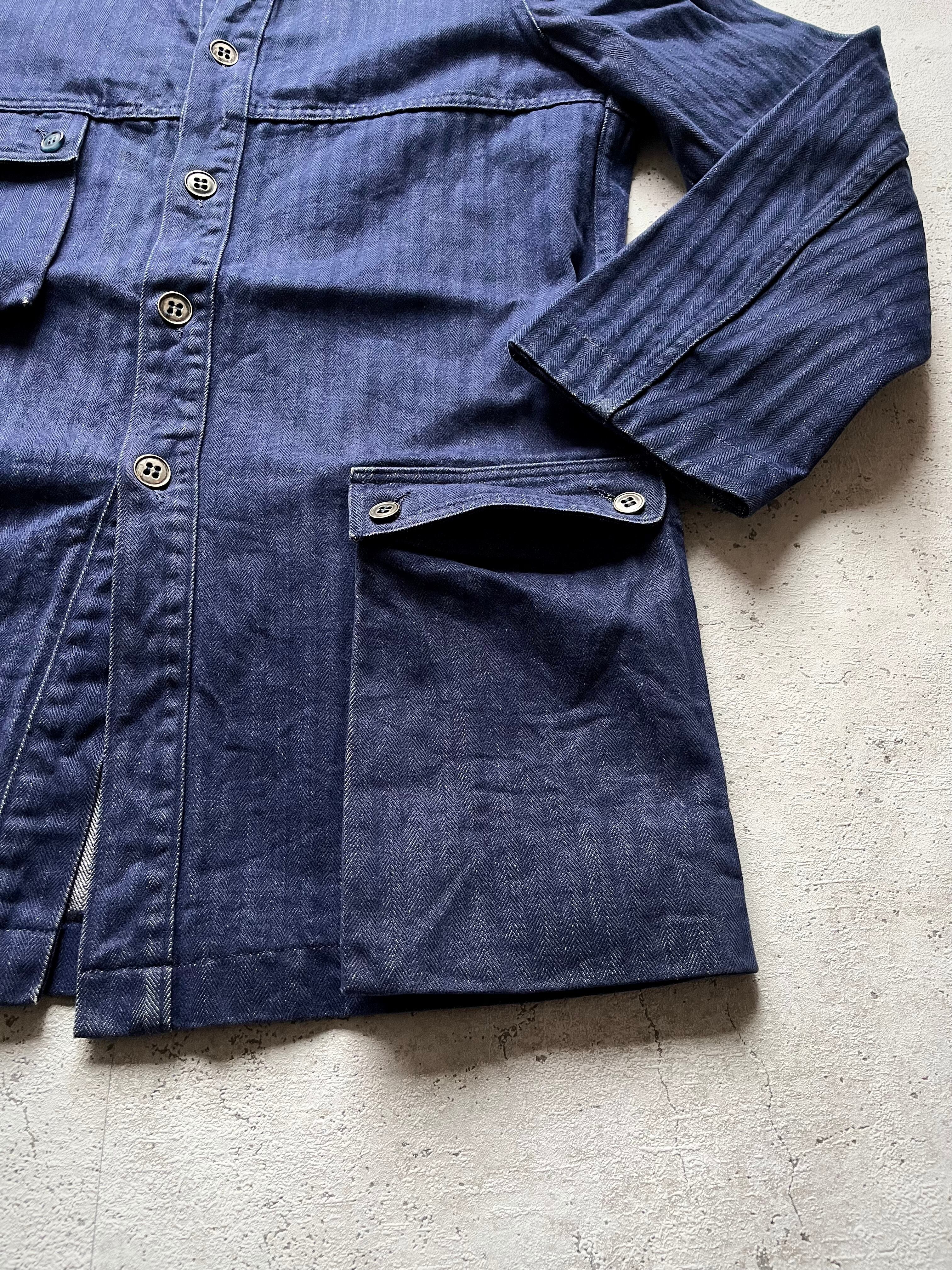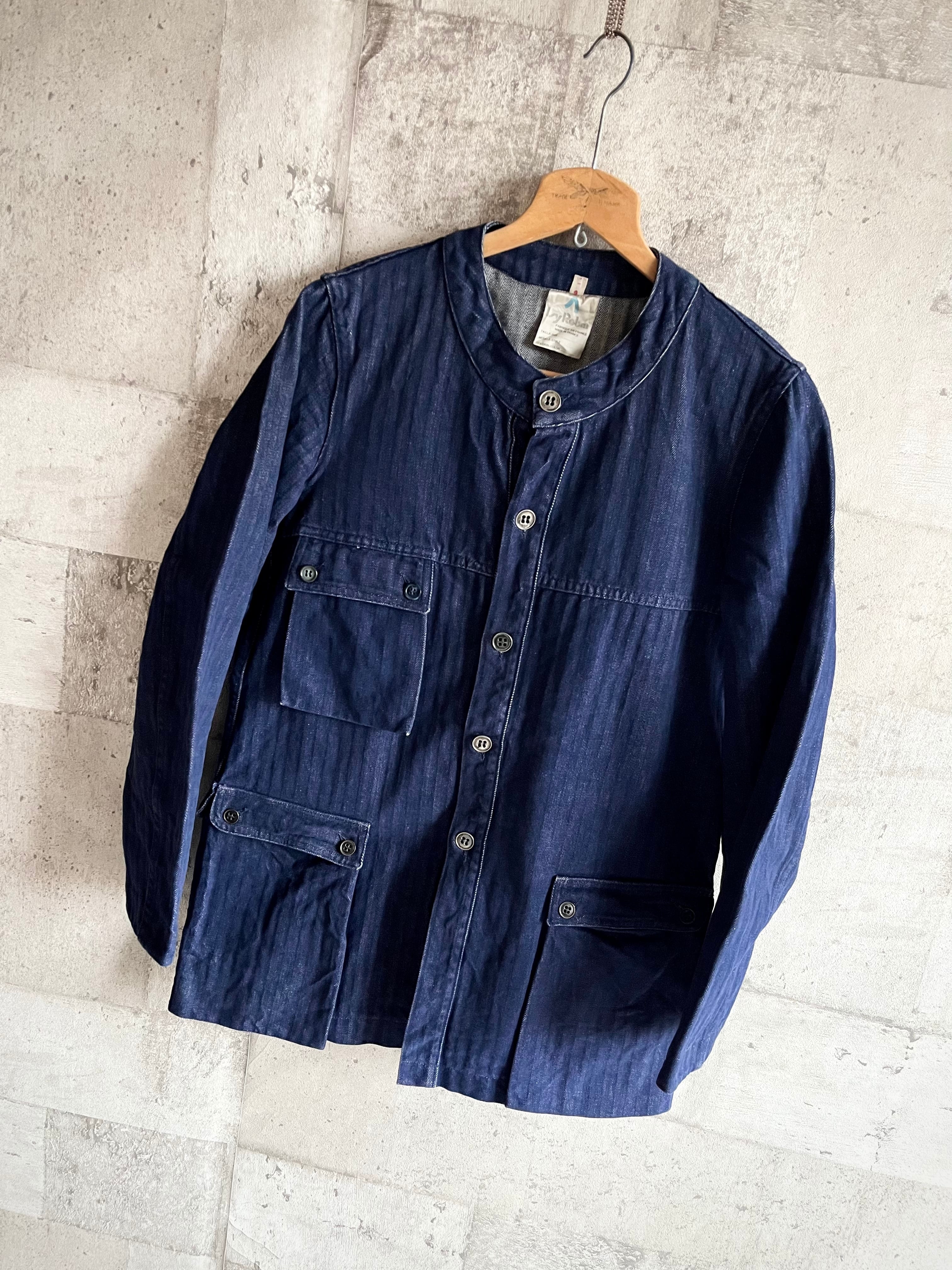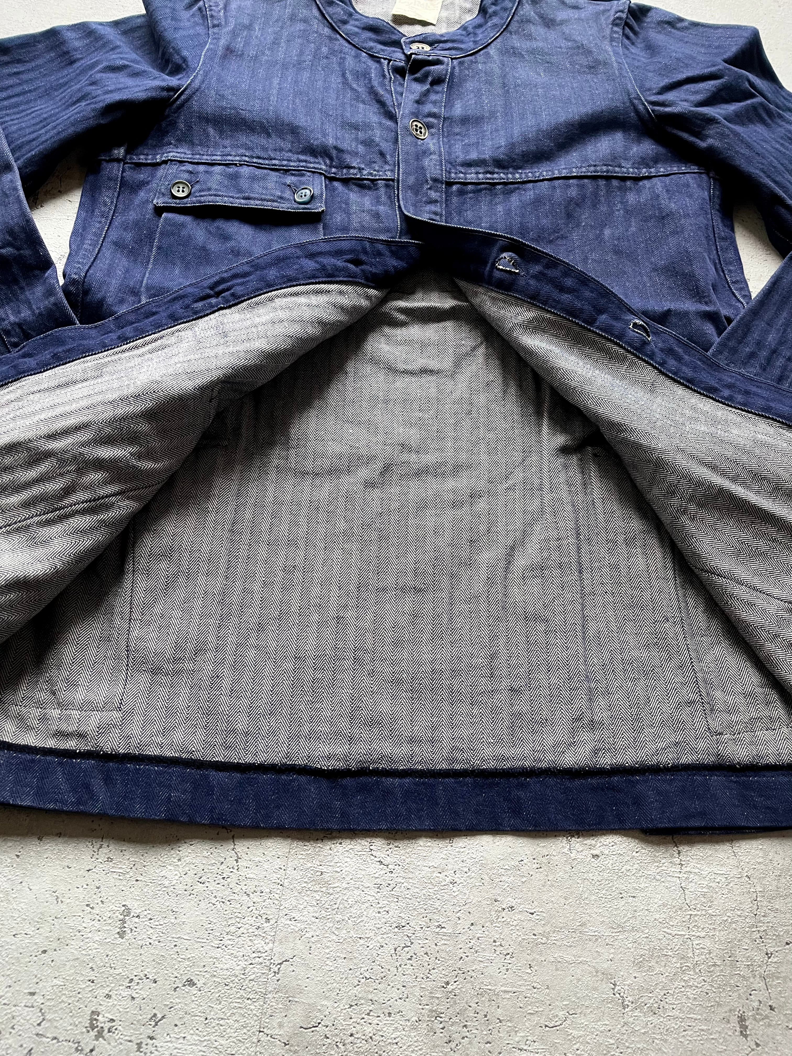 古着好きのみならずアパレル界隈でもファンの多いモダンなフレンチワークスタイル、比較的珍しいスタンドカラーにヘリンボーンベースのデニムジャケットになります。