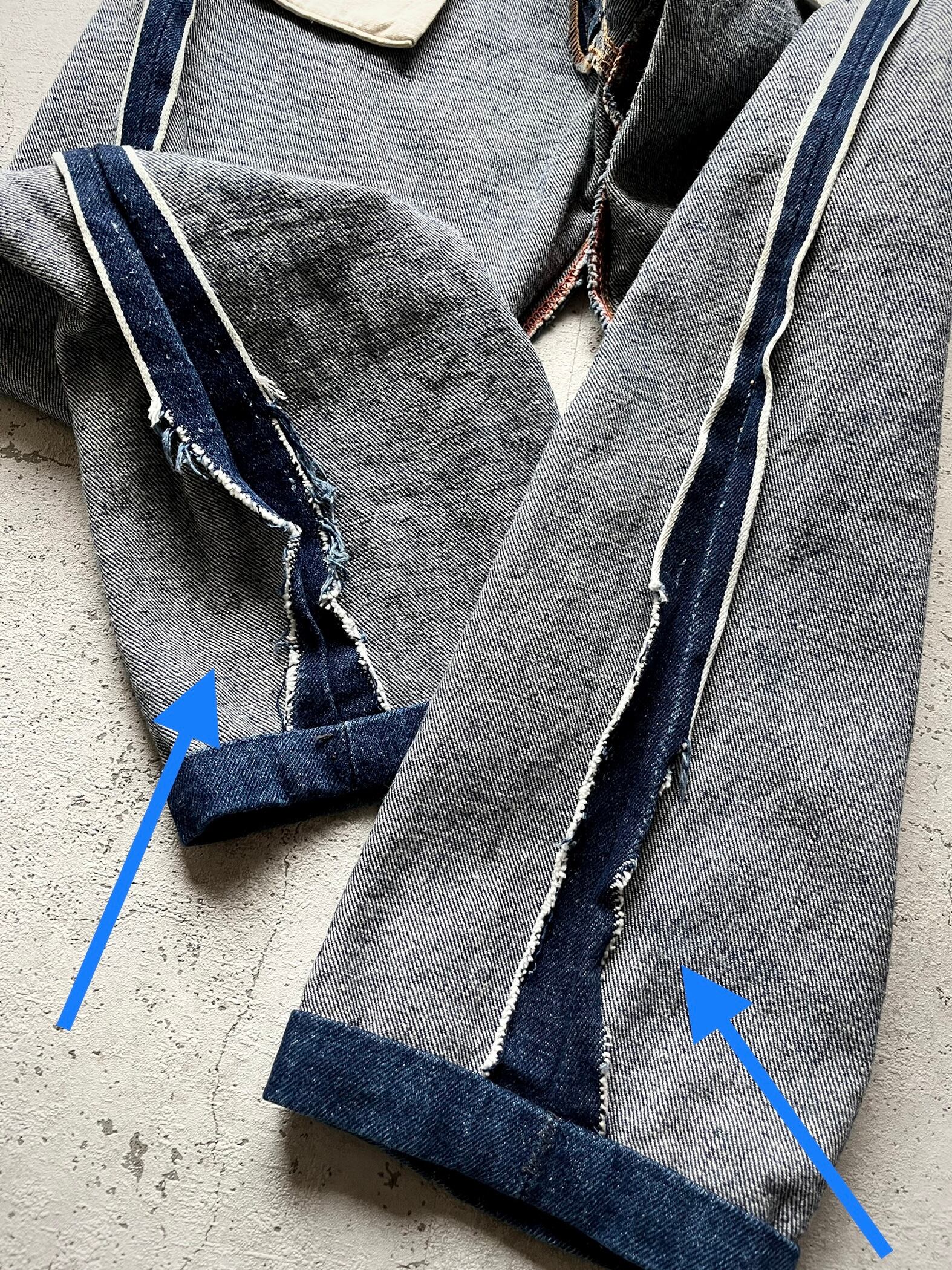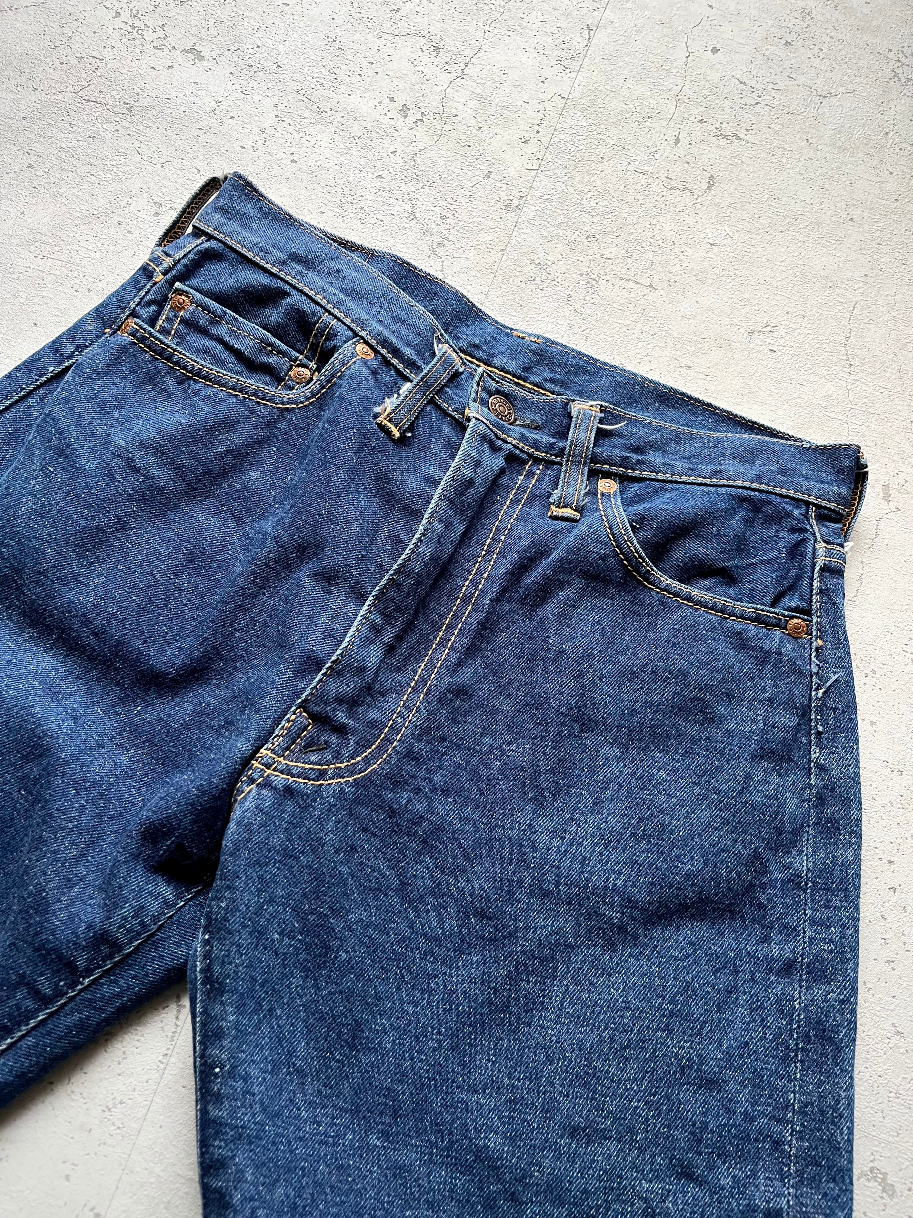 オールコットン.イエローステッチにフロントVやウエスト.ポケット等のシングルステッチ、レーヨン赤タブに両サイドは耳付き仕様と嬉しいポイント、残念ながらサイドシームから少し詰められておりシルエットが僅かに変わってしまっておりますが濃紺で色残りも良く当時物としては申し分のないデニムだと思います。