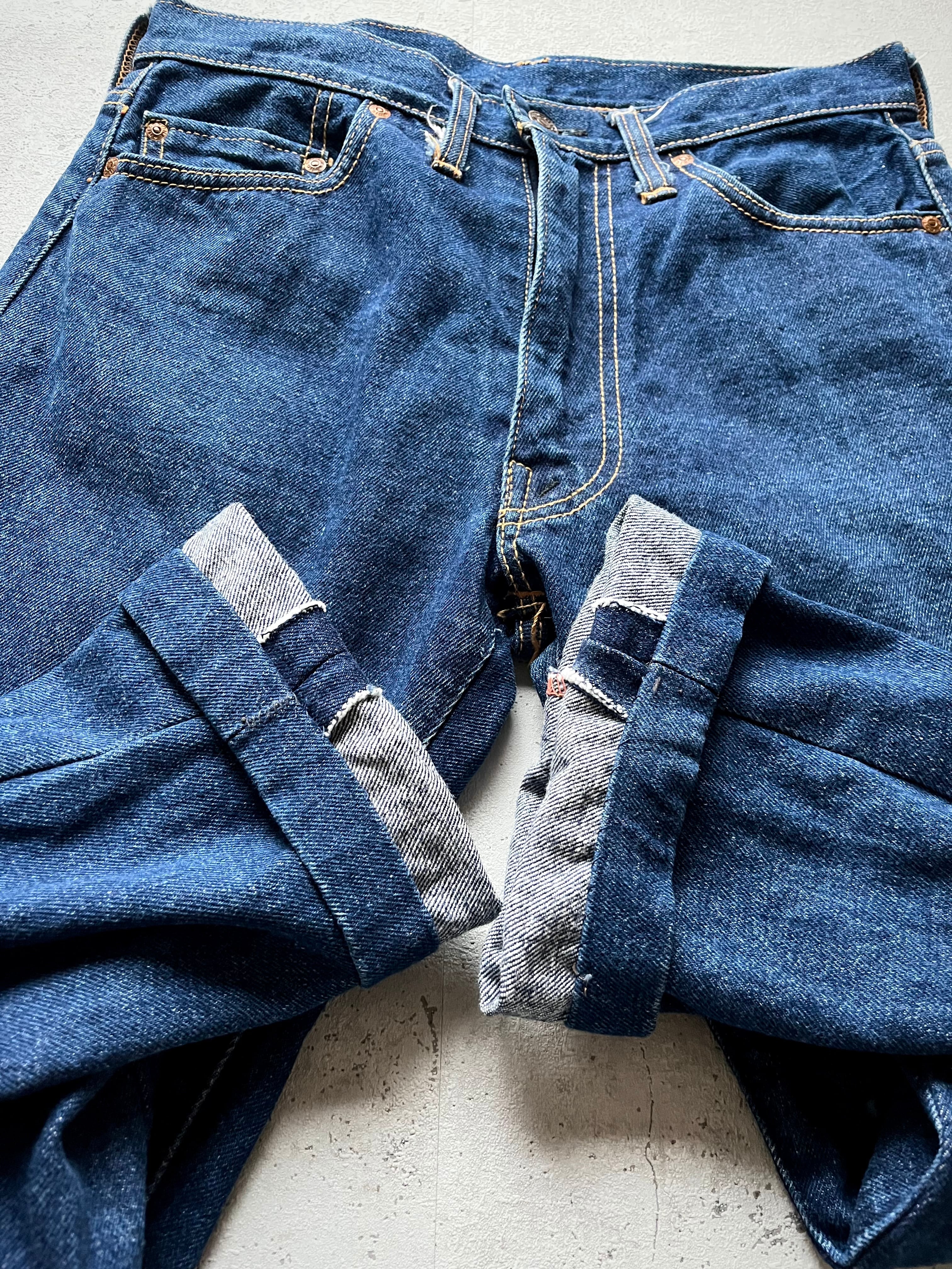 ビンテージならではの多少使用感,細かいスレ,僅かな色落ちやアタリ,サイドシームから少し詰められたスリムテーパード状態となっておりますが、濃紺で色残りも良く比較的綺麗なグッドコンディション状態だと思います。