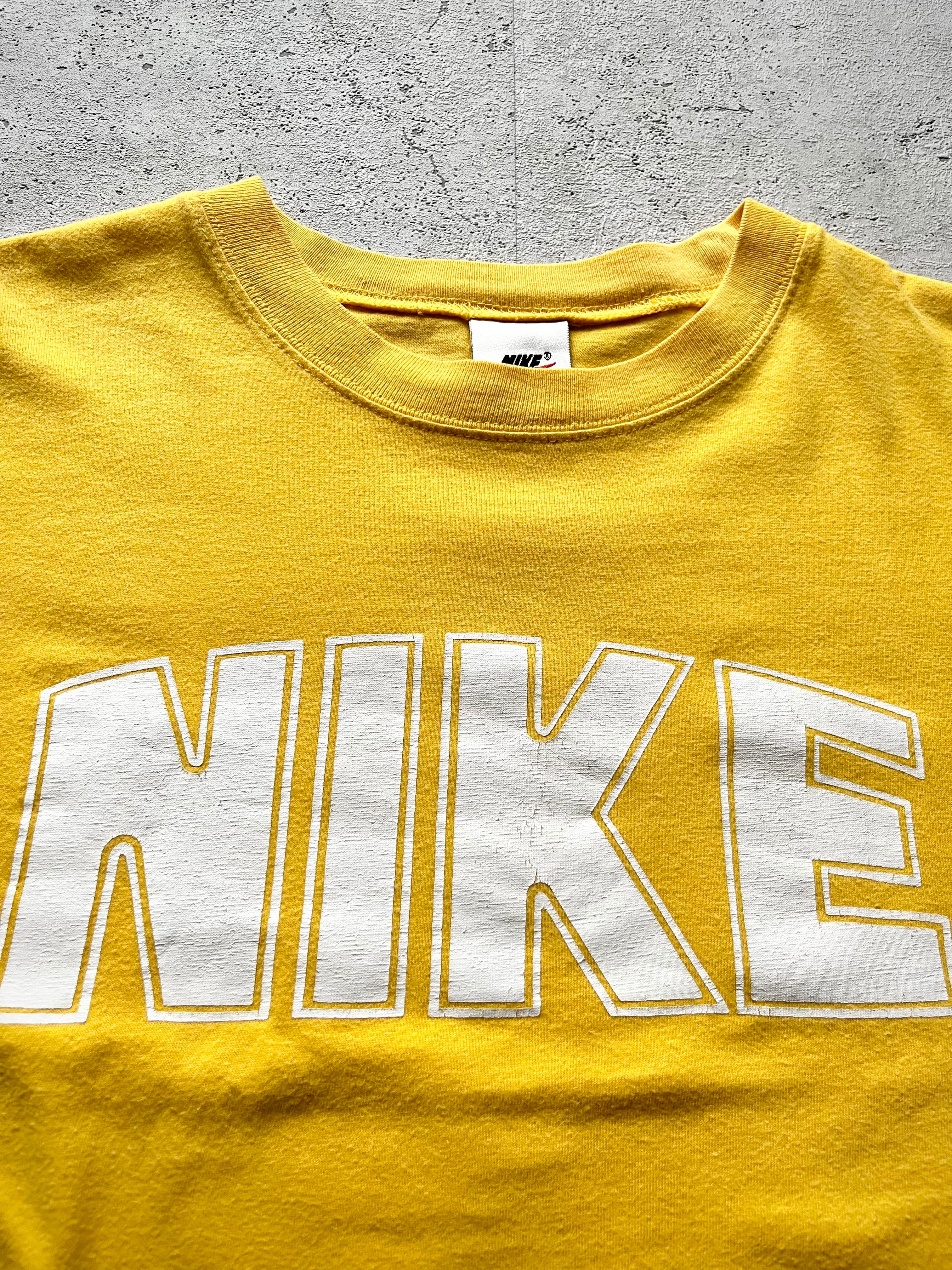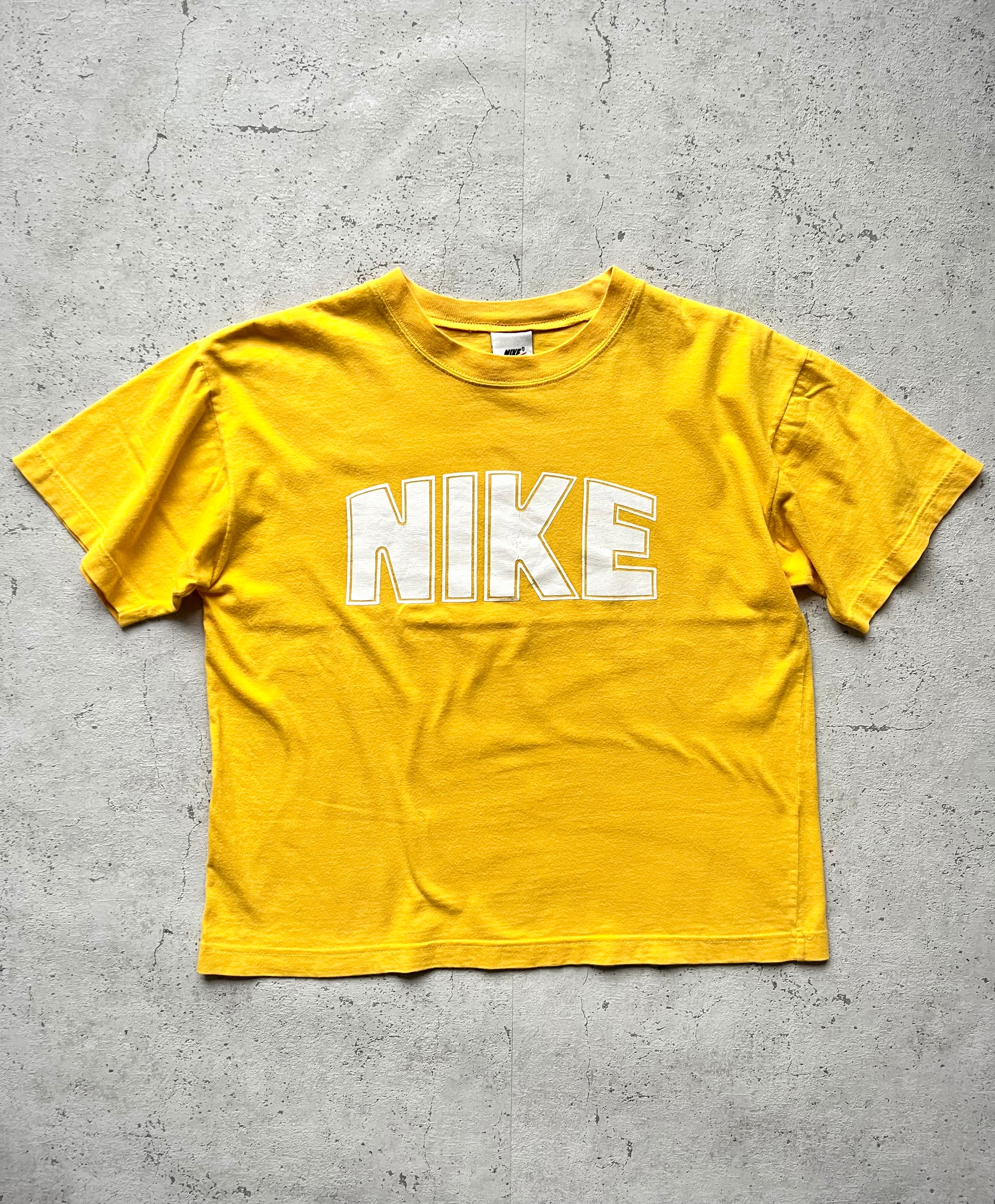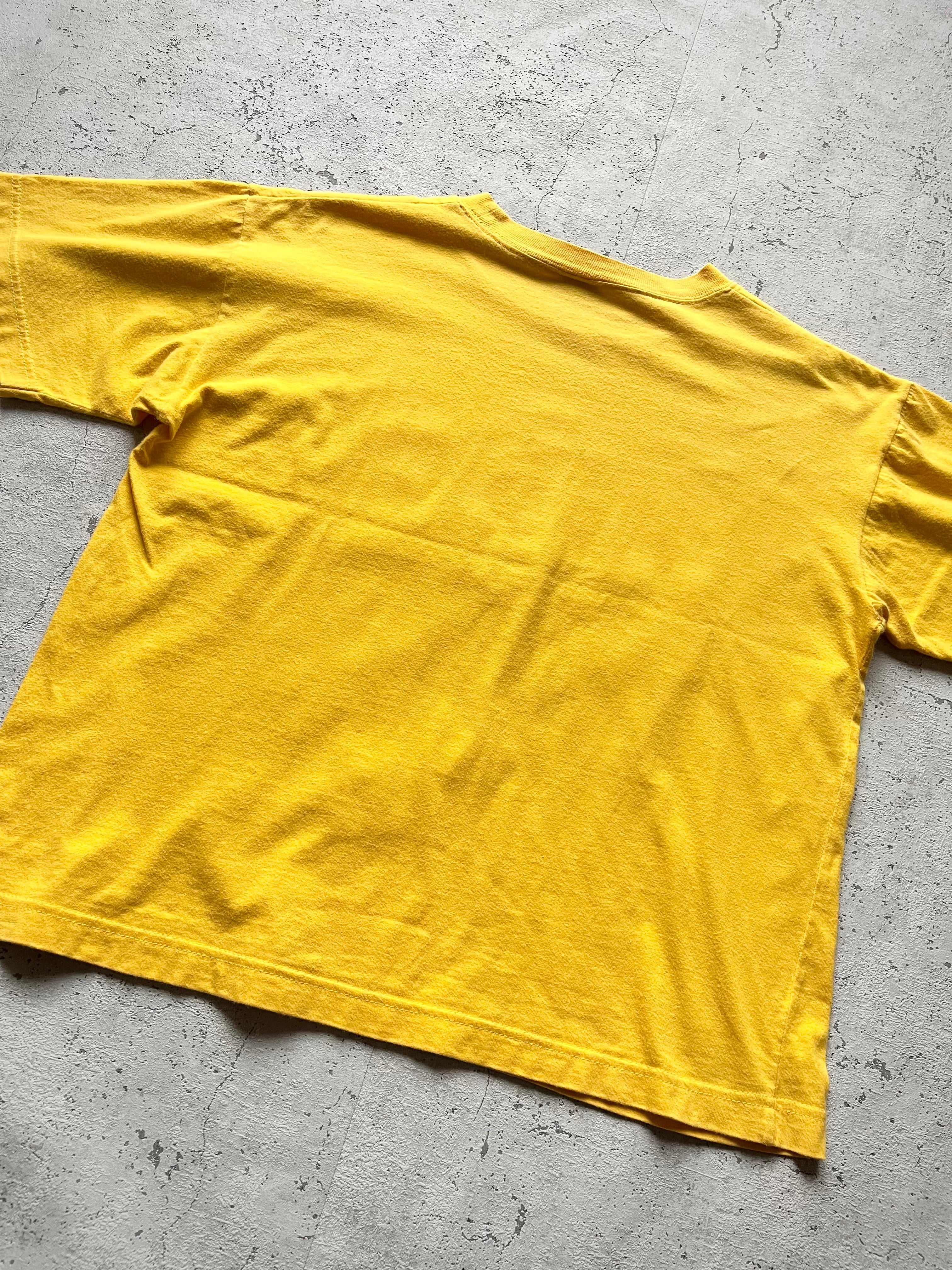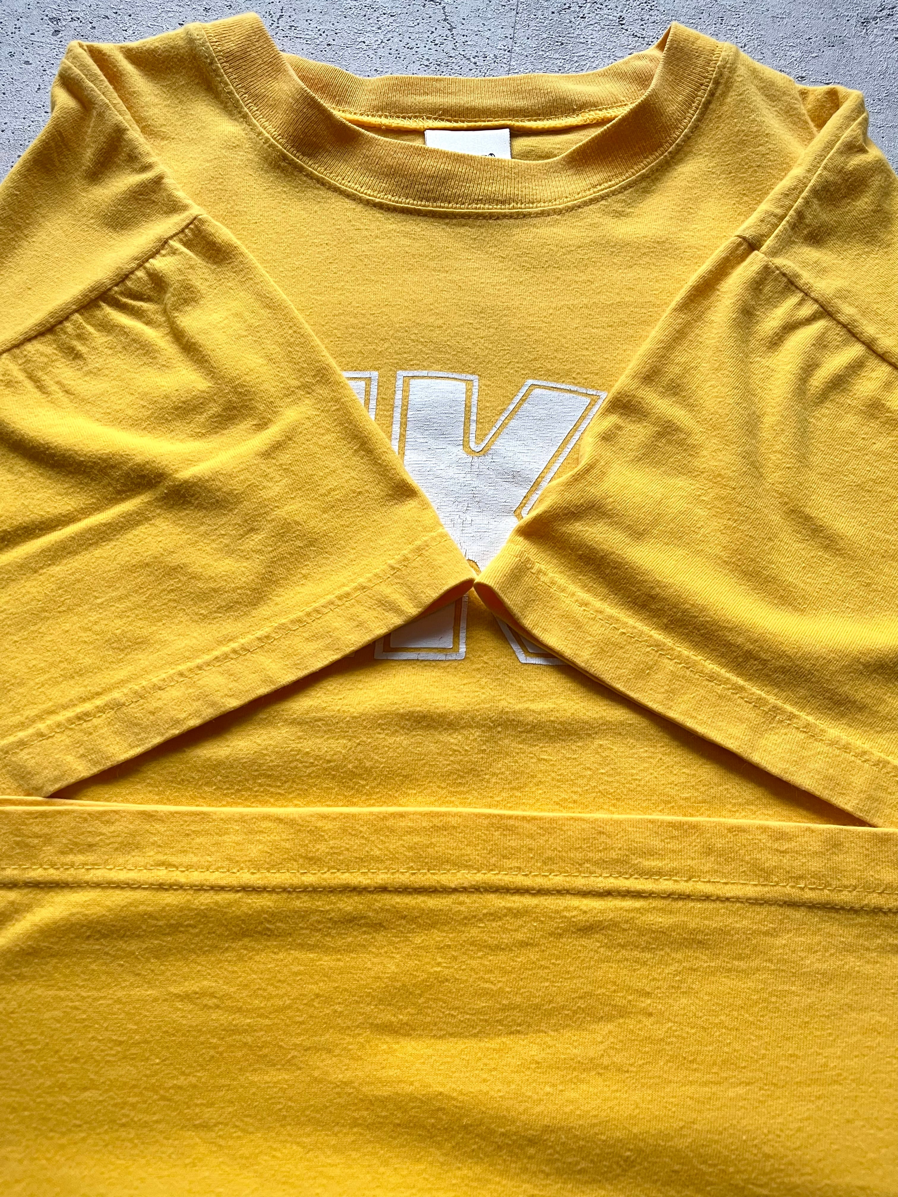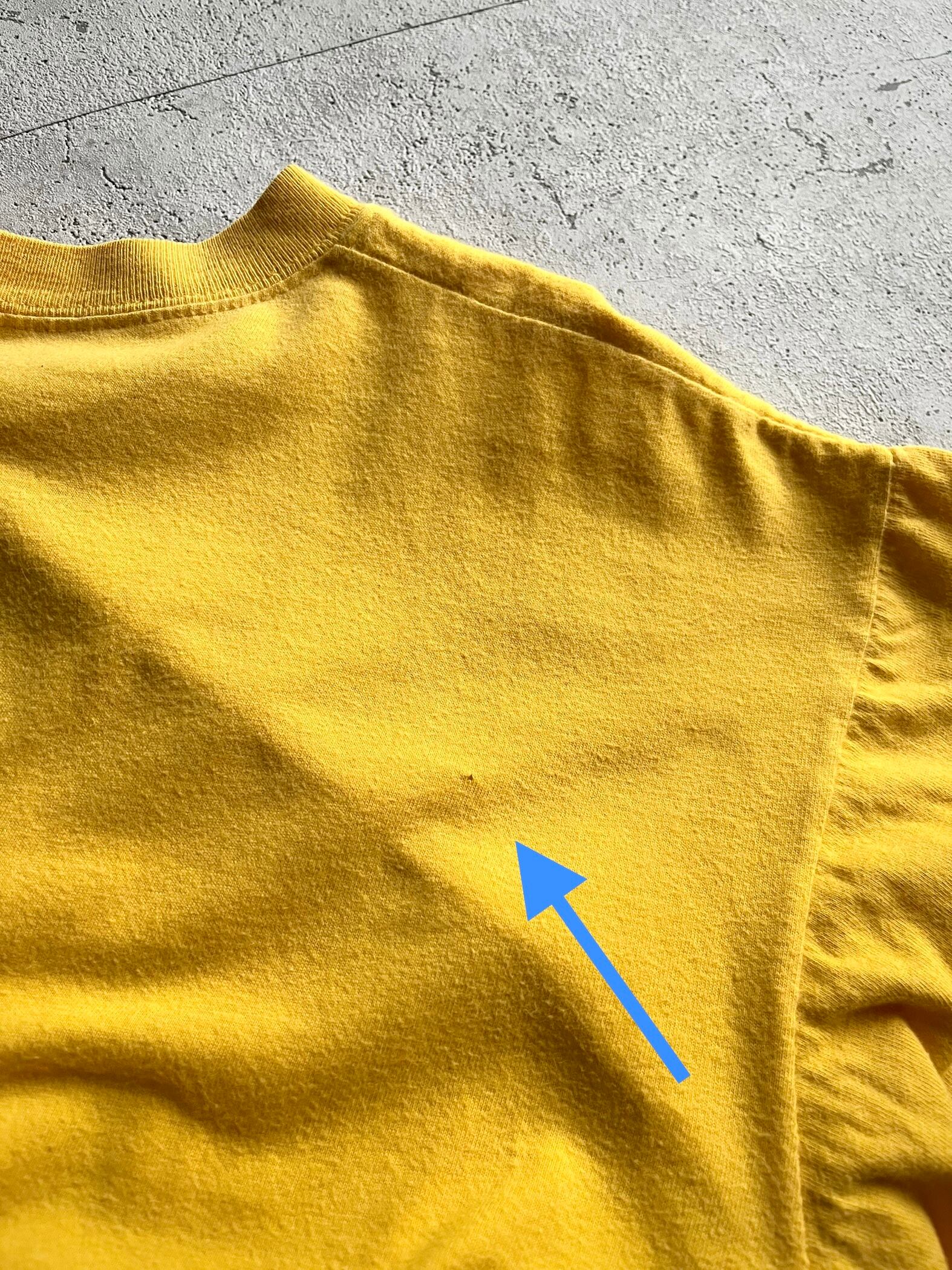 イエローボディにホワイトロゴとバランスの良いカラーリング、サイズ表記が欠損しており定かではありませんが着丈の短さからおそらくボーイズorレディースサイズと思われる当時物ならではの1枚。
