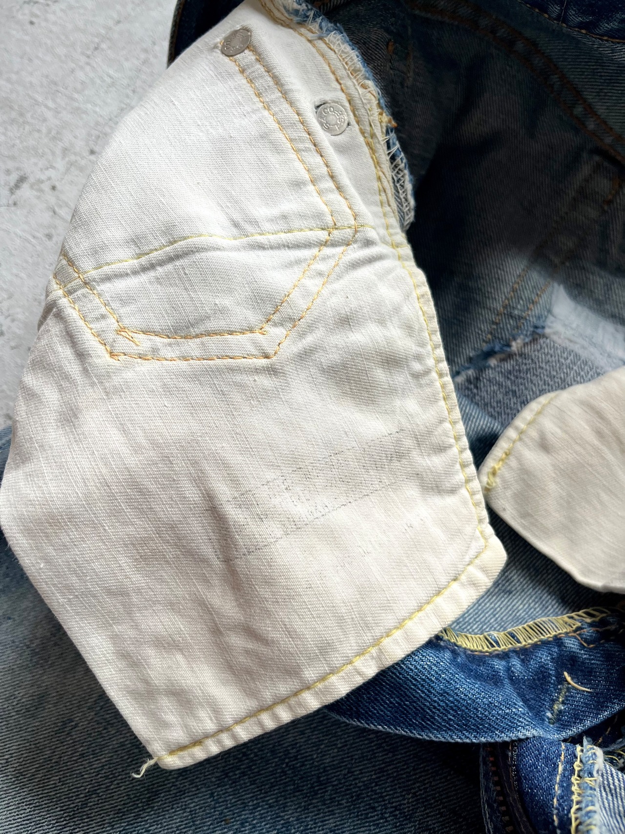 経年により変化したフロントの無数のヒゲがとてつもないオーラを放ち年代としても嬉しいビッグE〜移行期頃の“805”ビンテージ、色落ちやダメージ.リペア等はありますがこれからのシーズンには最適な雰囲気の良いカットオフデニム だと思いますので、お好きな方や探されていた方は是非この機会にいかがでしょうか。