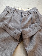 全体的な印象としては50sを彷彿とさせるクラシックな佇まい、どこか上品で品格を纏ったハウンドトゥースにリネン100%と心地良いナチュラルな生地感となっており、ツータック&テーパードシルエットが新鮮にも感じる伝統的なトラウザーズ。