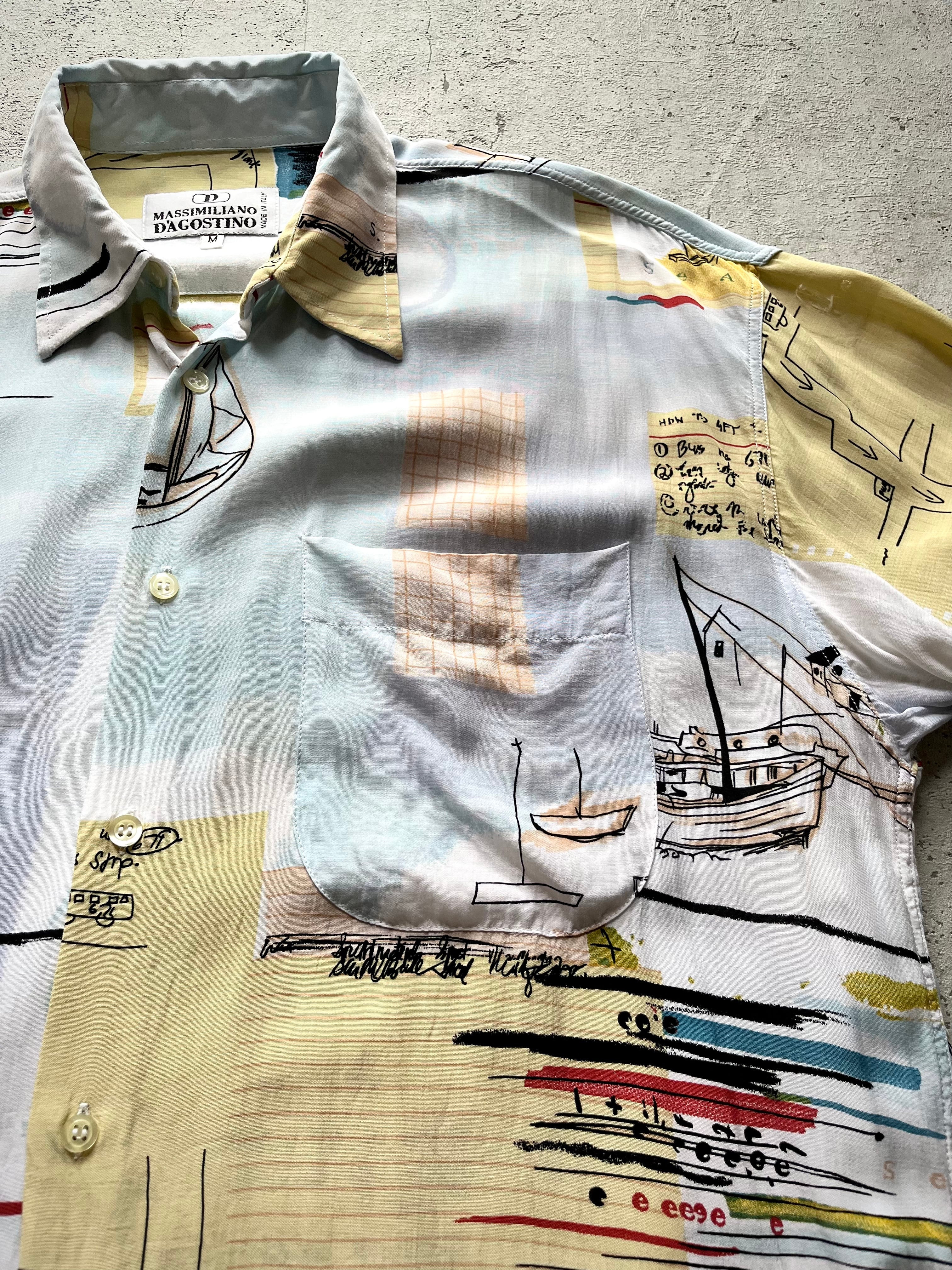90s〜 ITALY製 MASSIMILIANO D’AGOSTINO ALL-OVER PATTERN RAYON SHIRT OLD VINTAGE イタリア製 マッシミリアーノ ダゴスティーノ アート柄 レーヨンシャツ オールド ビンテージ