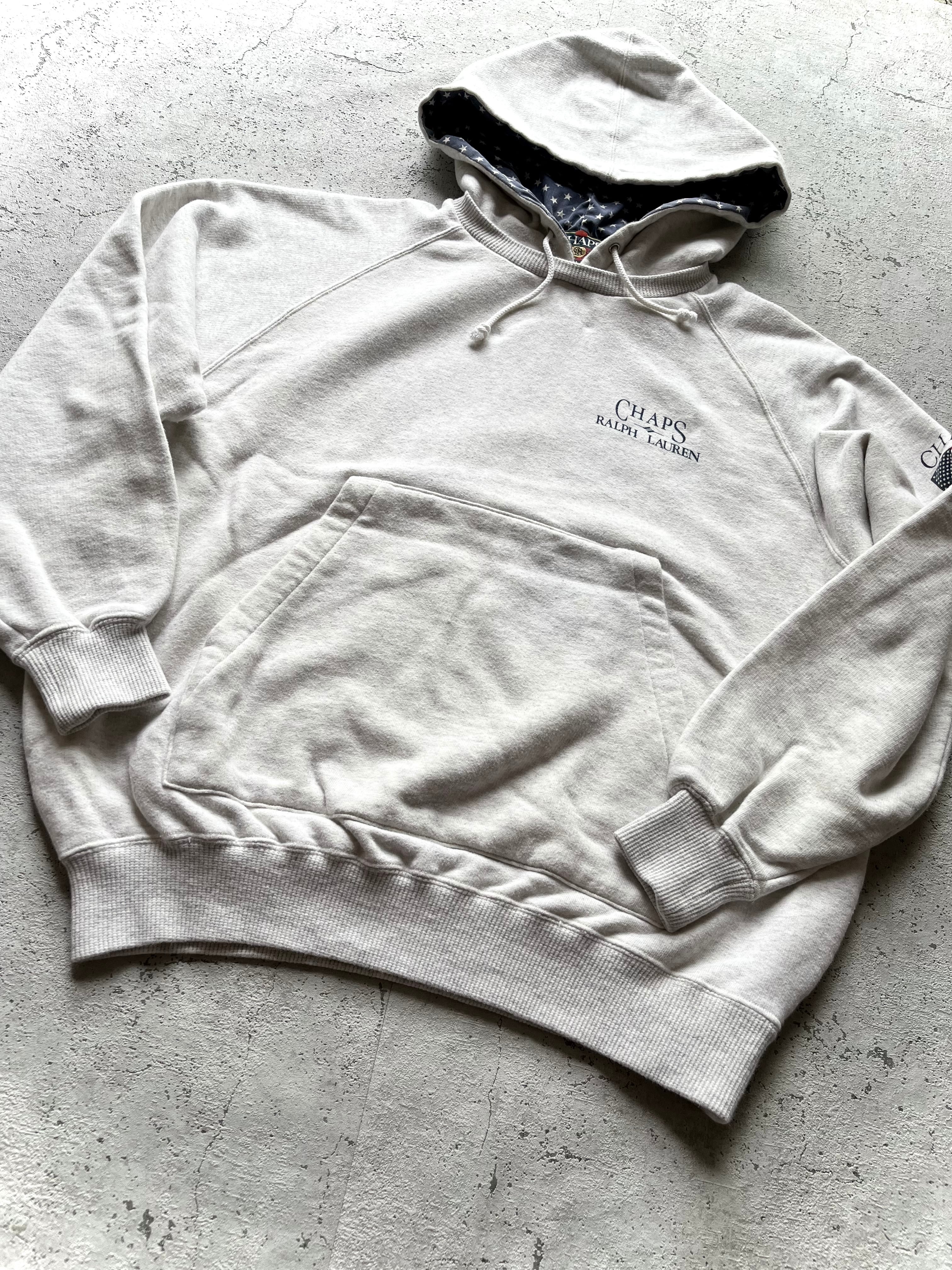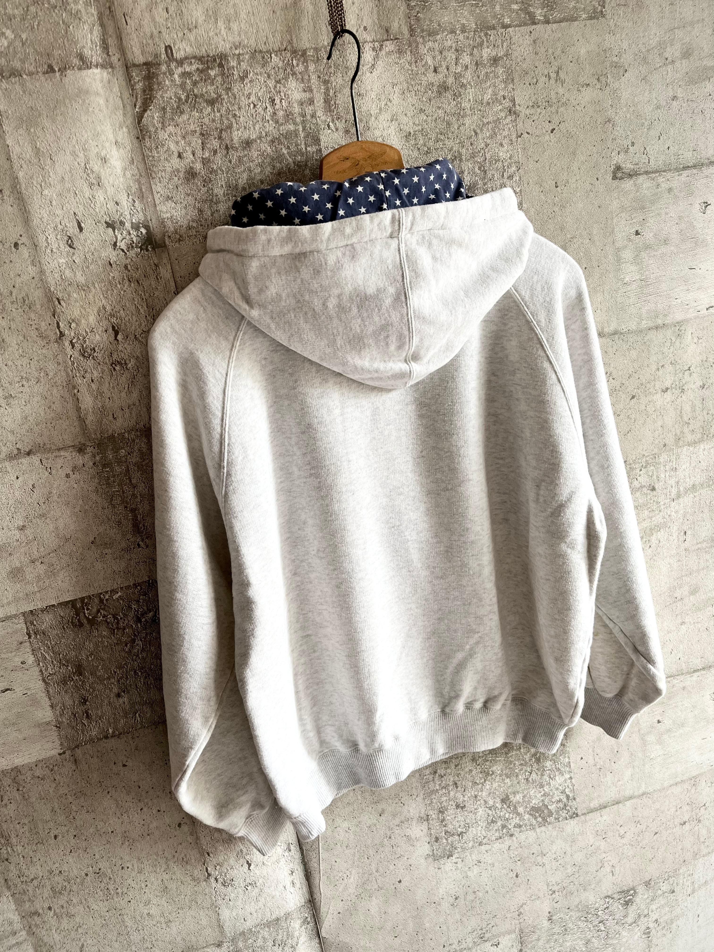 フラットなC/Nスウェットの内側に後からフードが付けられた通称“後付け”タイプのカジュアルなスウェットパーカー、フロントや袖にはCHAPSのブランドロゴや星条旗がデザインされフードの内側には星柄のコットン生地が張り付けられたラルフローレンらしい遊びのある仕上がりとなっております。