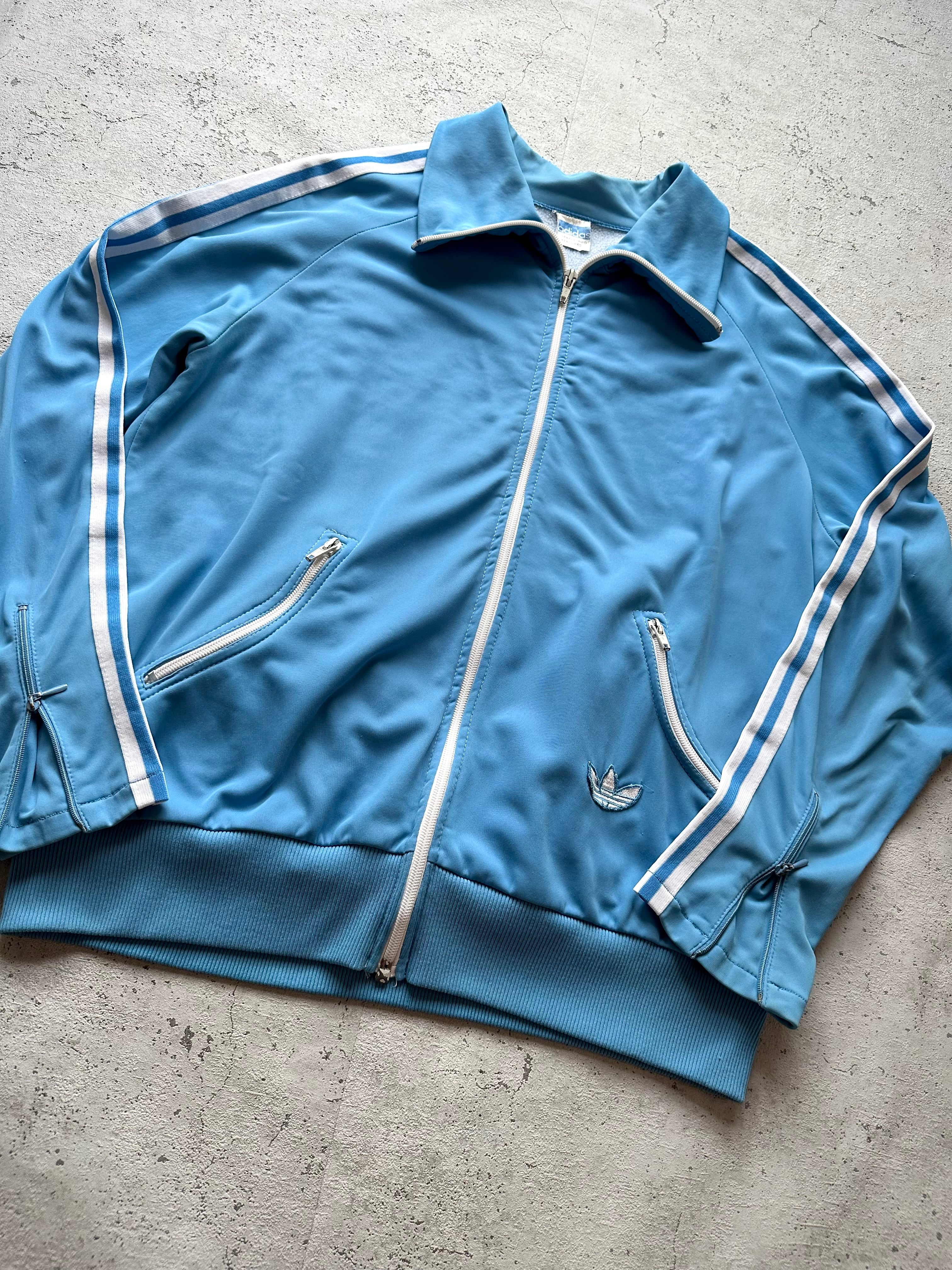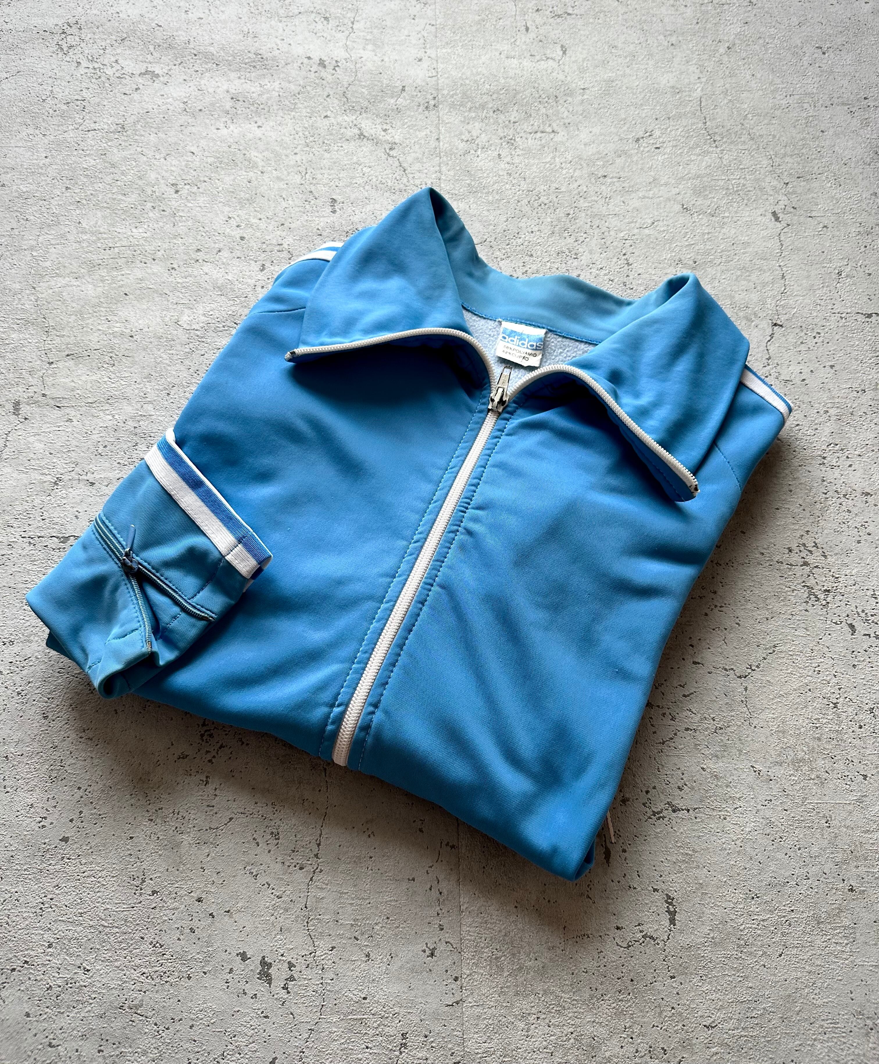 この年代ではよく見受けられるスタイリッシュなスタンドカラータイプ、ジップを開くと少し大きな襟型や曲線を描くフロントポケットに袖先のジップや裾のトレフォイルが特徴的となった少し珍しいデザインのトラックジャケット。