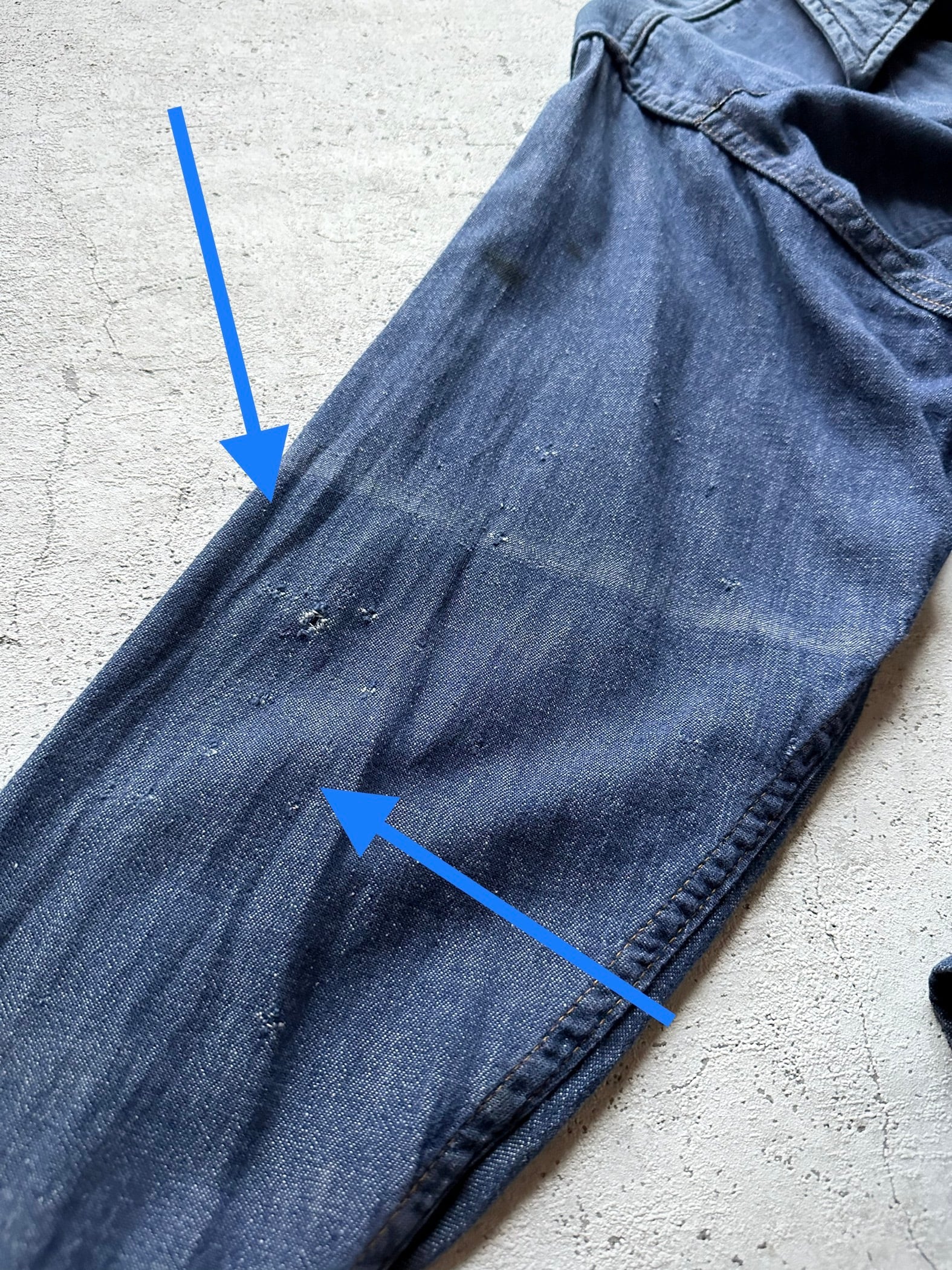 ビンテージならではの多少使用感,細かいスレ,アタリ.フェード,右袖中部や左剣ボロ.腰付近に小穴が少々見受けられますが、その他,着用に支障のある目立つような汚れや大きなダメージは見受けられません。