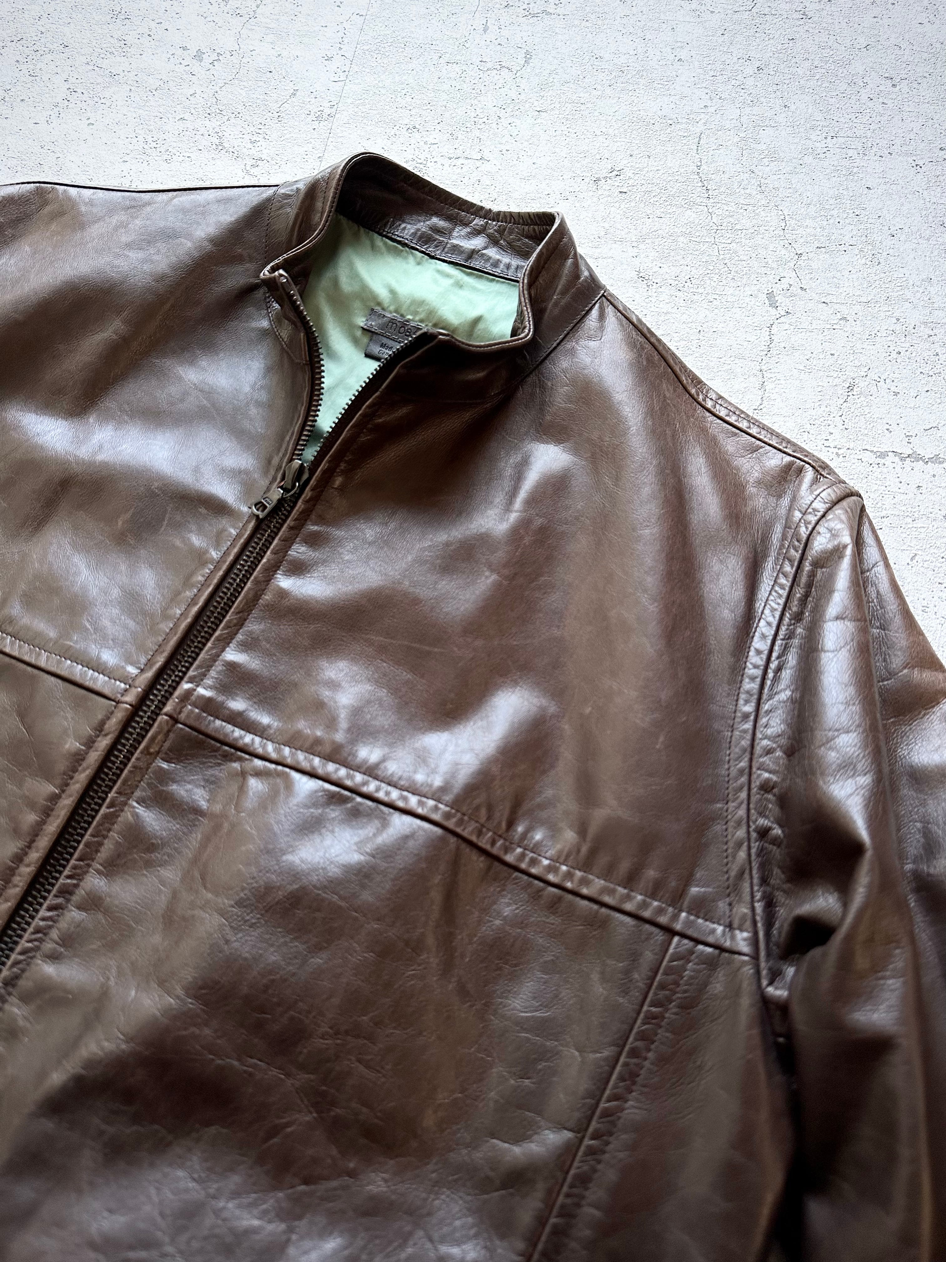 シンプルでモダンなデザインが特徴的な無駄の無い佇まい、ブランドの得意とするアニリン仕上げのベジタブルタンニンにて鞣されたレザーの雰囲気は非常に良く比較的ライトな革質なのでオールシーズンにて着用できるスタイリッシュなレザージャケットです。