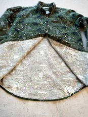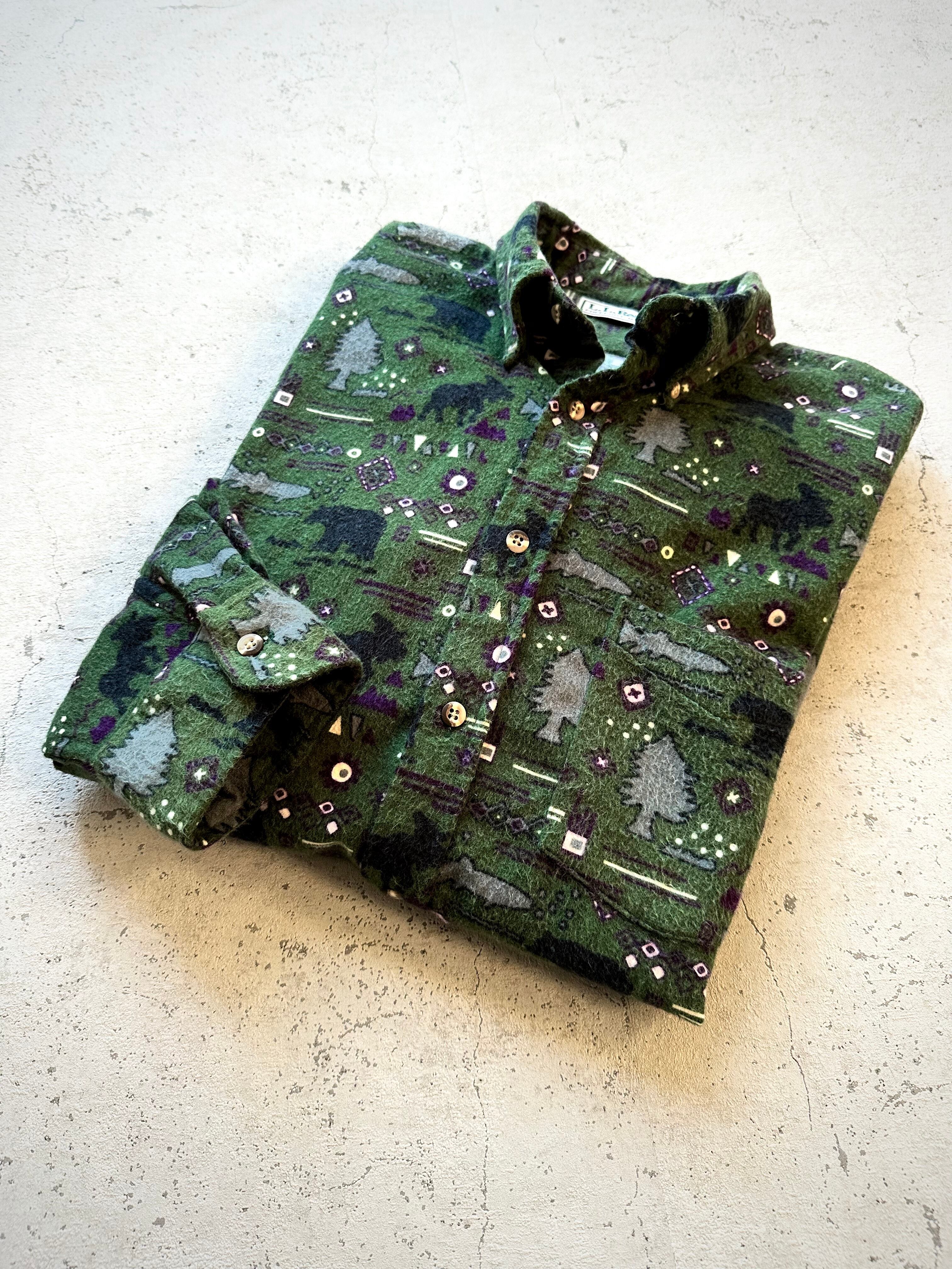 しっかりとコシのあるオールコットン仕立てにネル特有のふんわりとした素材感が魅力的な雰囲気の良いオールドシリーズ、アニマル,フィッシュ,ツリー等がコミカルにデザインされグリーンのベースカラーも絶妙にマッチしたグッドデザインなボタンダウンシャツ。