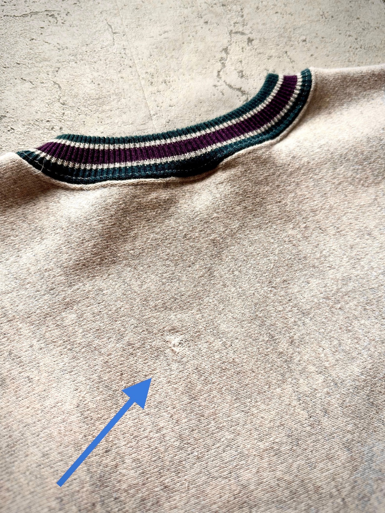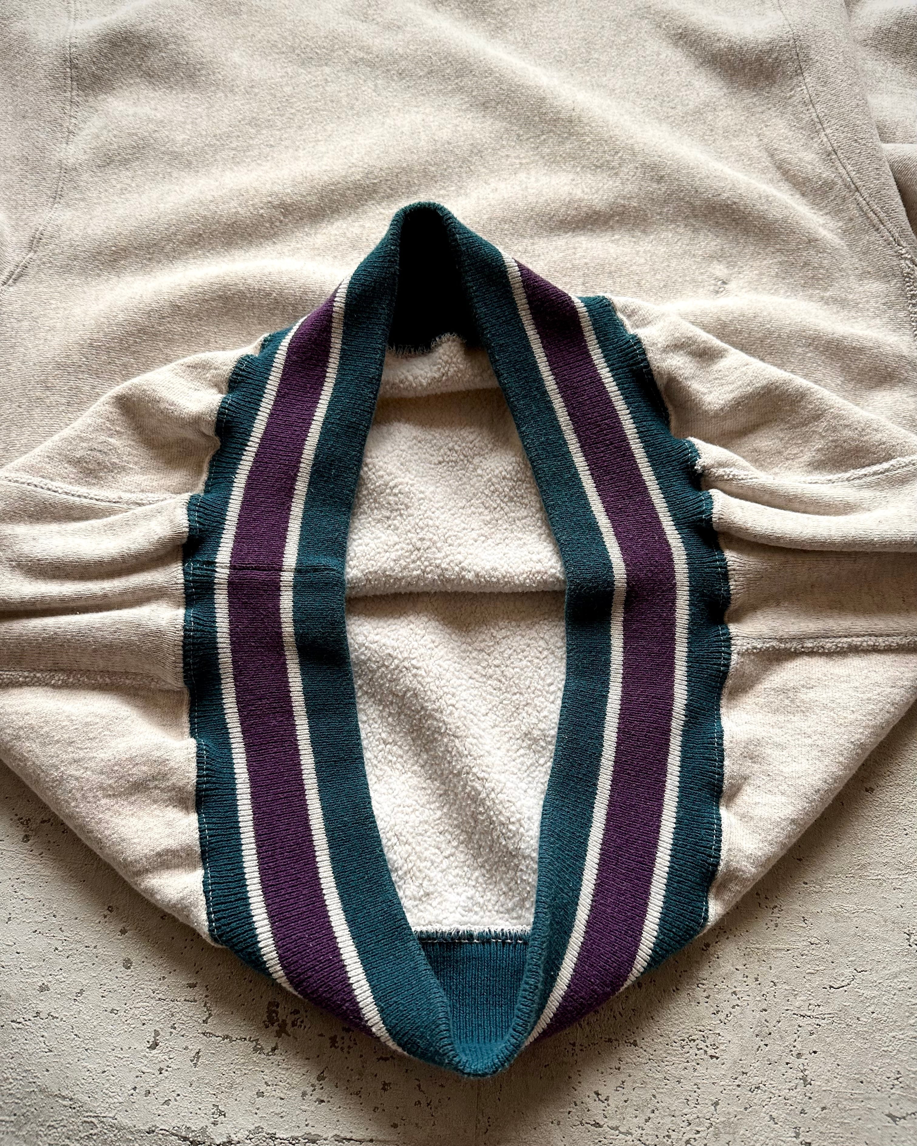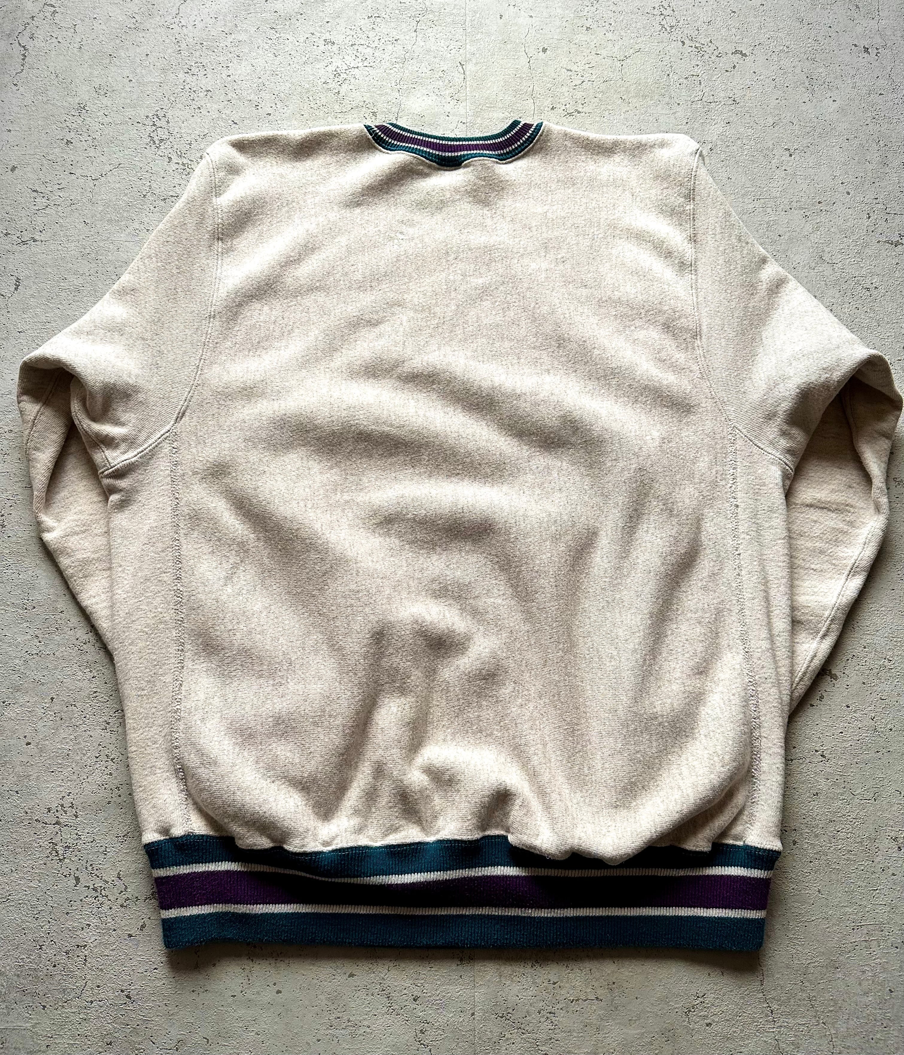 タグはお馴染み“ ホワイト×ブルー×レッド ”にてデザインされた90年代.刺繍トリコタグ期のビンテージオリジナル、“REVERSE WEAVE”としては高い人気を誇るレアな目無しバージョンに少し生成りが混ざったオートミール系のリブライン.ツートンパターンになります。