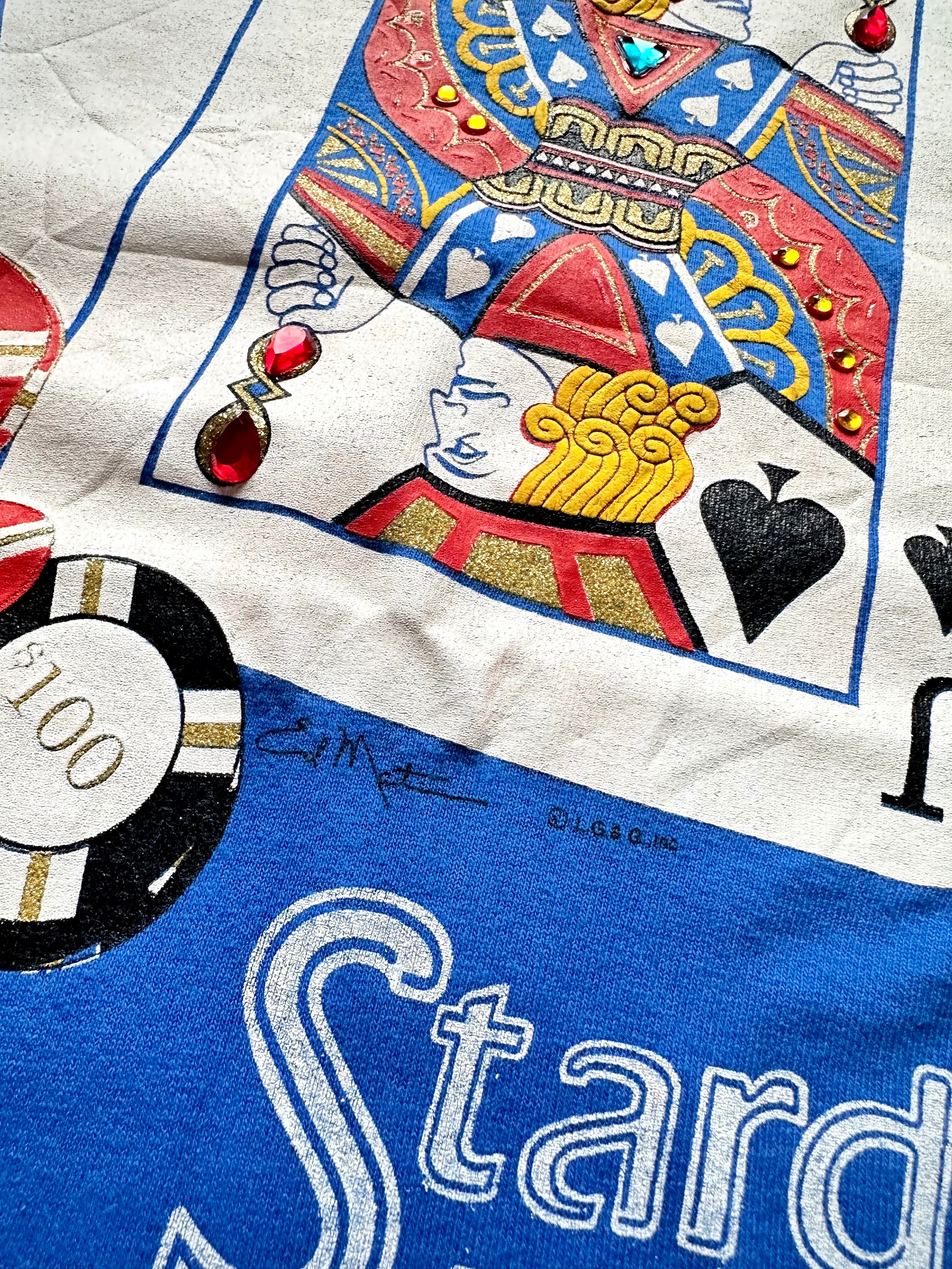 インパクトのあるトランプやカジノチップに袖先のスタッズやフロントのラインストーンとアレンジも加えられたユニークで遊び心も感じられるアメリカらしい仕上がり。