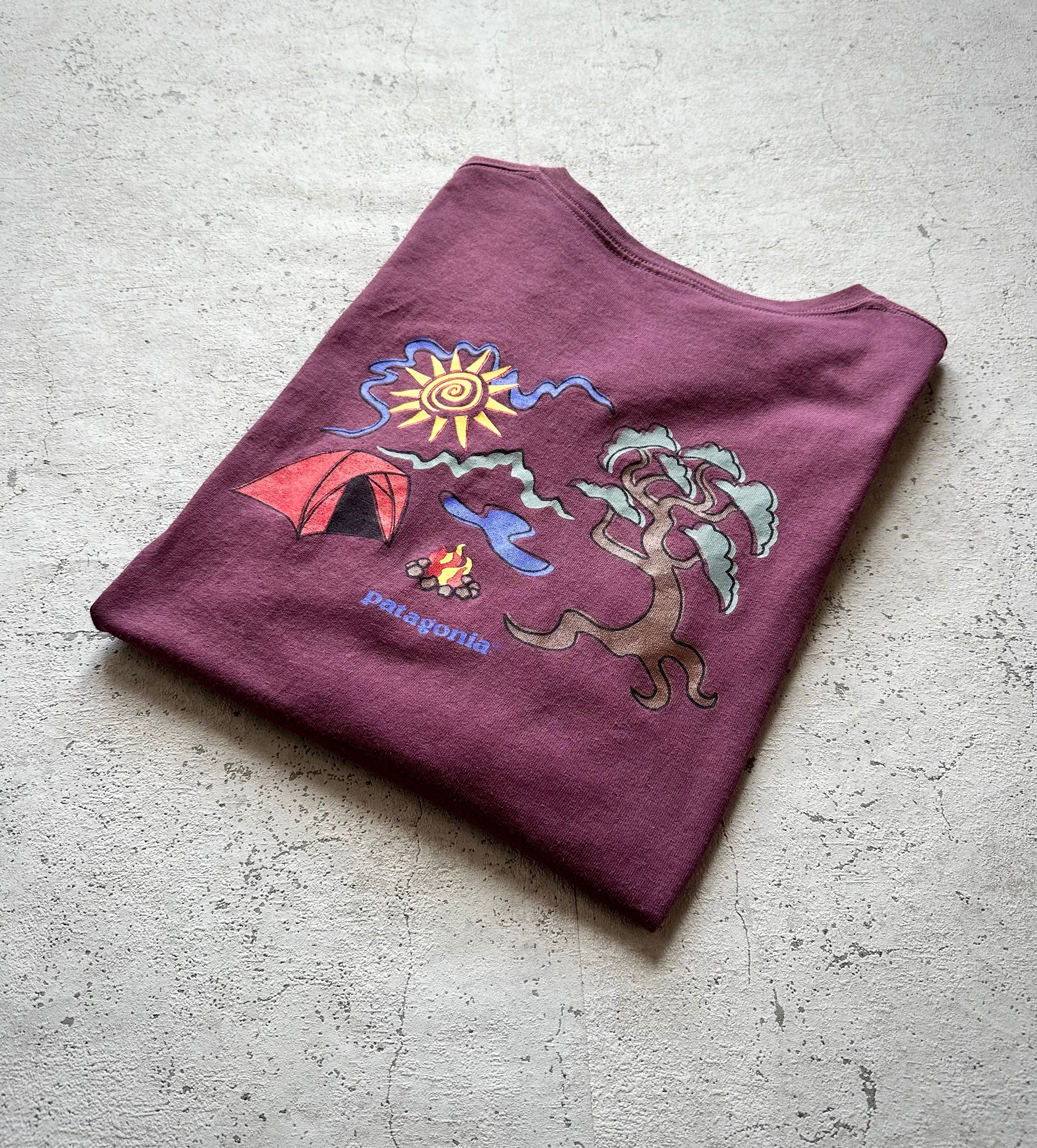 PATAGONIAのTシャツシリーズとしてはお馴染みのBENEFICIAL-T’Sをベースにした少し古いオールドシリーズ、90年代頃には多く展開されていた少しポップに描かれたキャンプ風景が特徴的なグッドデザインな1枚です。
