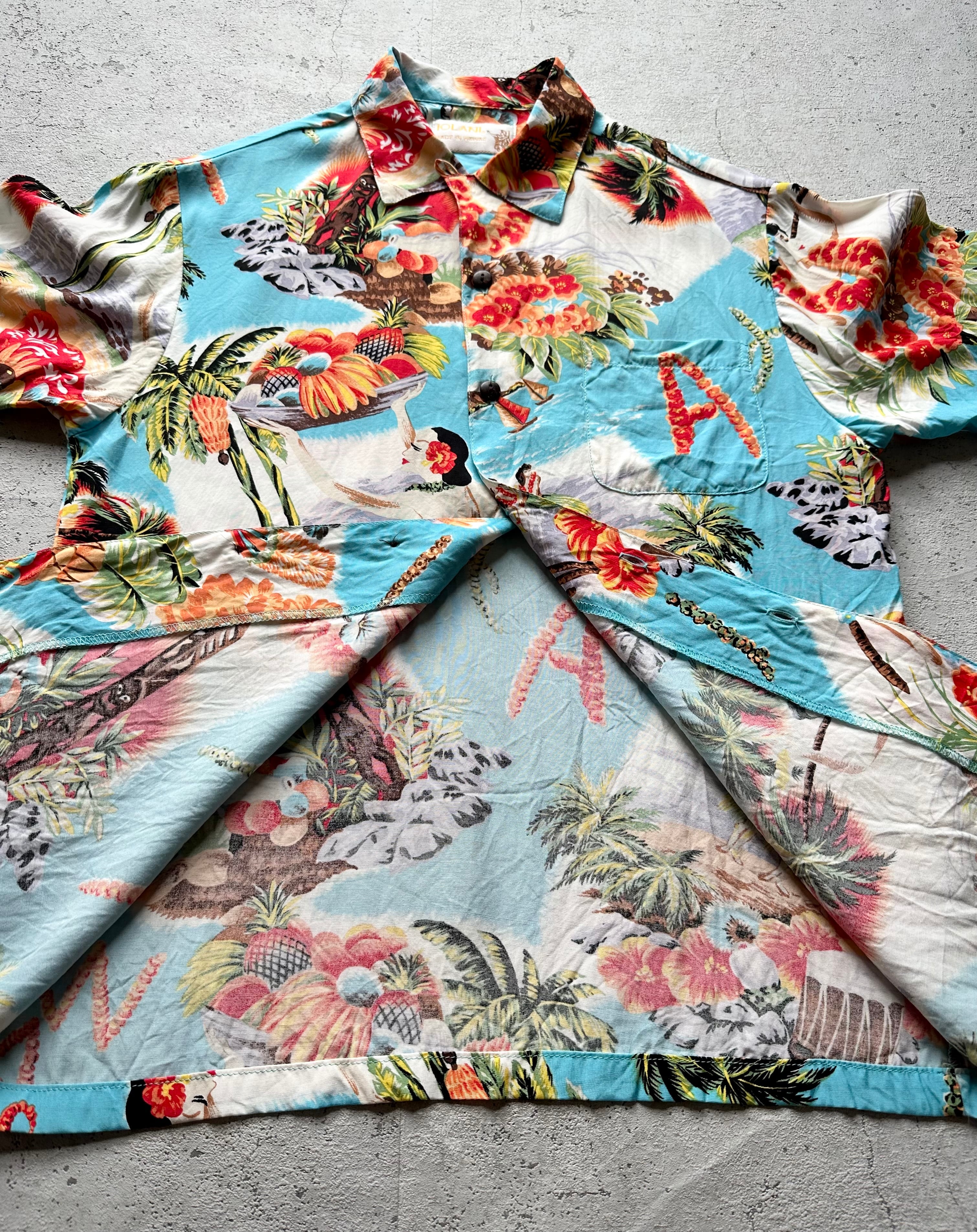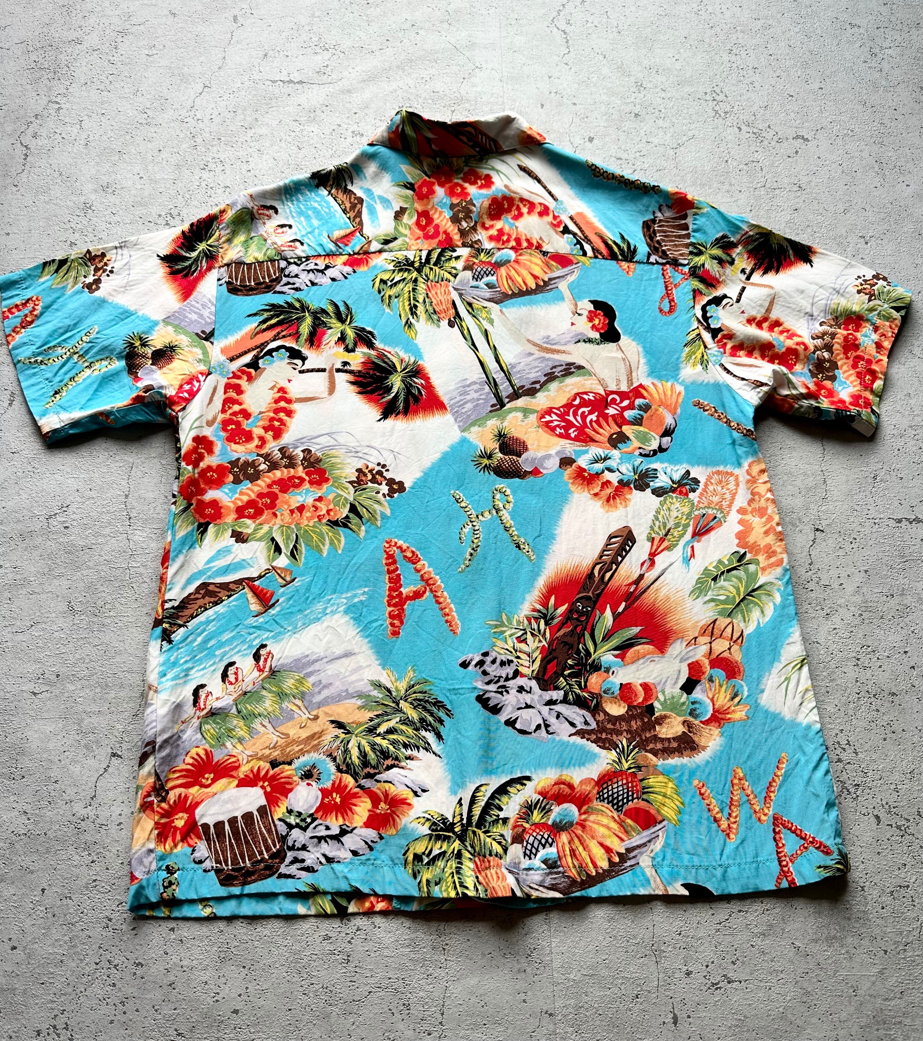 フラガールやレイ,パームツリーといったトロピカルな南国の風景が魅力的ないつの時代も愛されている王道のハワイアンシャツ、50sの雰囲気を味わいながらも気兼ねなく着用できる1枚だと思いますので、お好きな方や探されていた方は是非この機会にいかがでしょうか。