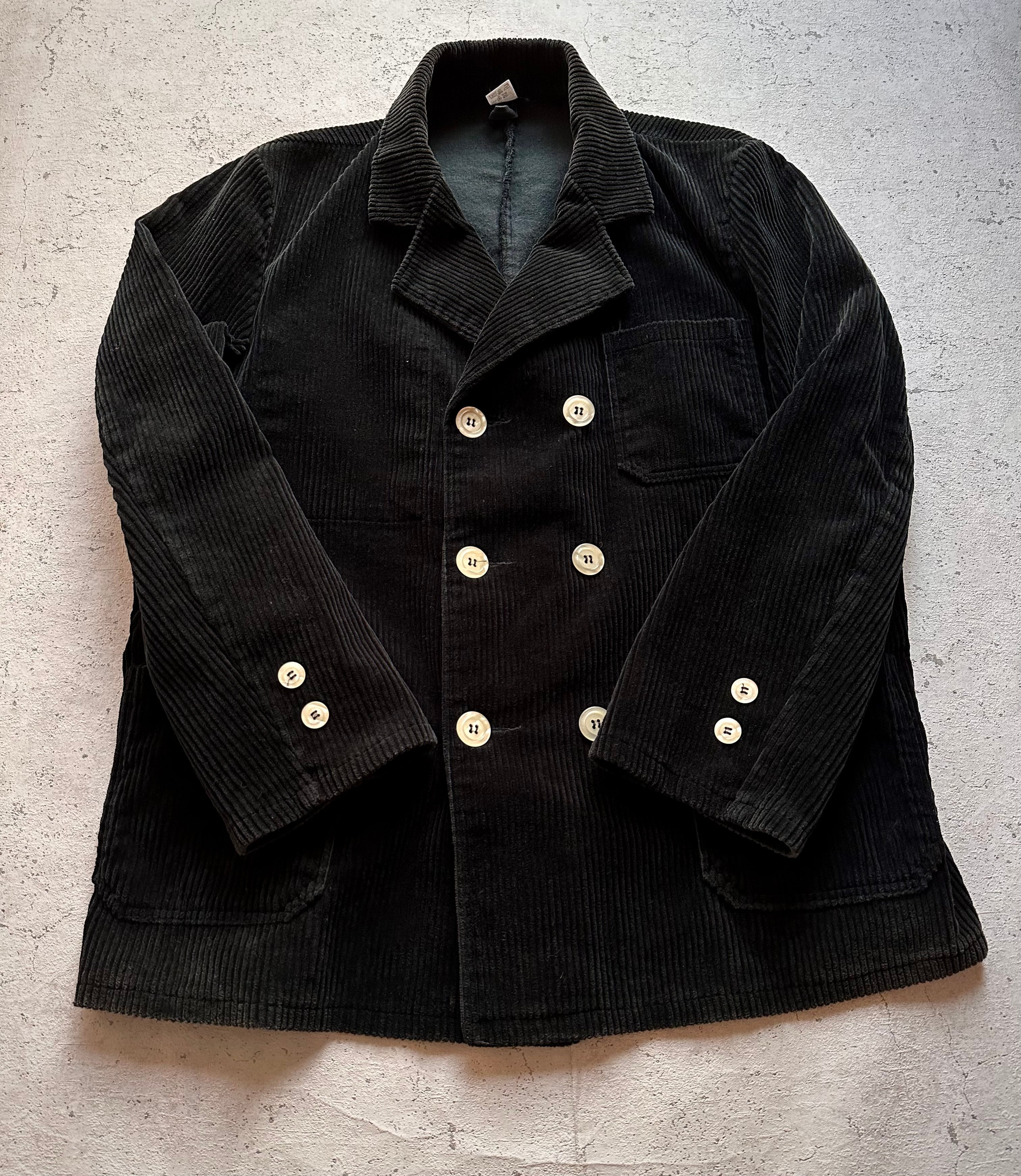上品で程良い光沢を纏いしっかりとした生地感が魅力的な太畝コーデュロイのダブルブレストスタイル、フロントのパッチポケットに少し大きめなダブルボタンとユーロではお馴染みのデザインですが出現率の低い黒々としたブラックベースが非常に良い雰囲気を醸し出すスタイリッシュな1枚です。