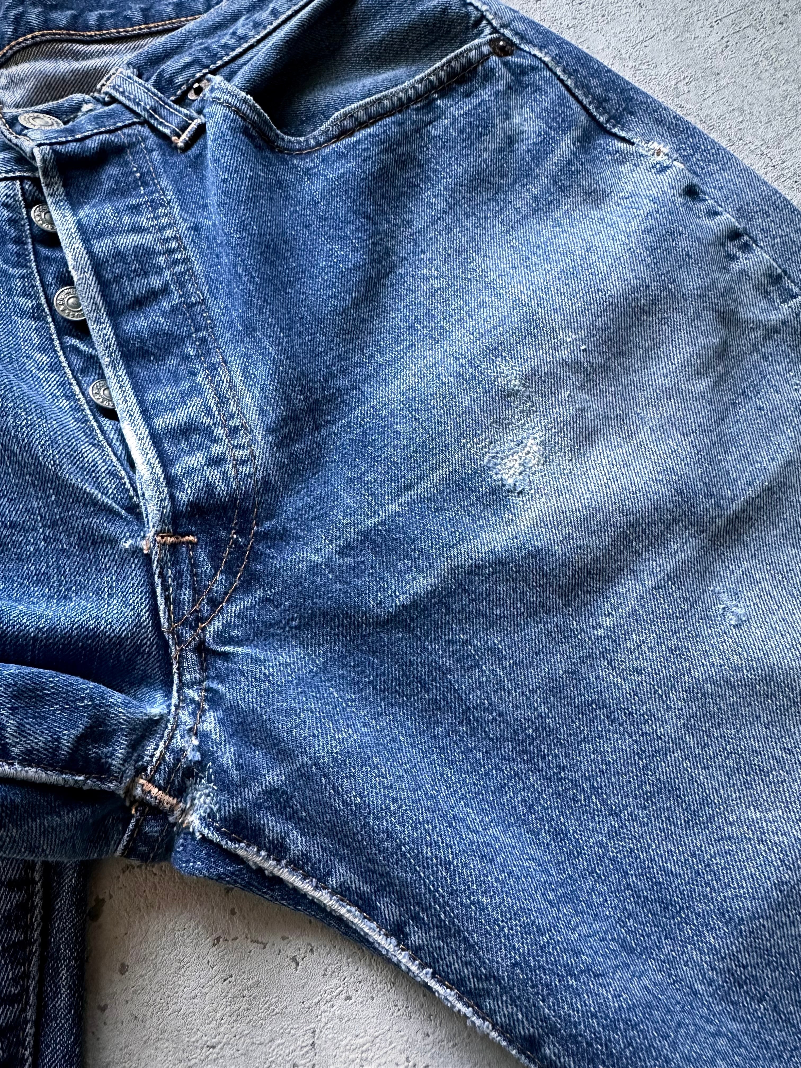 完全に取れてしまっておりますが僅かに確認できる501のデカ文字に艶感のある紙パッチ,随所に見受けられるイエローステッチや足長Rボタンにトップ裏8刻印,サイドの赤耳や不均等のBig-EタブとVINTAGEならではのディティール満載な雰囲気の良い1本です。