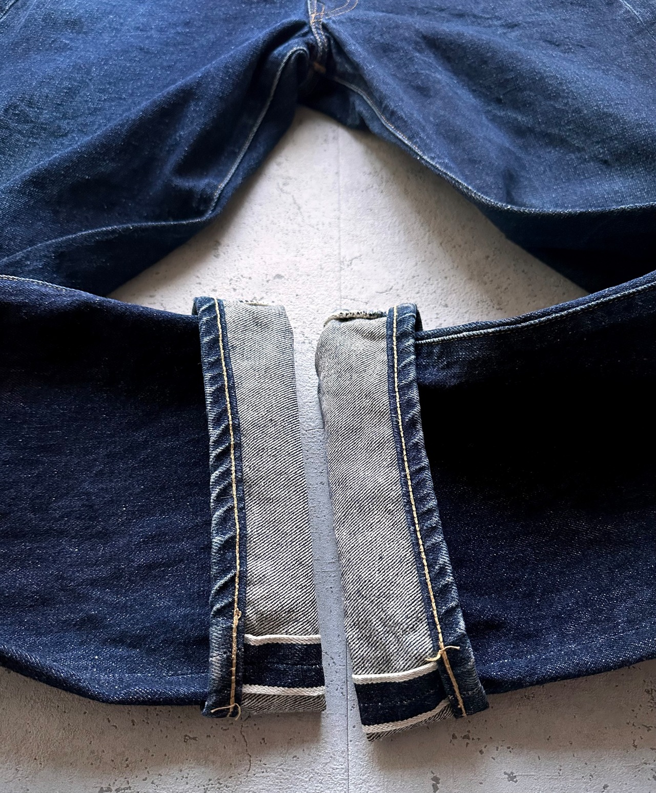 VINTAGEのディテールではお馴染みのギャラ入り紙パッチ、ウエストやポケットのシングルにフロントVステッチ,均等Vの両面タブや両サイド&コインポケットのセルビッジ,カモメ調アーキュエイトにイエローステッチ,ポケット内部には隠しリベット等々と当時さながらのディティール満載な仕上がりとなっております。