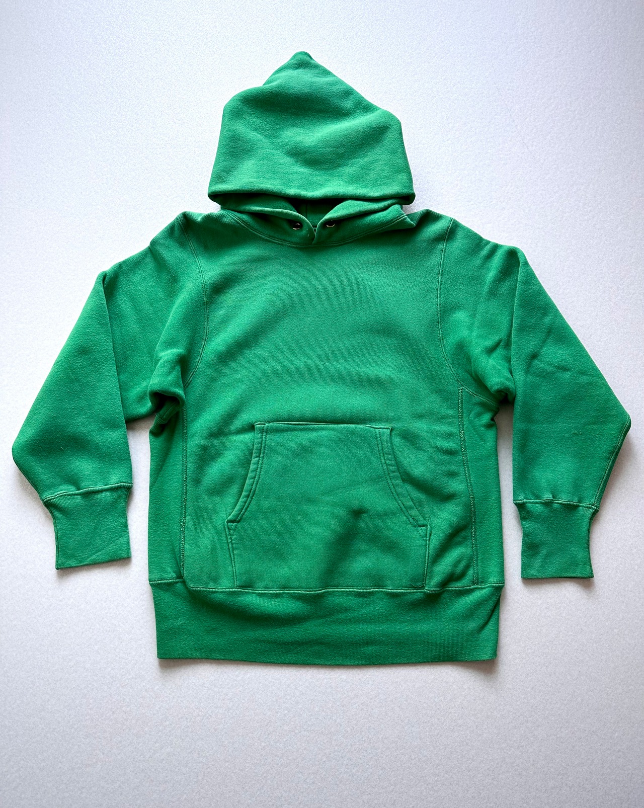 米国大手のカジュアルウェアメーカー“LANDS’END”が別注をしこの時だけに存在する三角タグ期の希少なビンテージ、“REVERSE WEAVE”としては珍しいグリーンのカラーリングに目無しのソリッドタイプと出現率が極めて低いレアな1枚です。
