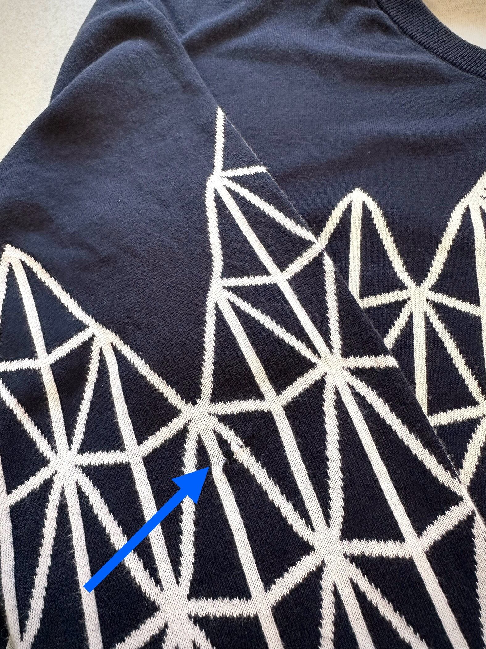 上質で滑らかな着心地が魅力的な肌触りの良いオールコットンニット、上品なネイビー&ホワイトのカラーリングに珍しい裏表の二枚仕立て,ダイヤモンドの様な幾何学模様が特徴的となった気品溢れるモダンな仕上がりとなっております。
