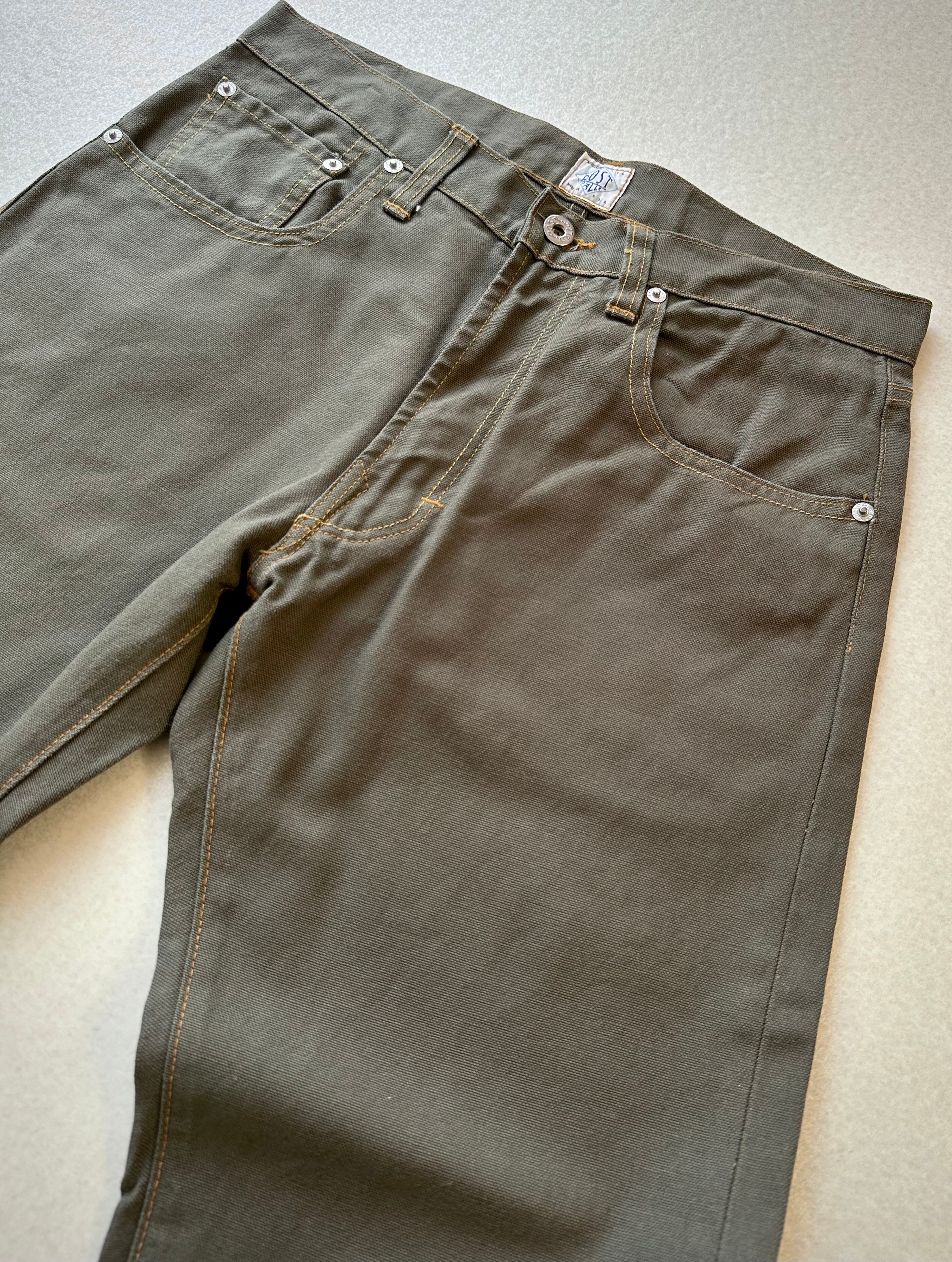 着用する度に風合いが増すワークウェアではお馴染みのコットンダック生地仕立て、シックなオリーブのカラーリングにイエロー&オレンジのステッチ使いやTTSスレーキがアクセントになったVINTAGEさながらの絶妙な雰囲気です。