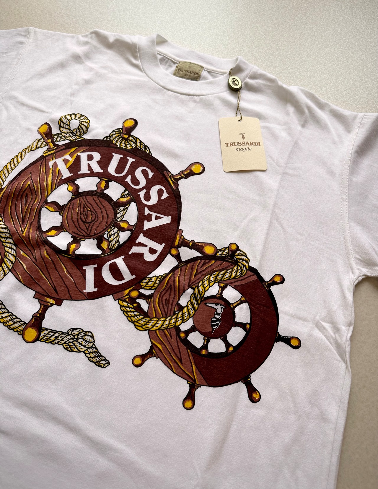 “TRUSSARDI”としては比較的珍しいマリンテイスト、船の舵輪やロープに加えてブランドロゴが大きくデザインされた90sらしいグッドな1枚です。