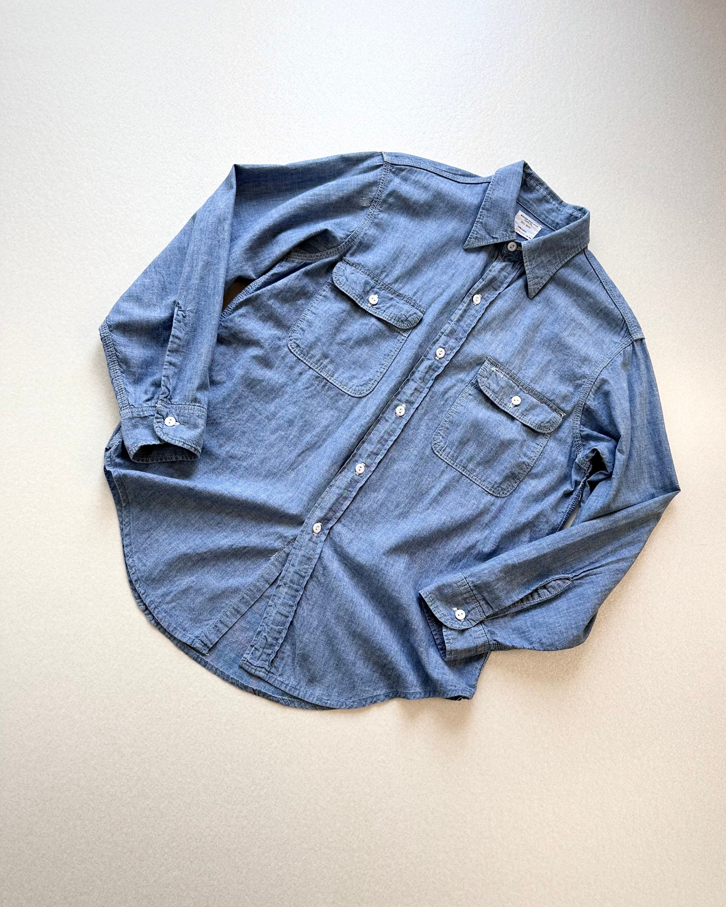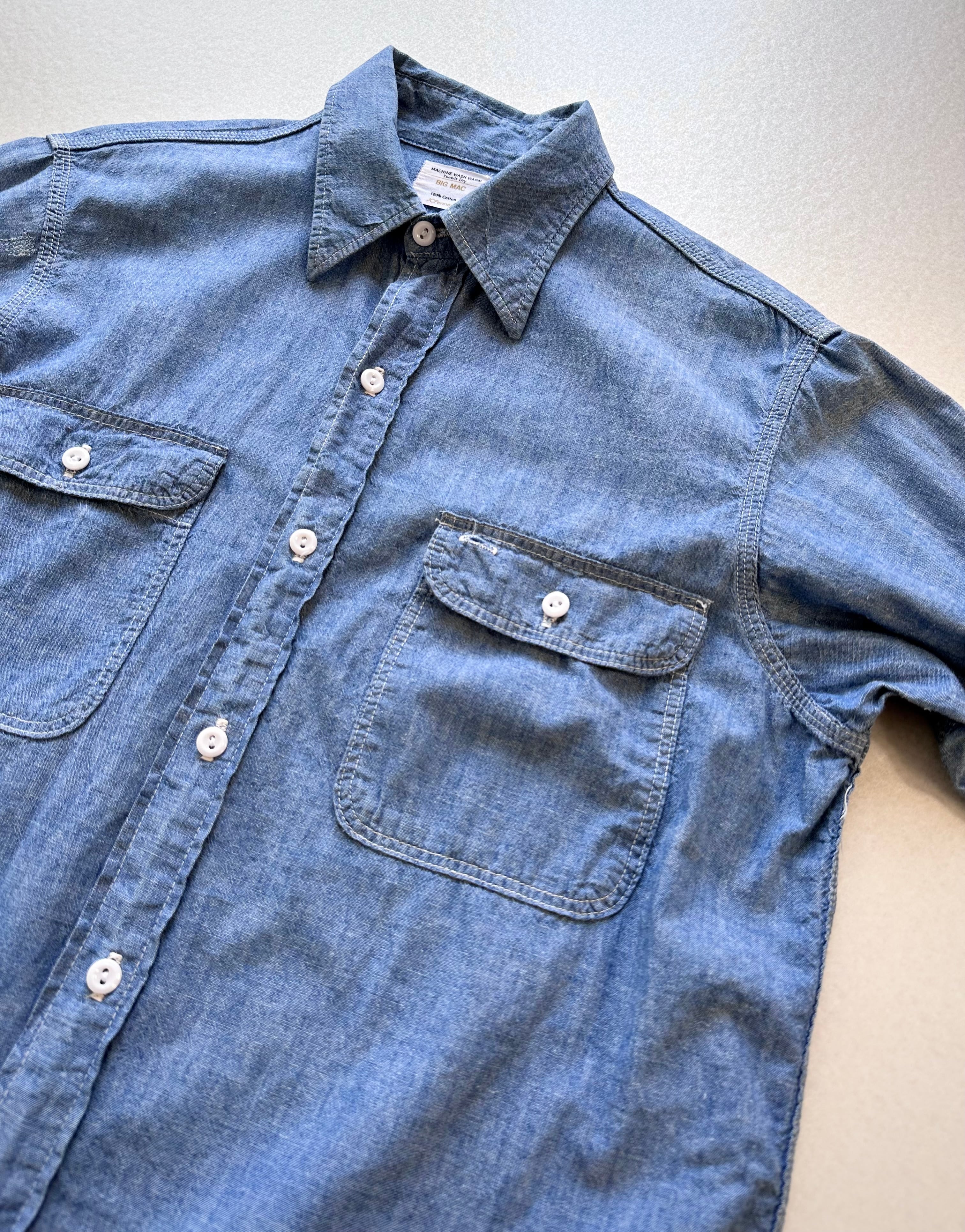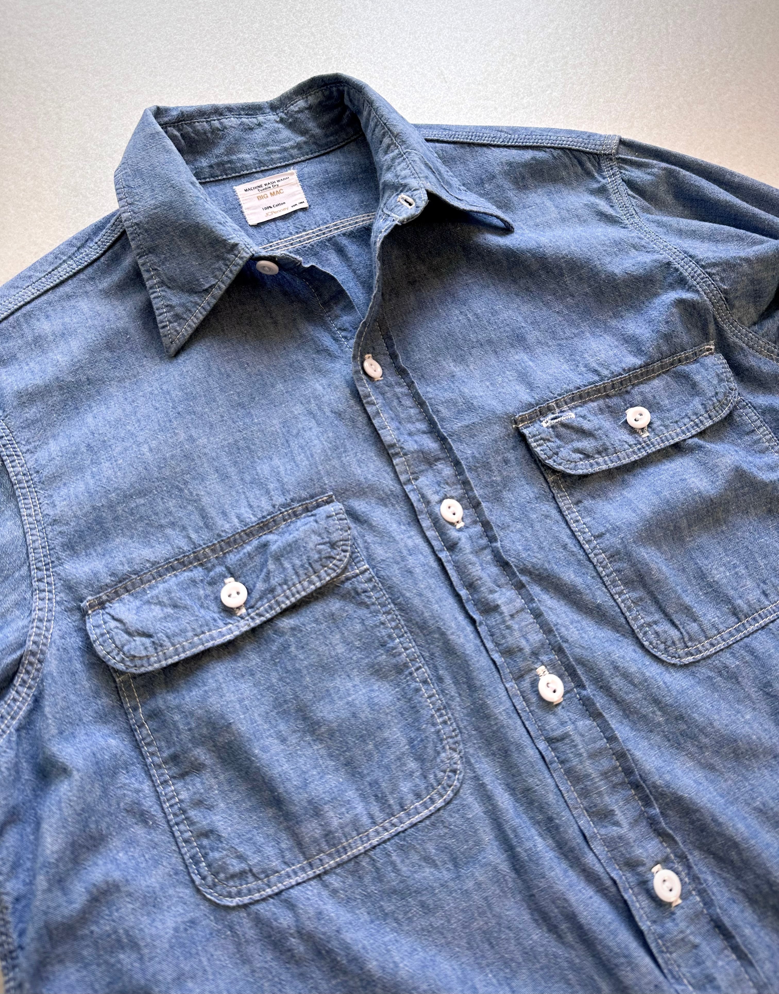 レギュラーカラーにフラップ付きパッチポケット,コシのあるオールコットンのシャンブレー生地にトリプルステッチや2ホールボタンとお手本通りのワークスタイルです。
