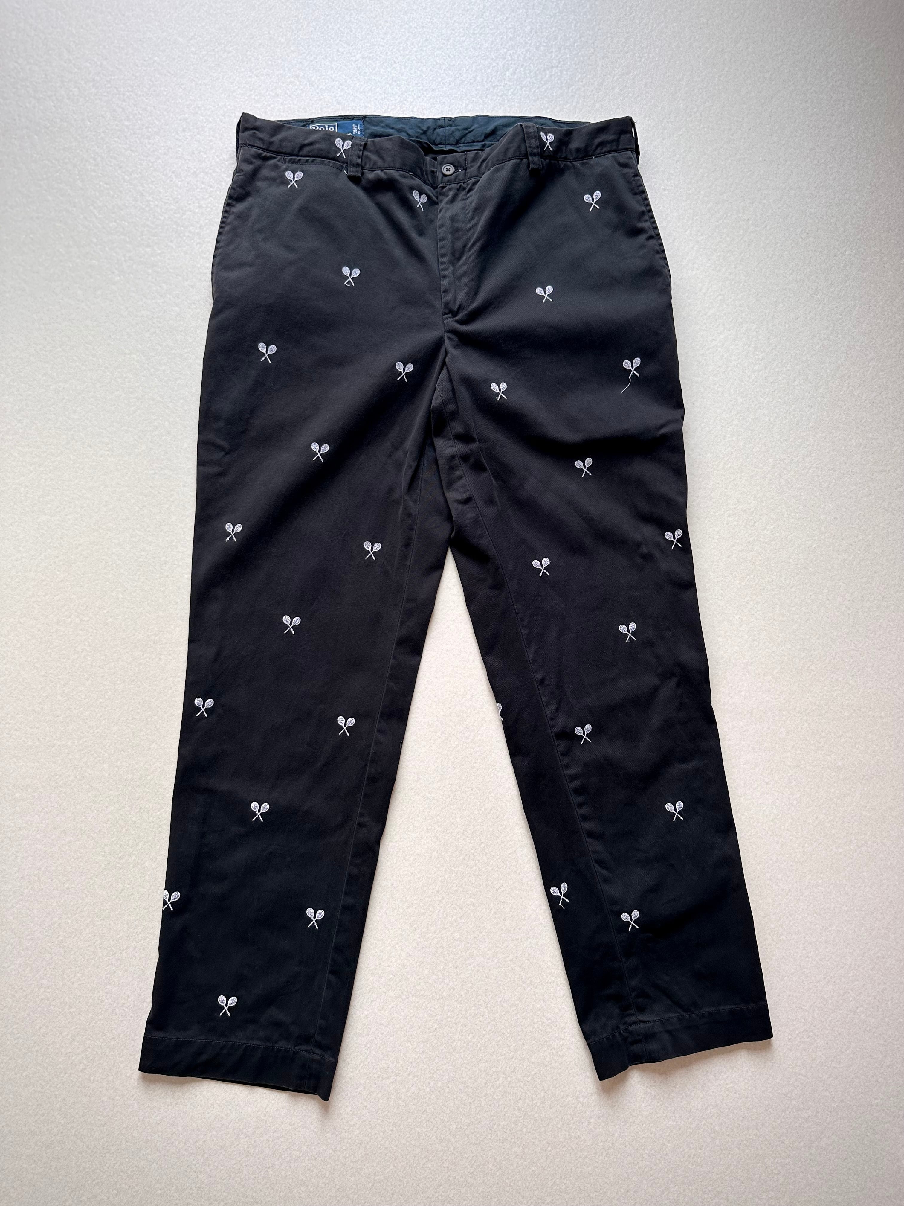 アメリカントラッドの代表的なブランド《 RALPH LAUREN 》より全体的に刺繍デザインが施された総柄ブラックチノトラウザーズ,オールドシリーズ。