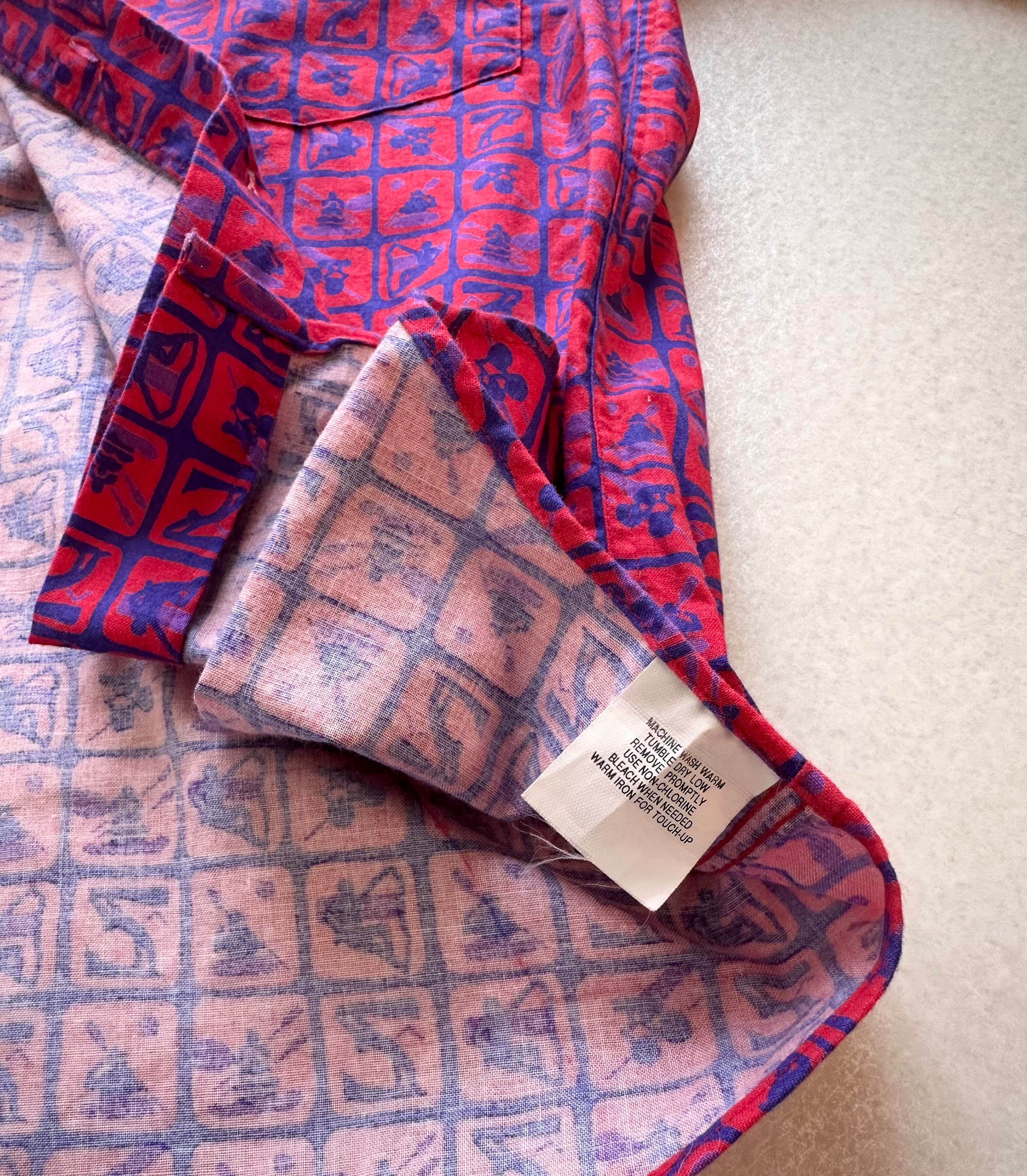 程良くゆとりのあるサイジングにサイクリングやカヌーといった様々なスポーツアクティビティーがデザインされた珍しい総柄パターン、ラズベリー系の爽やかなカラーリングもマッチしハワイアンシャツを彷彿とさせるグッドデザインな1枚です。