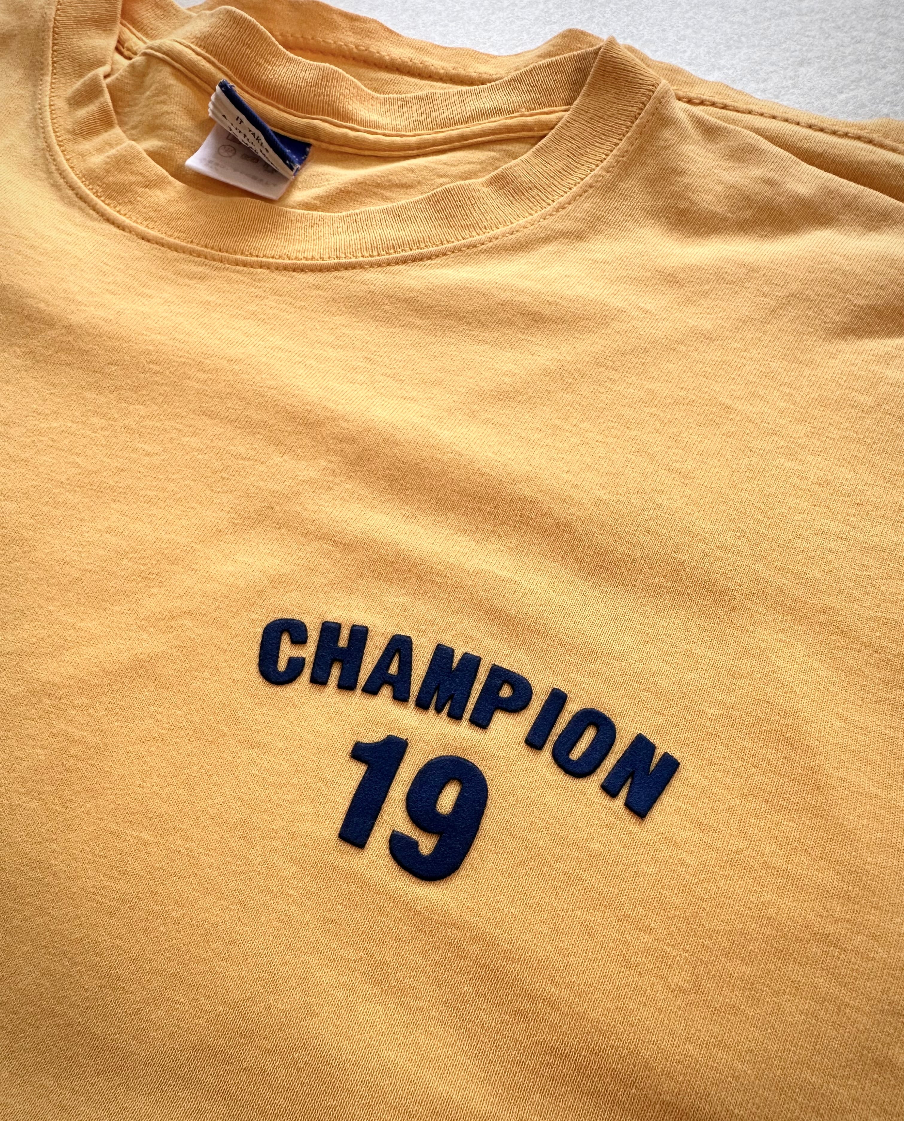 AUTHENTICシリーズと同時期のUSA製ブルータグ期、少し珍しい発泡プリントにてチャンピオンロゴ&ナンバーがデザインされたグッドなナンバリングTシャツです。
