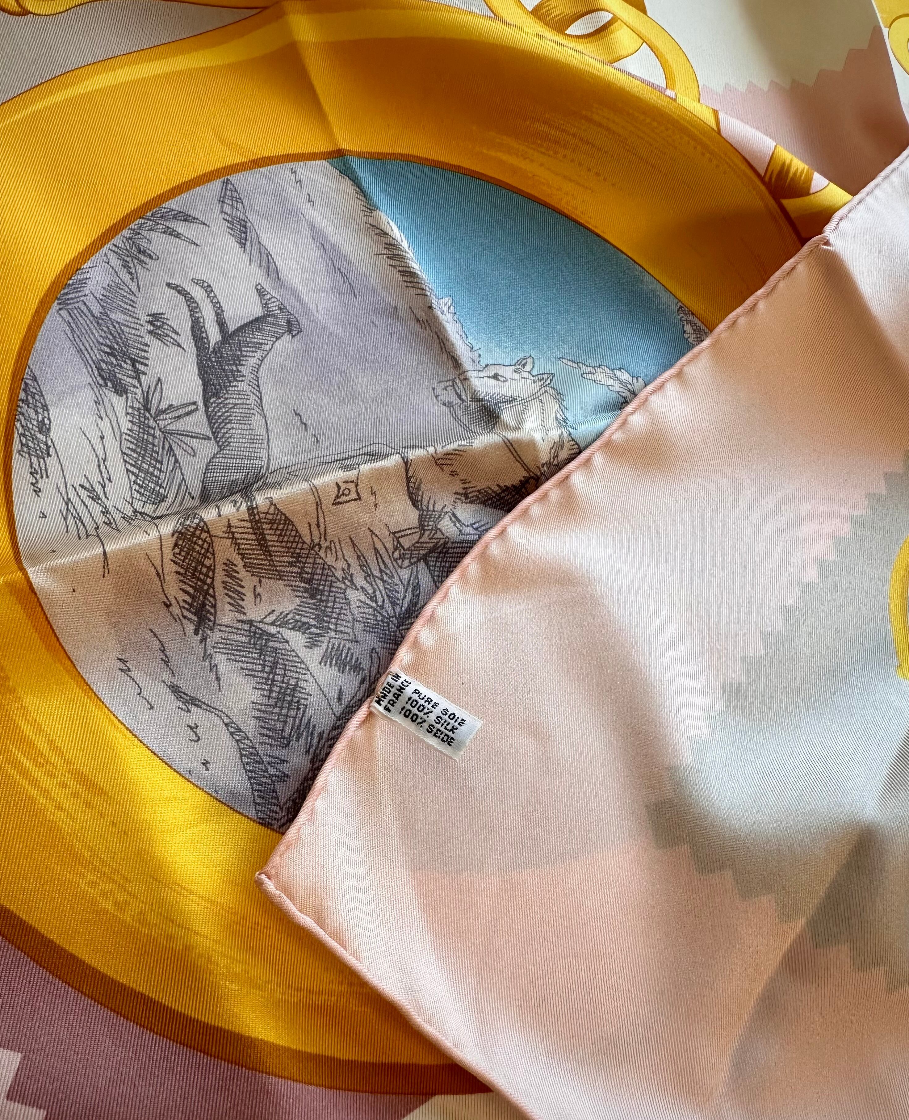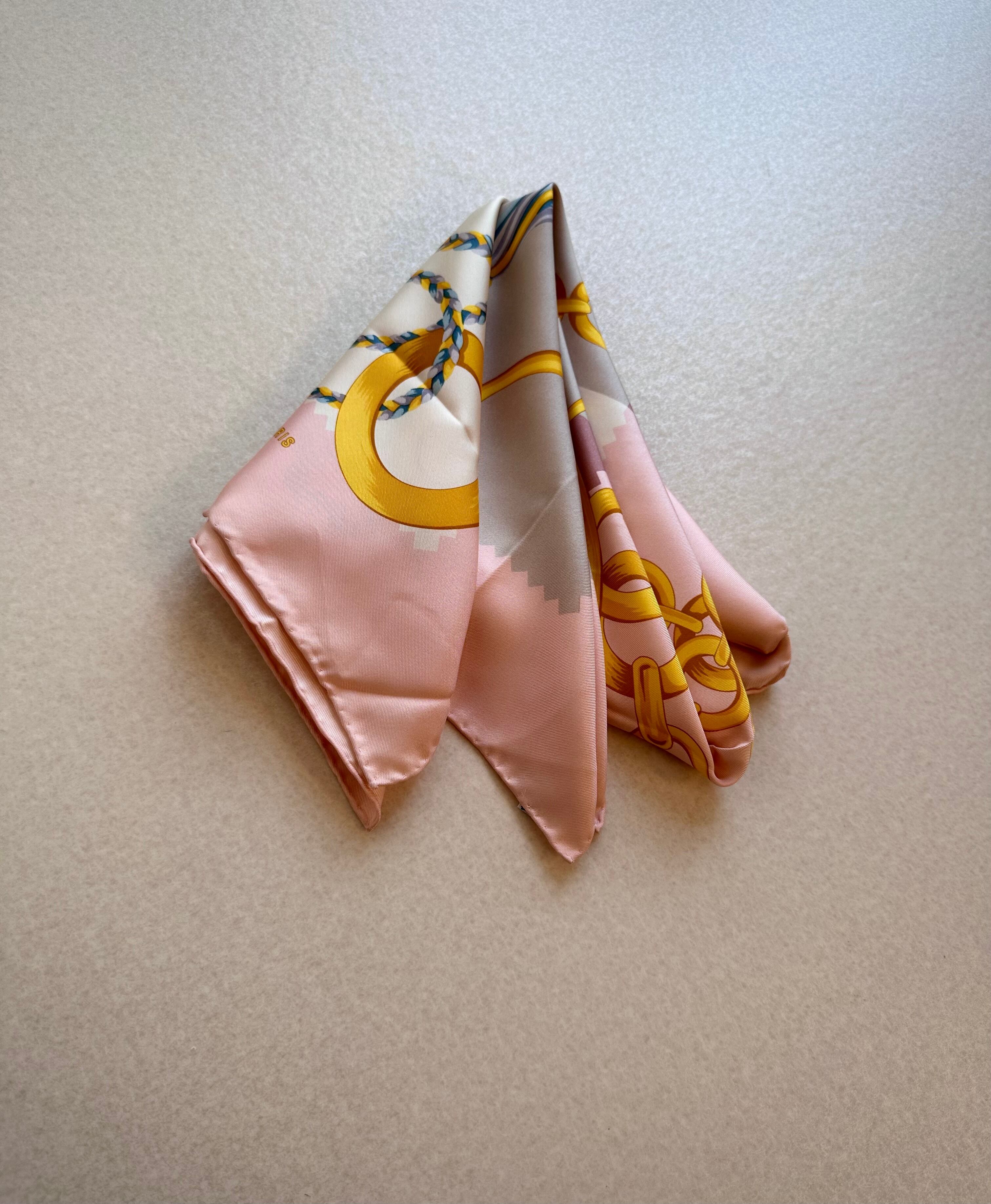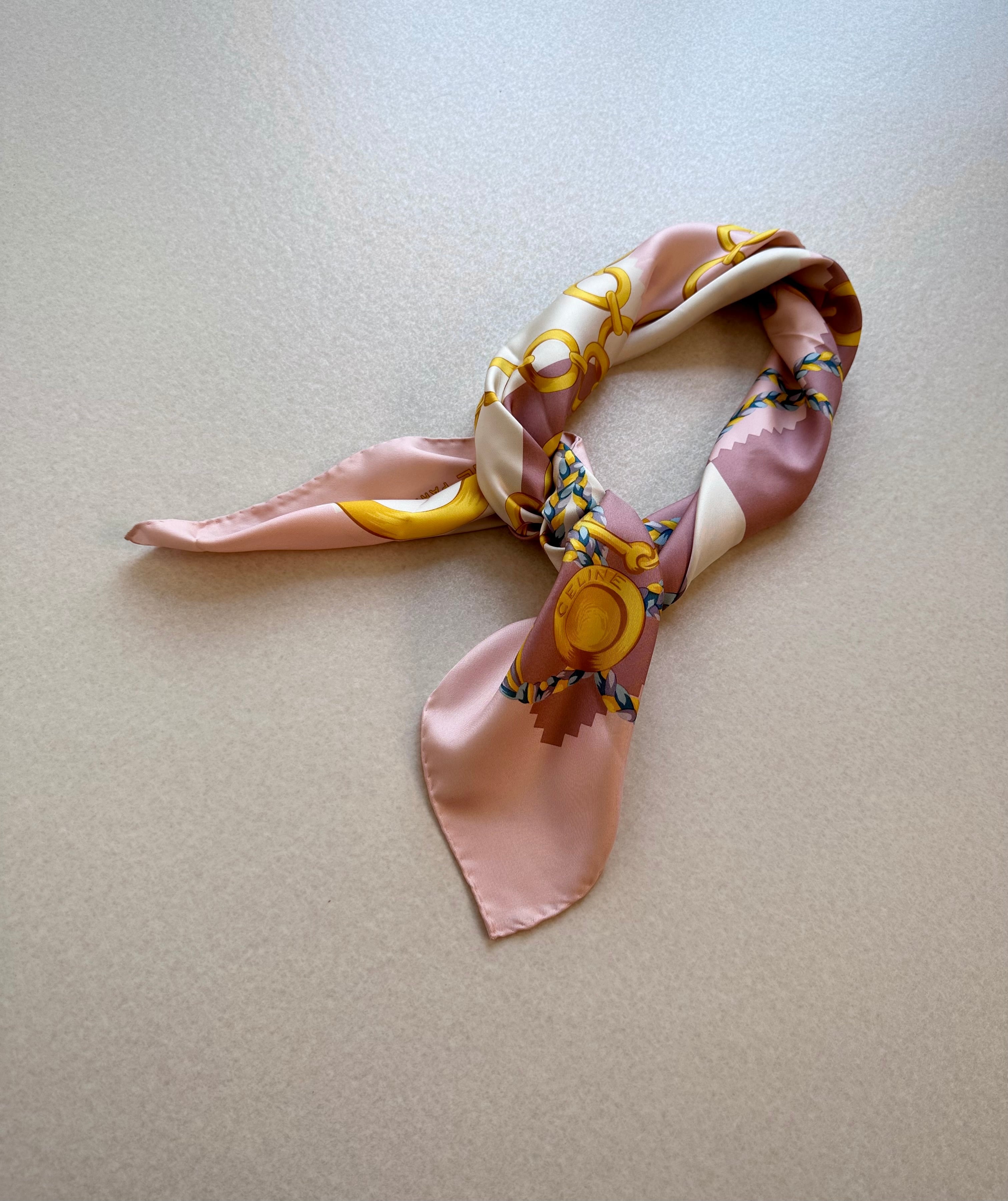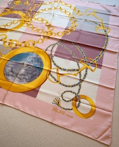程好く光沢があり柔らかく滑らかな肌触りのシルク100%生地を使用した上品な大判スカーフ、薄いピンクベースにゴールドのアクセサリーが描かれクラシックな雰囲気が魅力的となったエレガントな1枚。