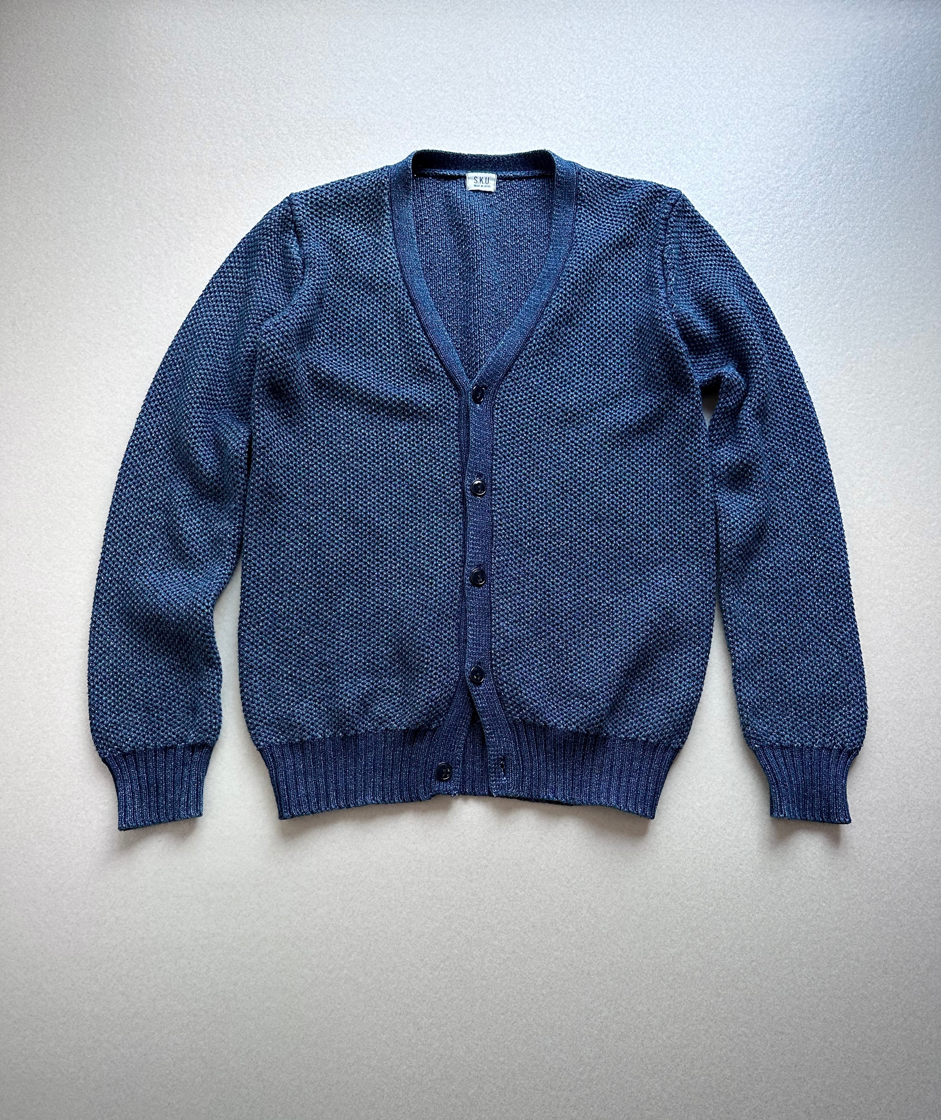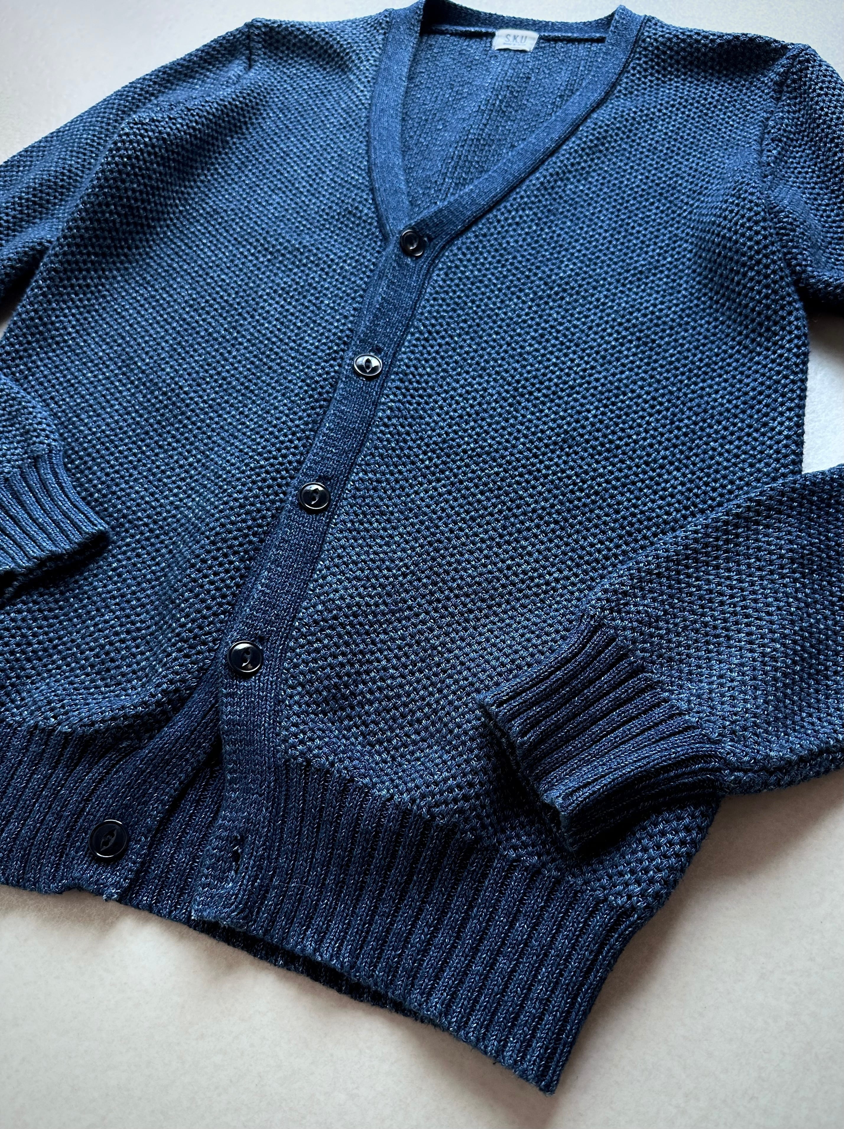 日本が誇る藍染めにて仕立てられたビンテージライクなインディゴニット、ざっくりとした少し粗めな生地に猫目ボタンを採用し程良くスタイリッシュな仕上がりとなっております。
