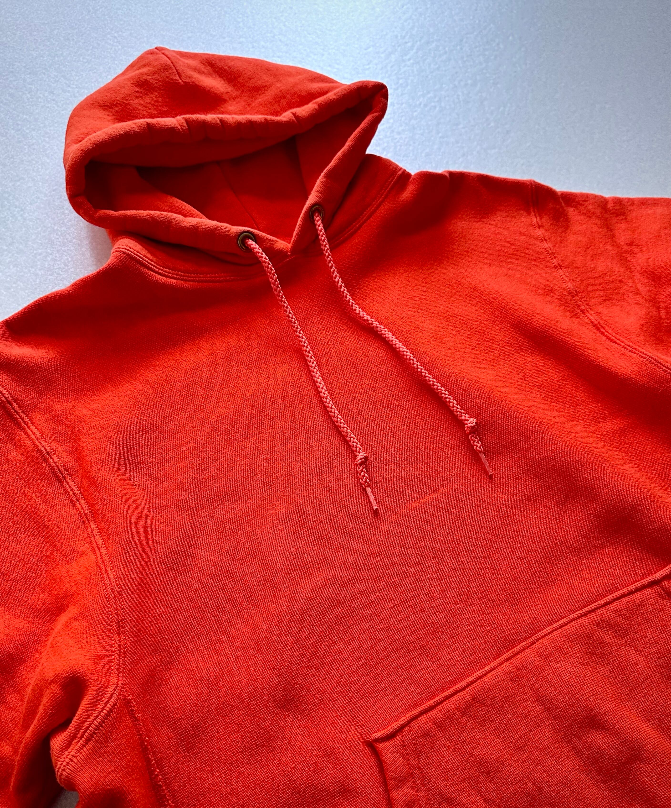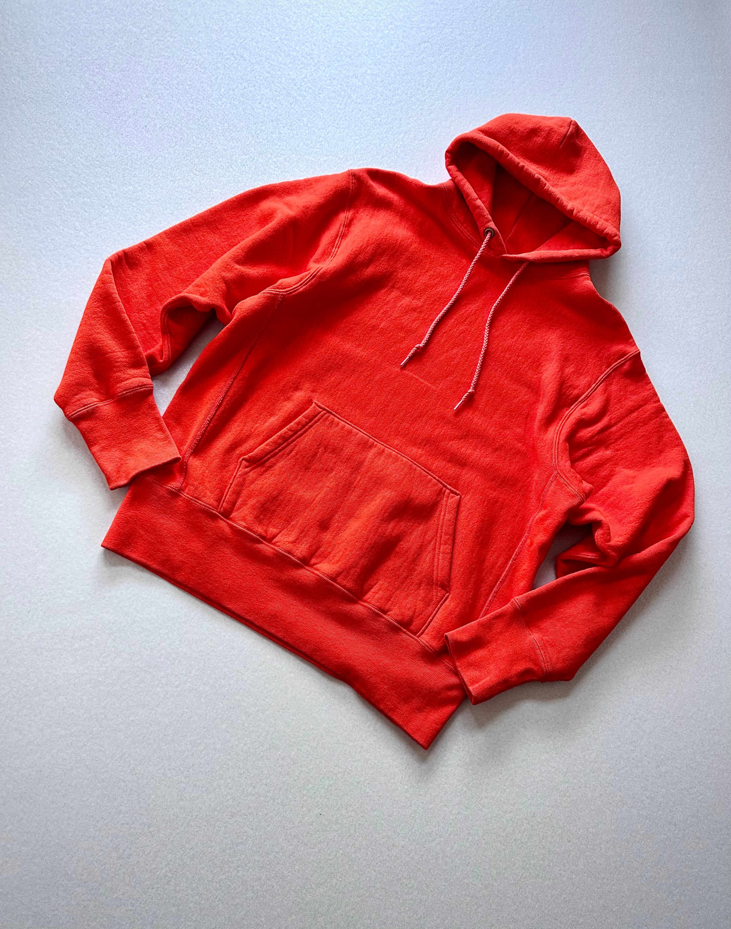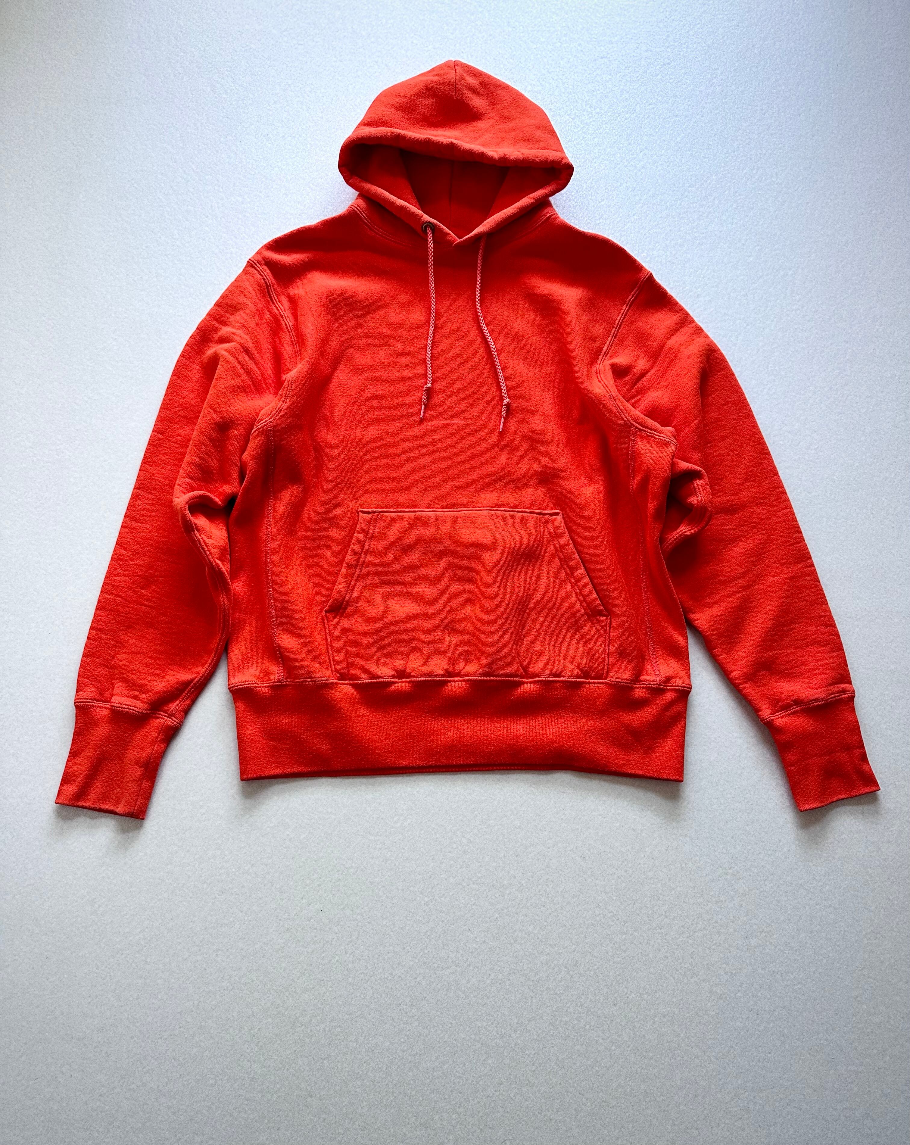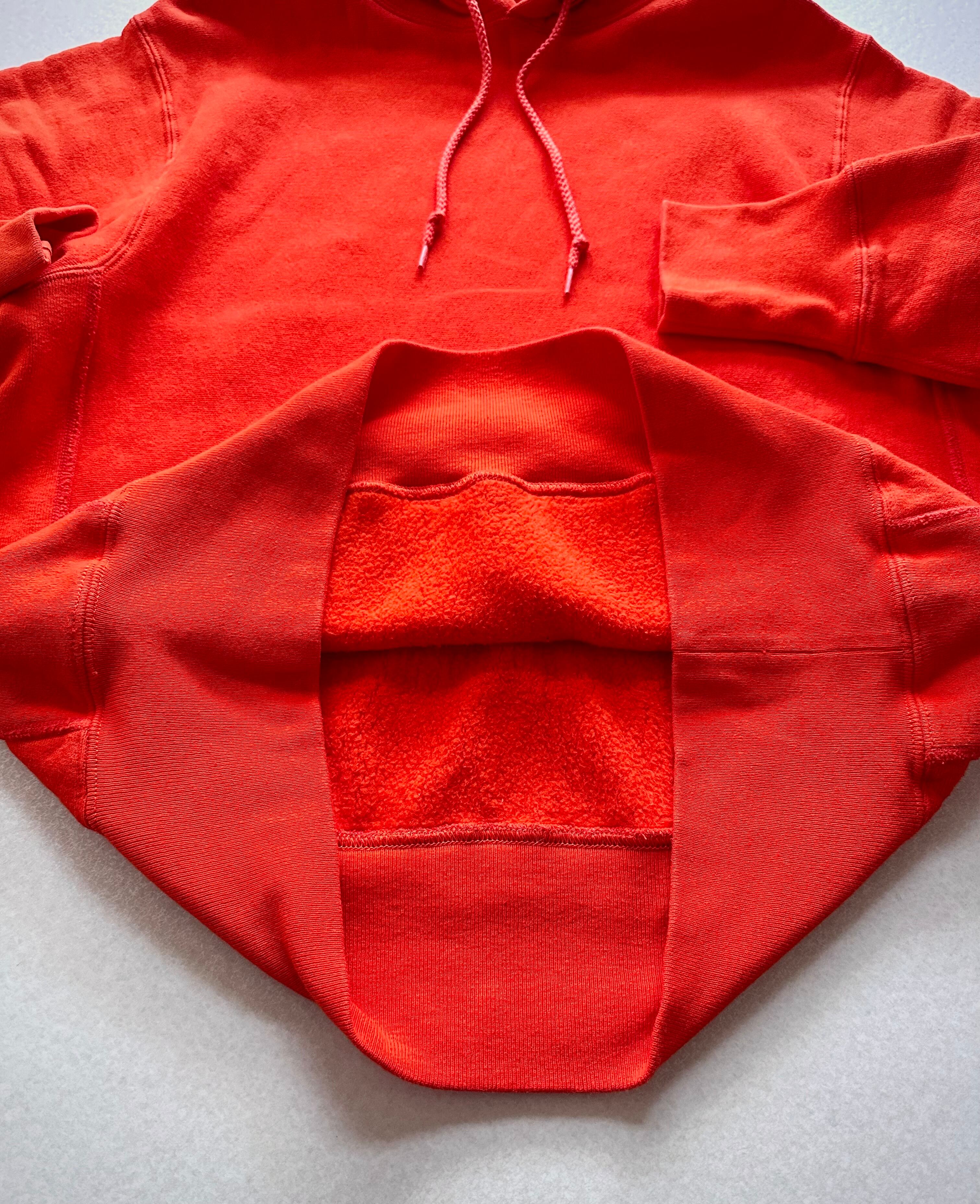 いかにもアメリカらしいしっかりとした厚みのあるHEAVY WEIGHT生地を使用した定番プルオーバーパーカー、お馴染みのサーマル張りではなくシングルの裏起毛とシンプルな印象にシリーズとしては珍しいオールコットンの風合いが魅力的な一枚。