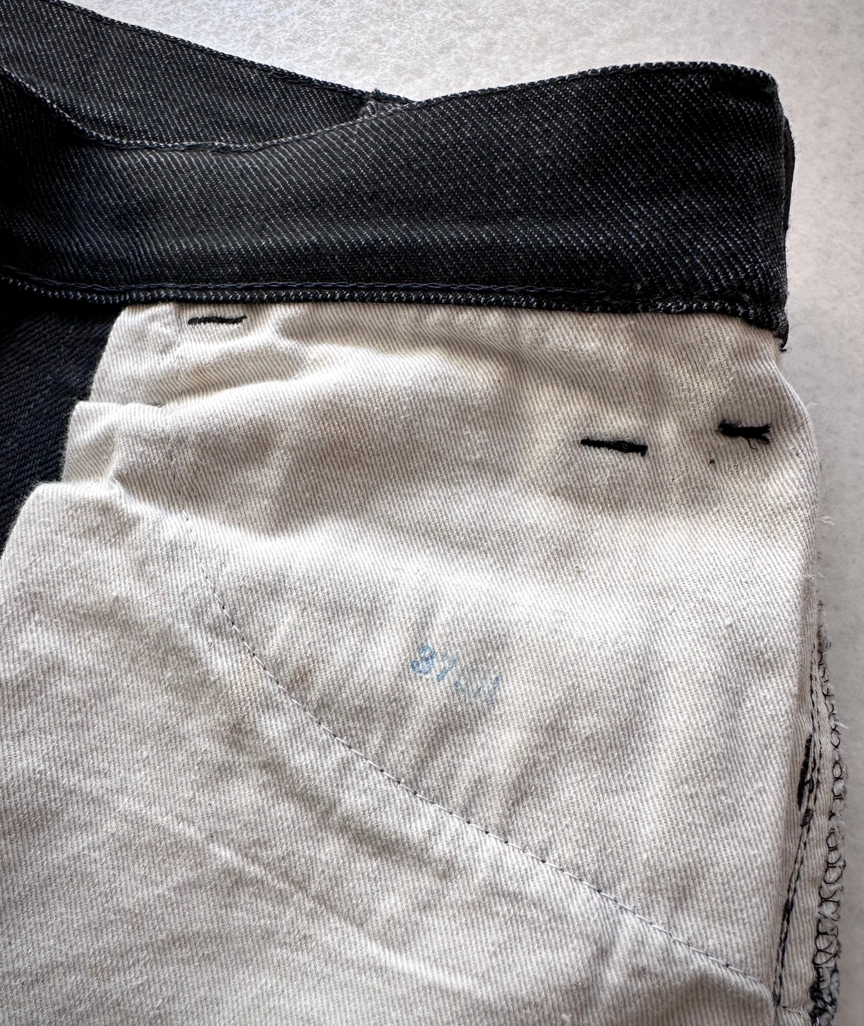 墨黒の雰囲気や伸縮性のあるストレッチ生地に縦長のバックポケット、黒金ビッグEタブに42タロンやボタン裏無刻印,スタンプ印字のコットンスレーキとポイントの高いディテール満載な当時のオリジナル。