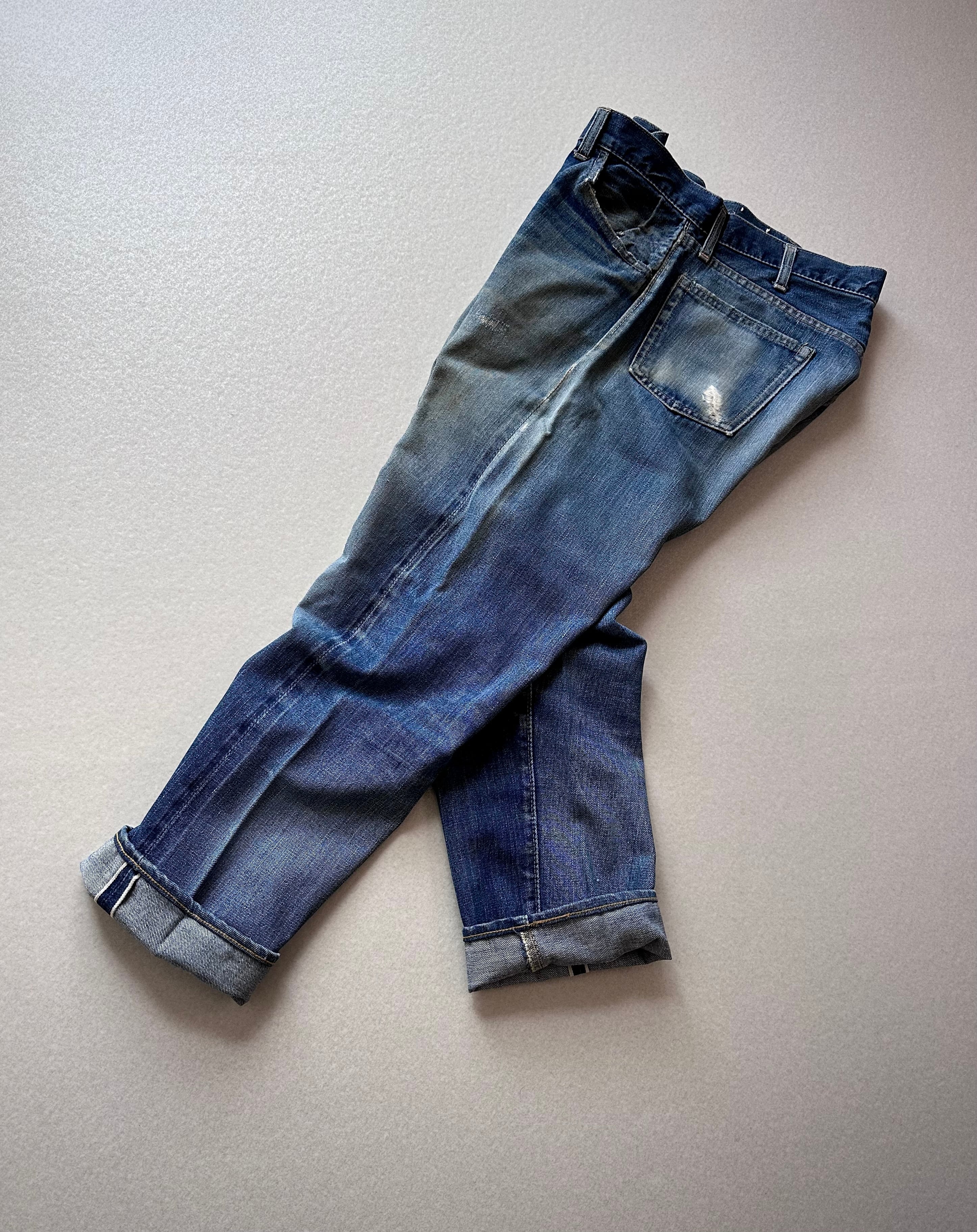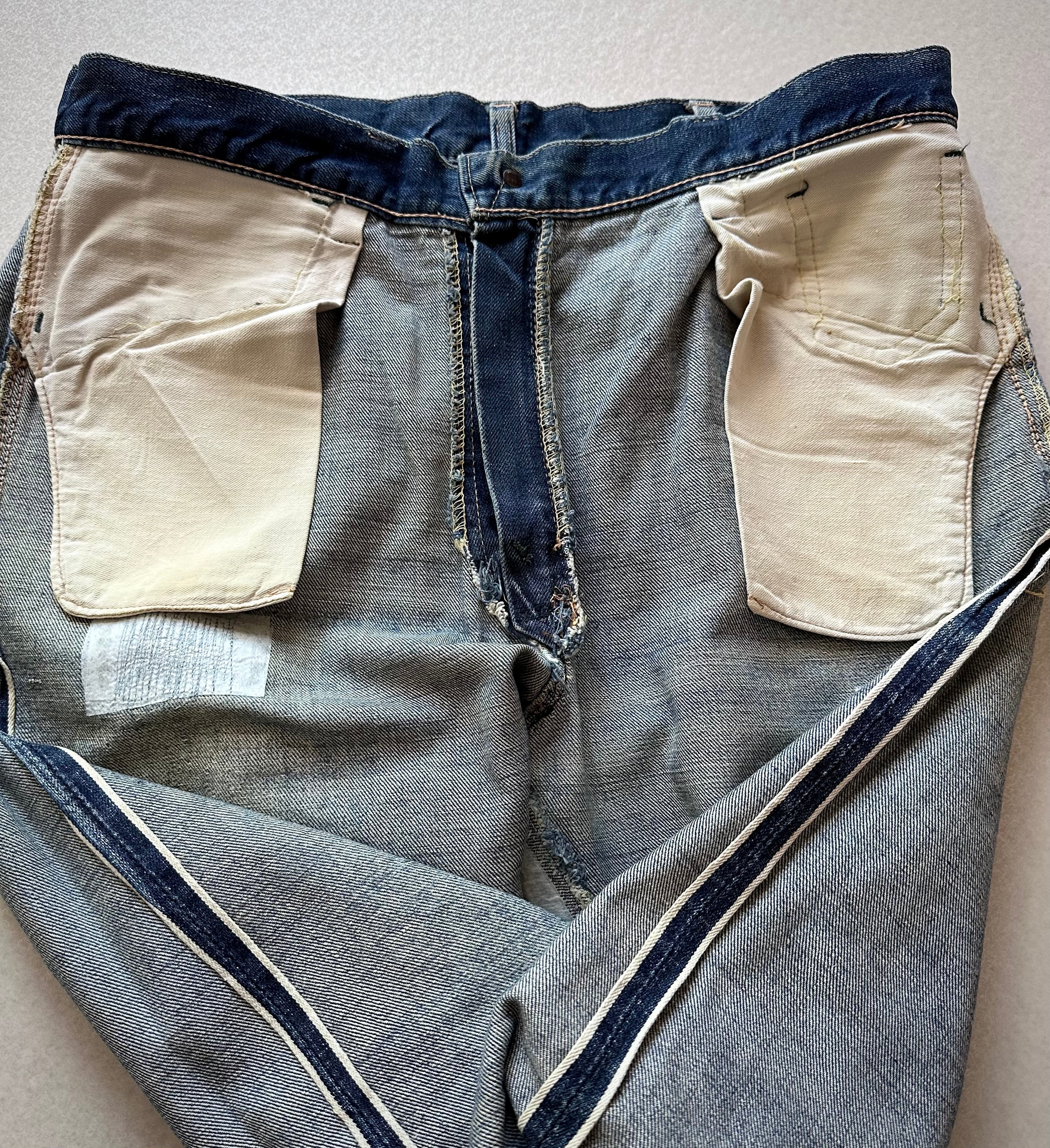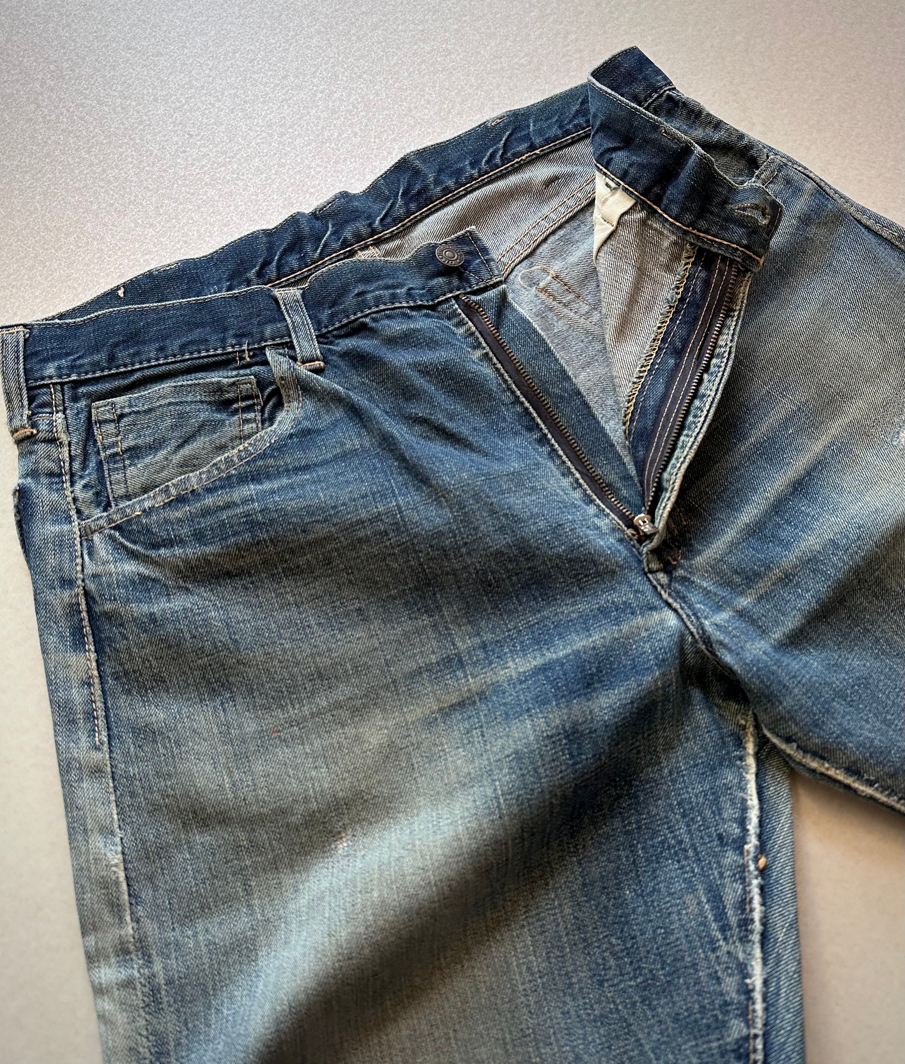 ほとんどカットされておりますが僅かに根元だけ残る黒タブにポケットの形状や多数のイエローステッチ、アルミTALONにボタン裏K刻印,サイド&コインポケットのセルビッジ,ウエストシングルにVステッチ等々とレアなディテール満載な1本です。