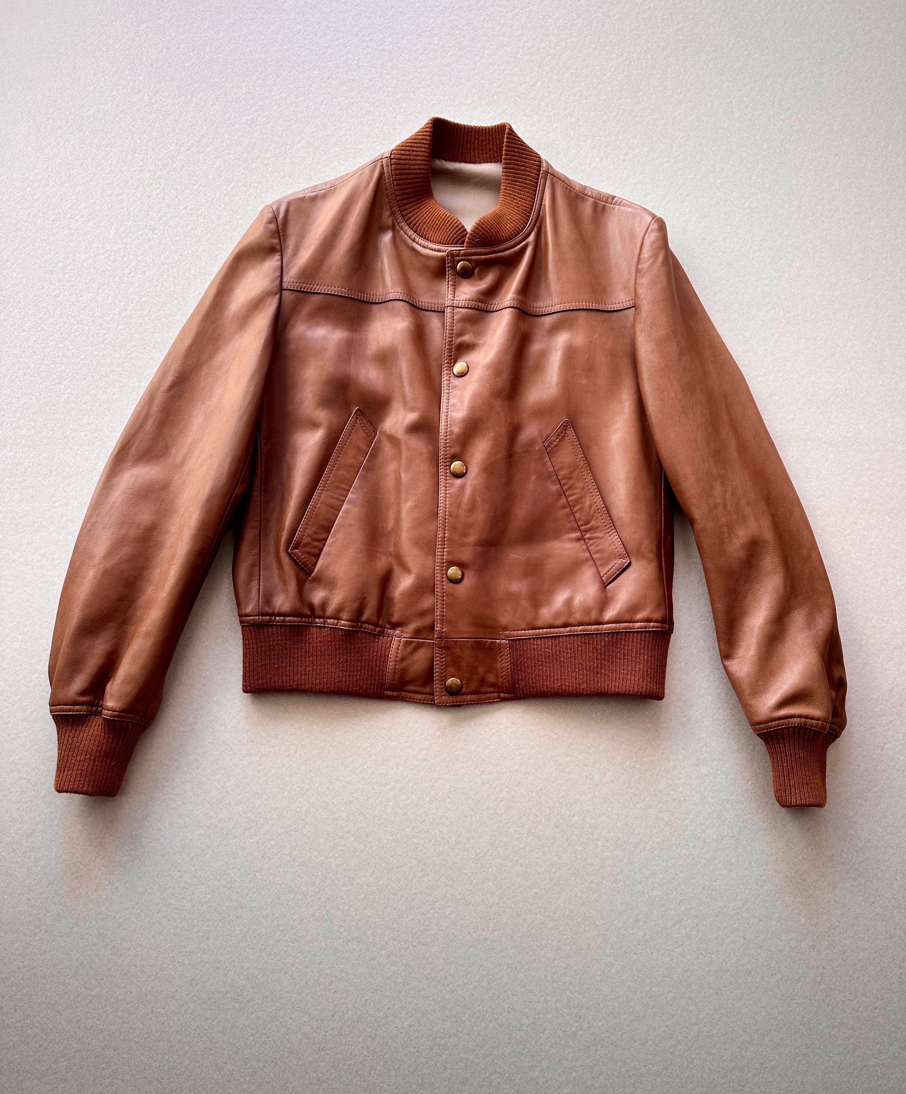 A1ジャケットを彷彿とさせるリブ付きのブルゾンタイプ、モチモチとした心地良い弾力につるつるとしたレザーの質感や落ちつきのある柔らかなブラウンカラーがマッチした極上の1枚。