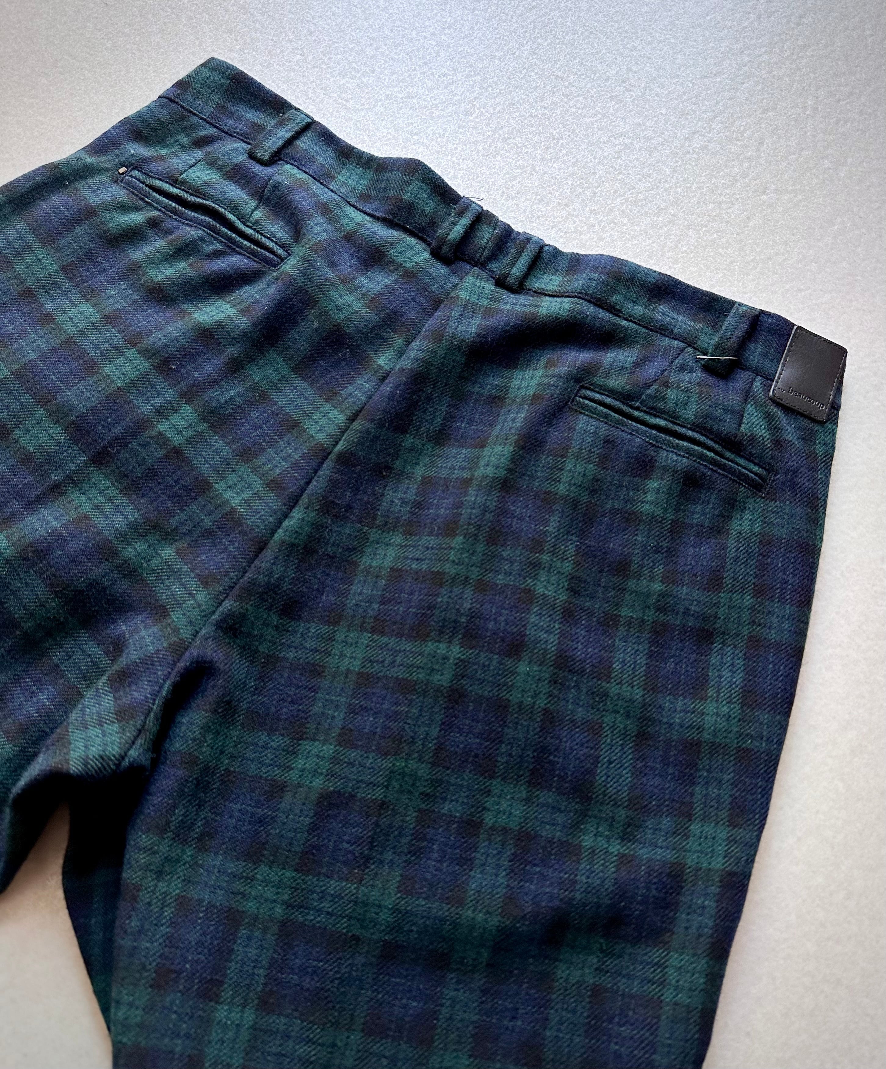 クラシックなブラックウォッチパターンを纏いゆとりのある腰回りから膝下にかけてスッキリとタイトにテーパードされたイタリアらしい上品なトラウザーズ。